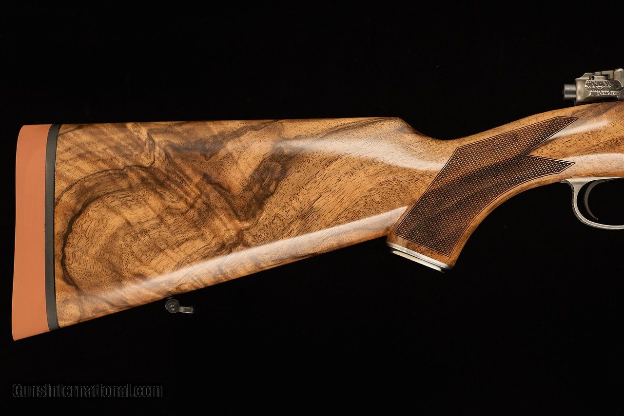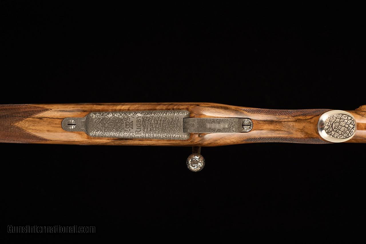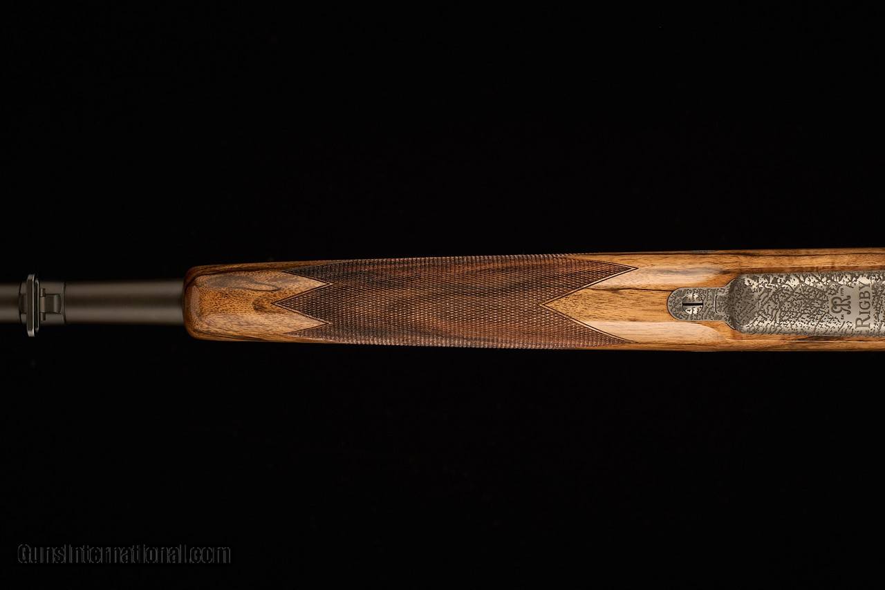 The trigger is a modern style steel unit exhibiting a very crisp pull, averaging 3.5 lbs. The safety is a svelte Winchester 70-style 3-position for perfect scope clearance. The cold hammer forged barrel bears island mounted express sights, one standing leaf and two folding leaves at rear with beaded blade at front protected by a traditional hood. Barrel band front sling mount and matching mount on toe line of stock accommodate a traditional 1” leather sling. Magazine floorplate opens with a traditional trigger guard-mounted Oberndorf release. Trigger guard bears serial number per tradition. The stock is closely modeled after original prewar Rigby sporters, and is a faithful rendition thereof. The recoil pad is traditionally red with Silvers-style rubber construction.