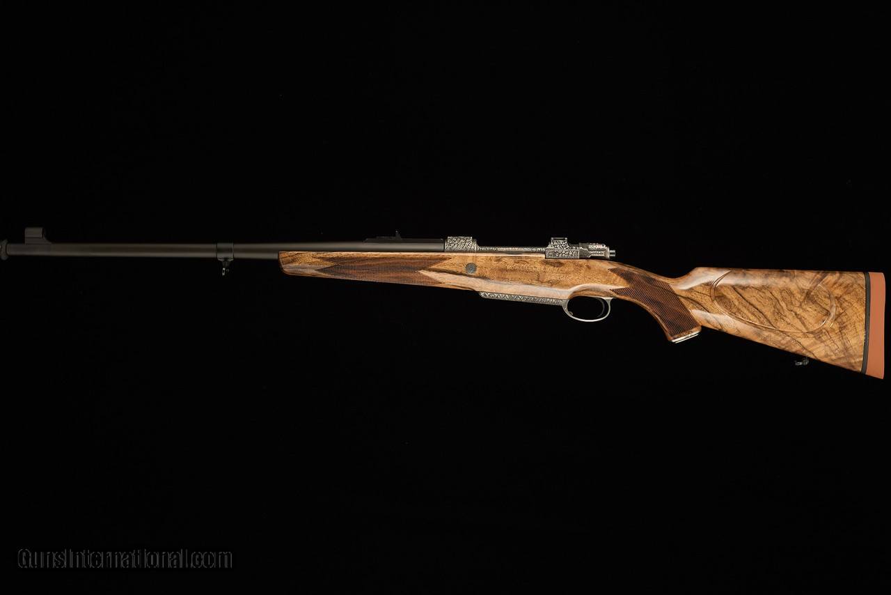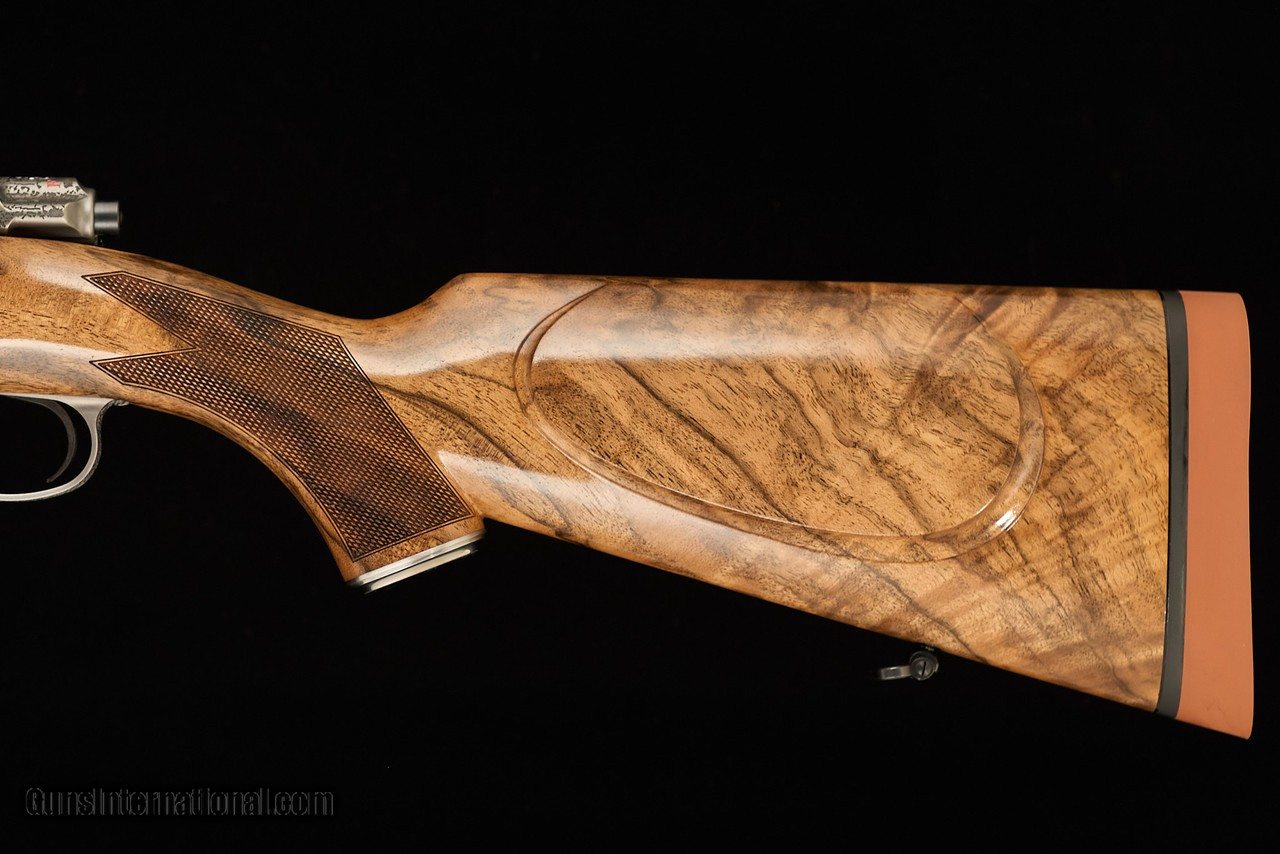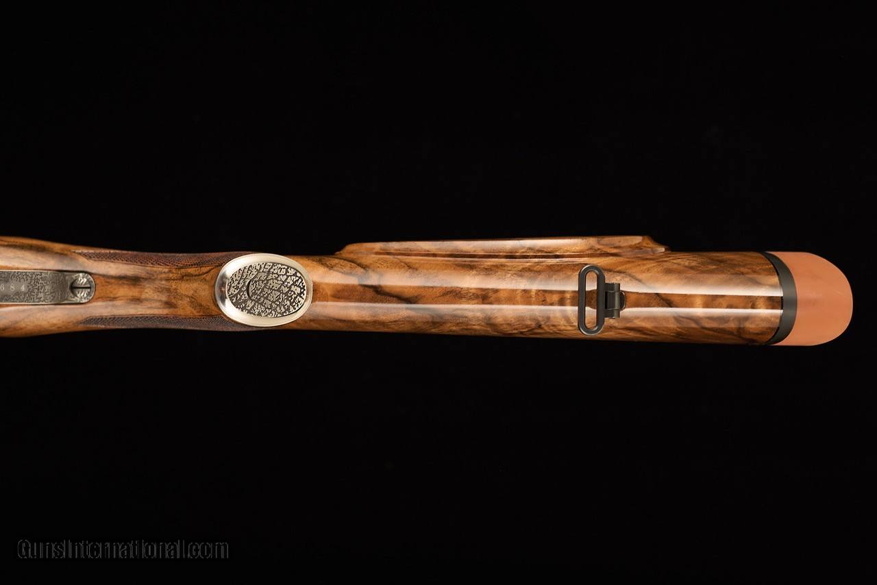 The trigger is a modern style steel unit exhibiting a very crisp pull, averaging 3.5 lbs. The safety is a svelte Winchester 70-style 3-position for perfect scope clearance. The cold hammer forged barrel bears island mounted express sights, one standing leaf and two folding leaves at rear with beaded blade at front protected by a traditional hood. Barrel band front sling mount and matching mount on toe line of stock accommodate a traditional 1” leather sling. Magazine floorplate opens with a traditional trigger guard-mounted Oberndorf release. Trigger guard bears serial number per tradition. The stock is closely modeled after original prewar Rigby sporters, and is a faithful rendition thereof. The recoil pad is traditionally red with Silvers-style rubber construction.