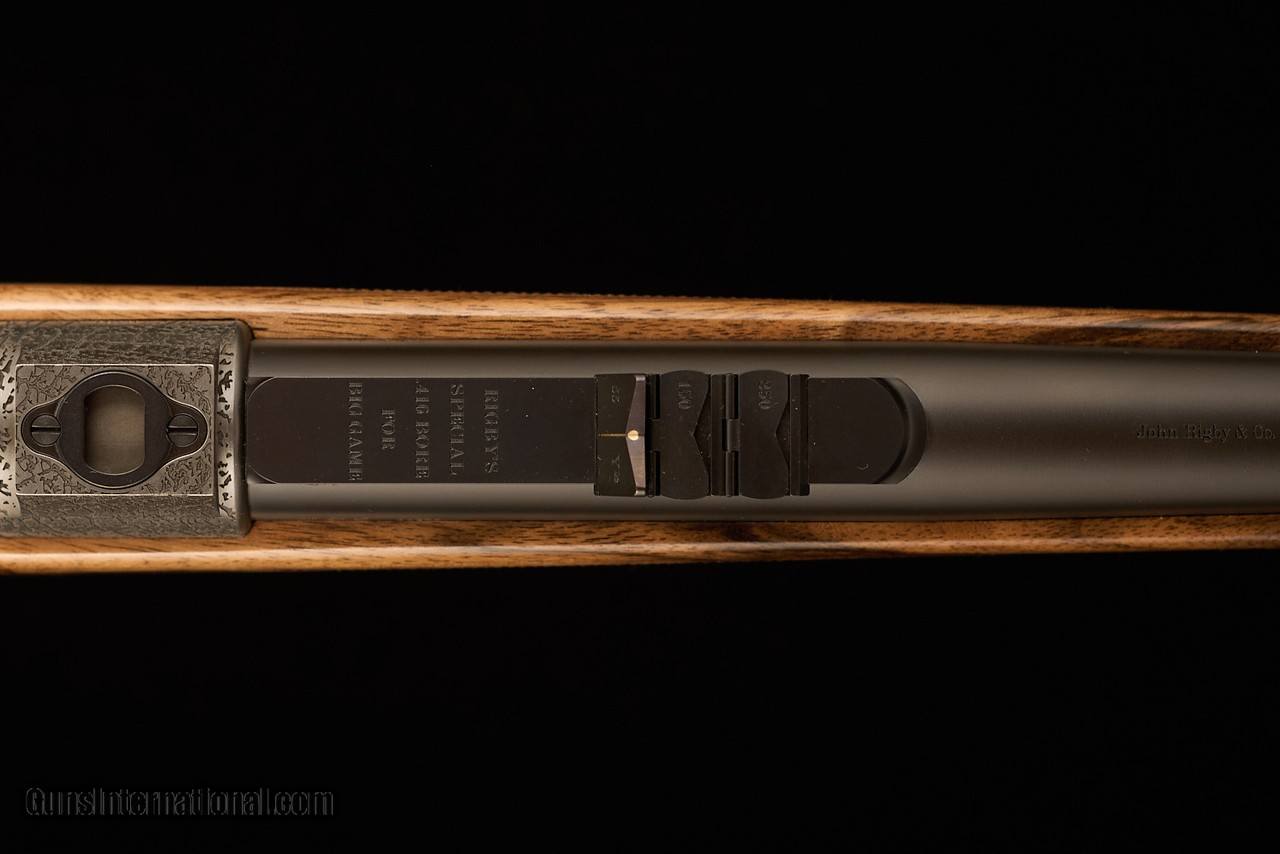 Comes complete with full length Rigby-branded soft sleeve inside factory hard case. Leather portfolio contains the factory test target and other paperwork. Upon purchase, register your new rifle with J. Rigby & Co in London to be added to the prestigious Rigby logbook!
