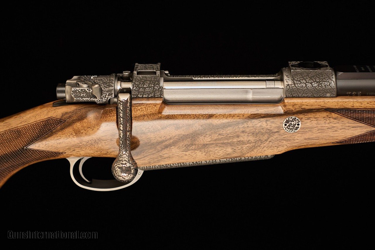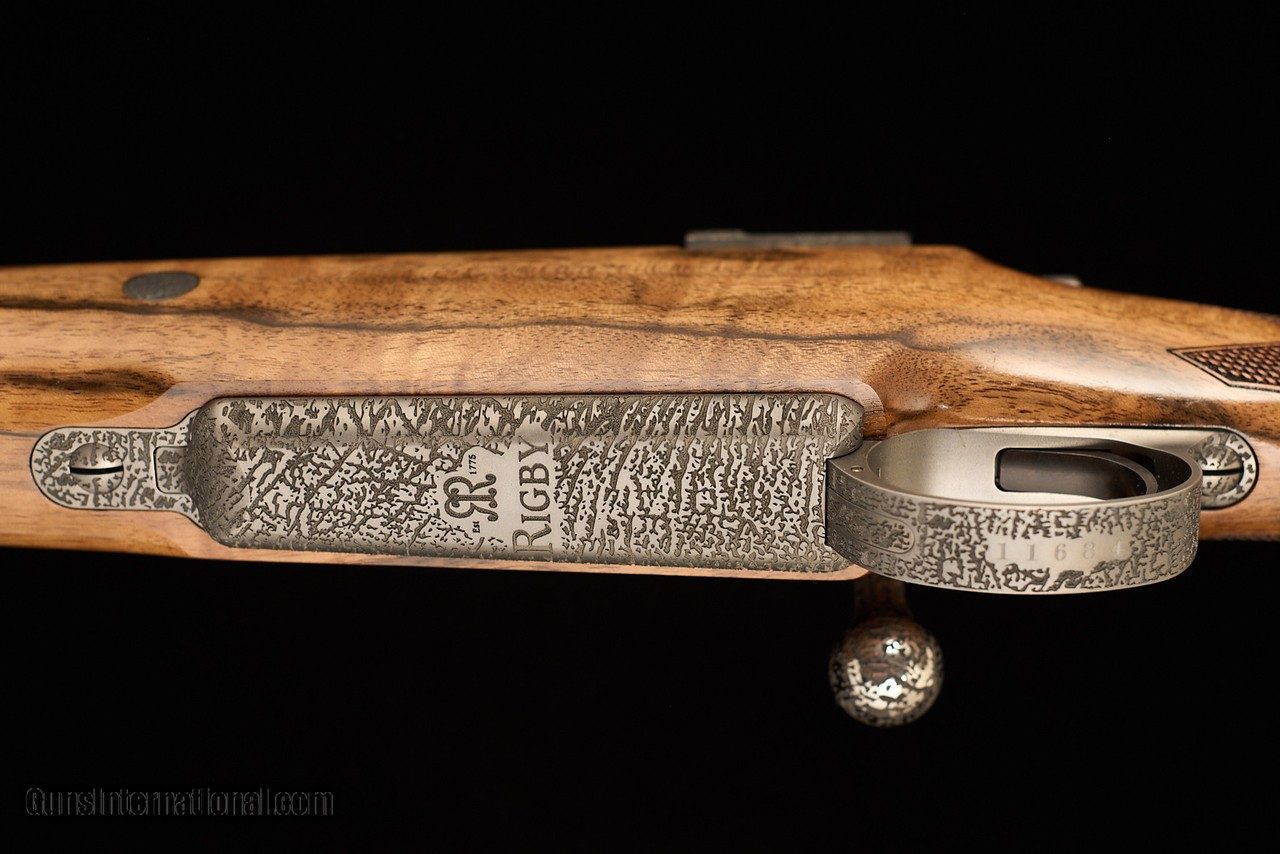 Brand new Rigby Big Game, chambered in .416 Rigby, featuring the incredibly cool elephant skin engraving pattern in full coverage across the action, bolt, and bottom metal. Wood is grade 7. The double square bridge action is compatible with Recknagle swing-off scope rings which return to zero when the is removed, for example, to enable express sight usage.
