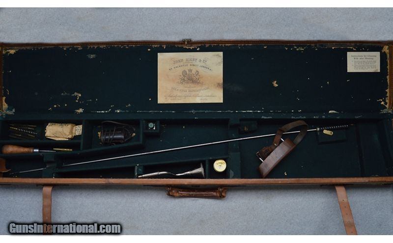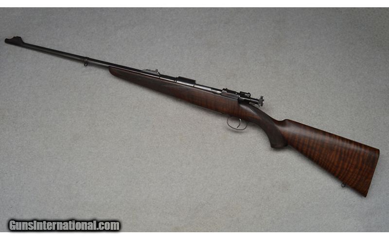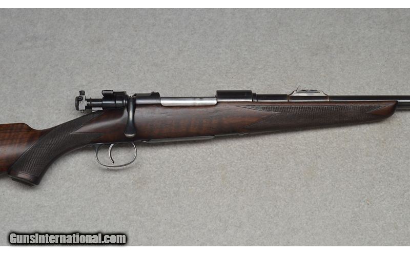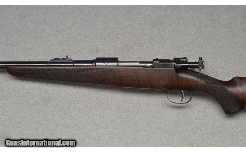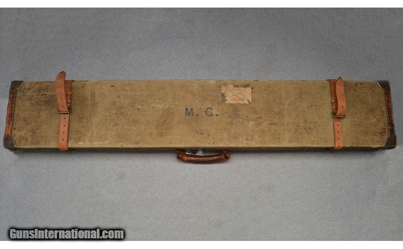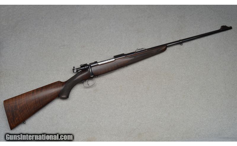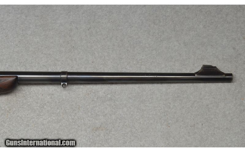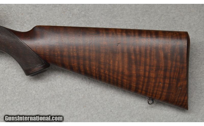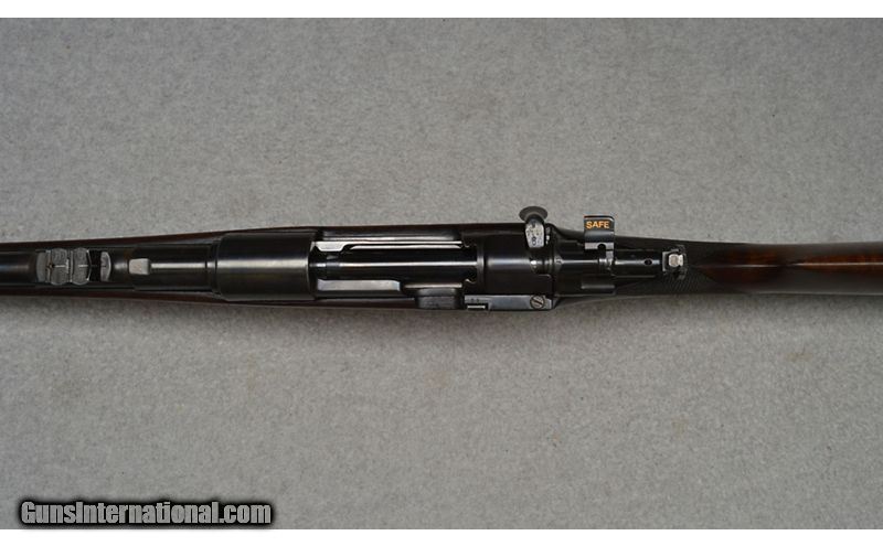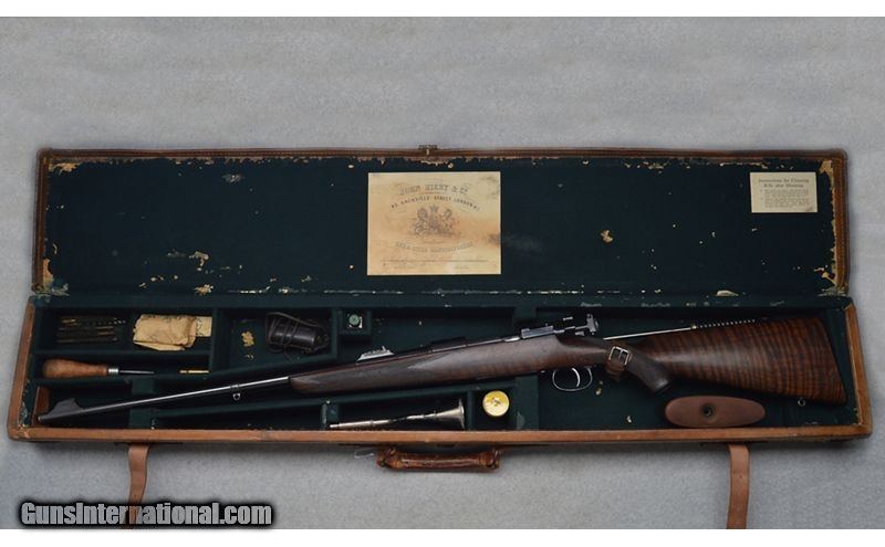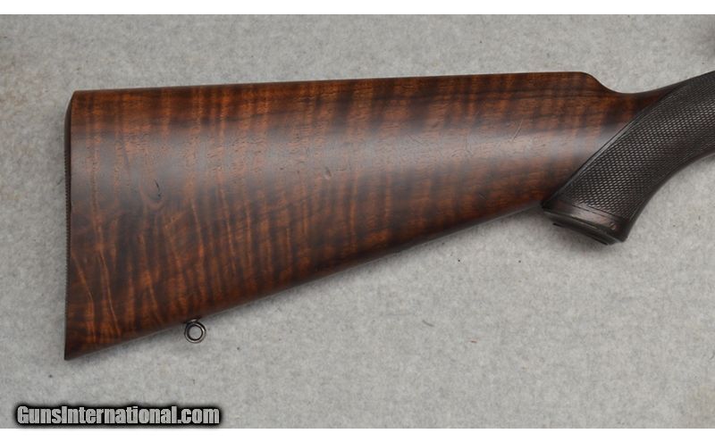 Description: Rigby Stalker .275 Rigby Rifle in great condition. This rifle features a flat handle bolt, Rigby Bolt Peep Sight, and comes with case with stock extension. Finish is on good condition with only minor fading around the edges and muzzle, and no signs of rust or pitting. Wood is a nice dark color with no cracks or any major blemishes except under the top tang. Minor handling marks and wear throughout. SN: 67112 7X57mm Mauser SOLD Metal Condition: Great Wood Condition: Great Bore Condition: "Clean, Good Rifling Barrels: 22 Triggers: Single Stock Dimensions: 14" LOP without extension Butt Pad: Etched wood with additional extension Weight: 6 lb 14 oz Sights: "Leaf sights for 100, 300, 400 Yards, and Bolt Peep Sight Item Location: Fort Worth, TX |