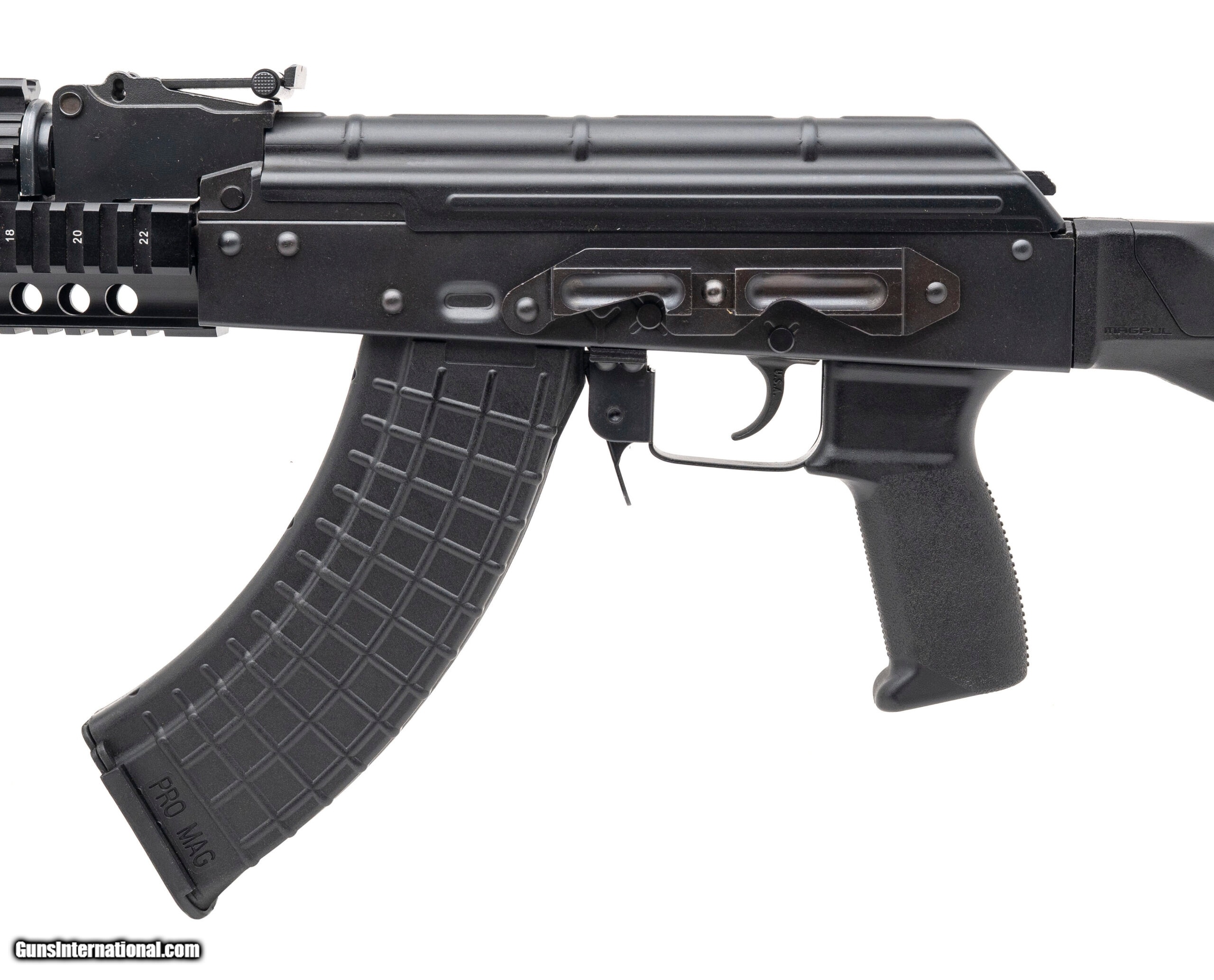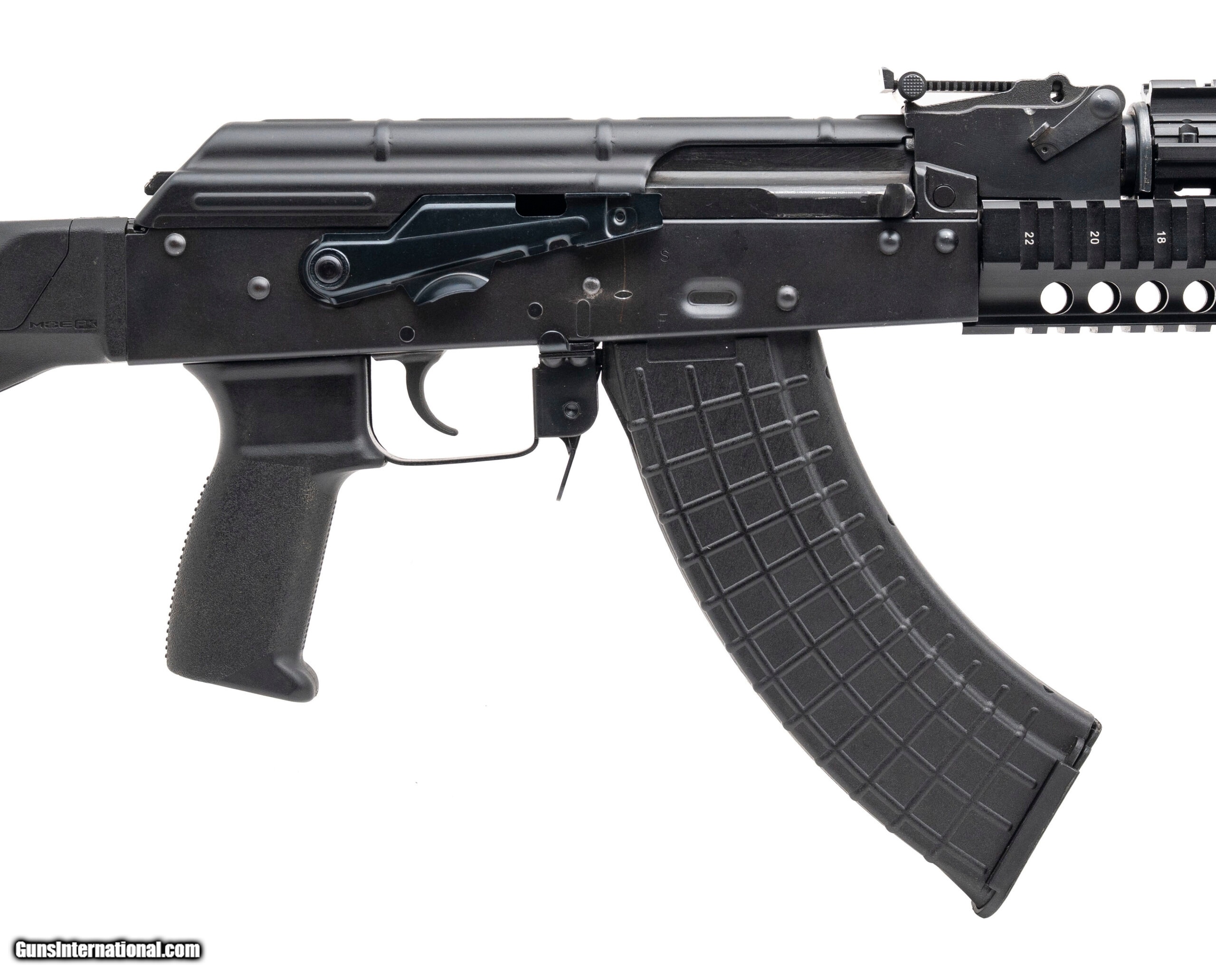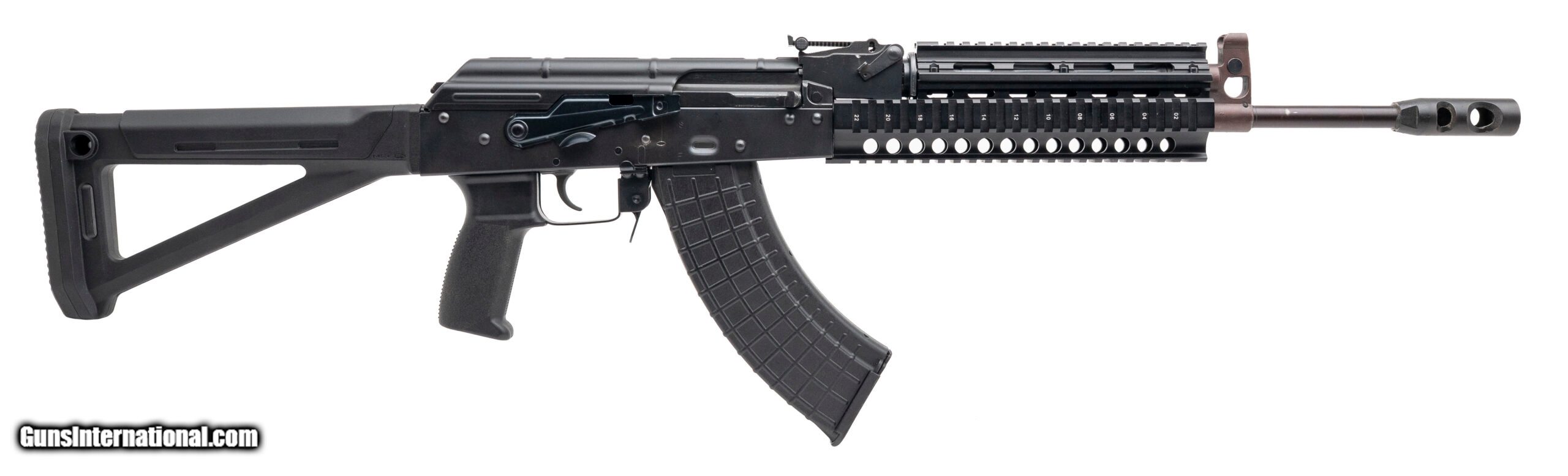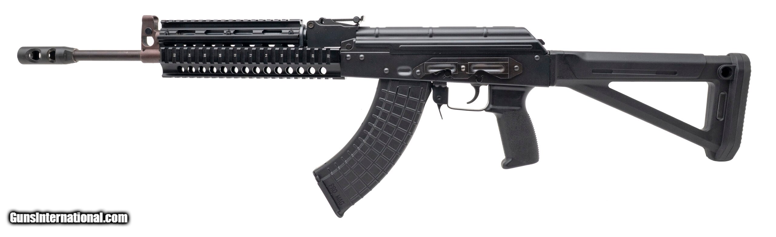 Description: "SN: B41385. Modern production, 7.62x39mm with an 16"" barrel w/muzzle brake. Bore is bright with strong rifling. Semi-auto AKM pattern rifle with a picatinny handguard, Magpul stock, and a side mount optic rail adapter. SOLD |
