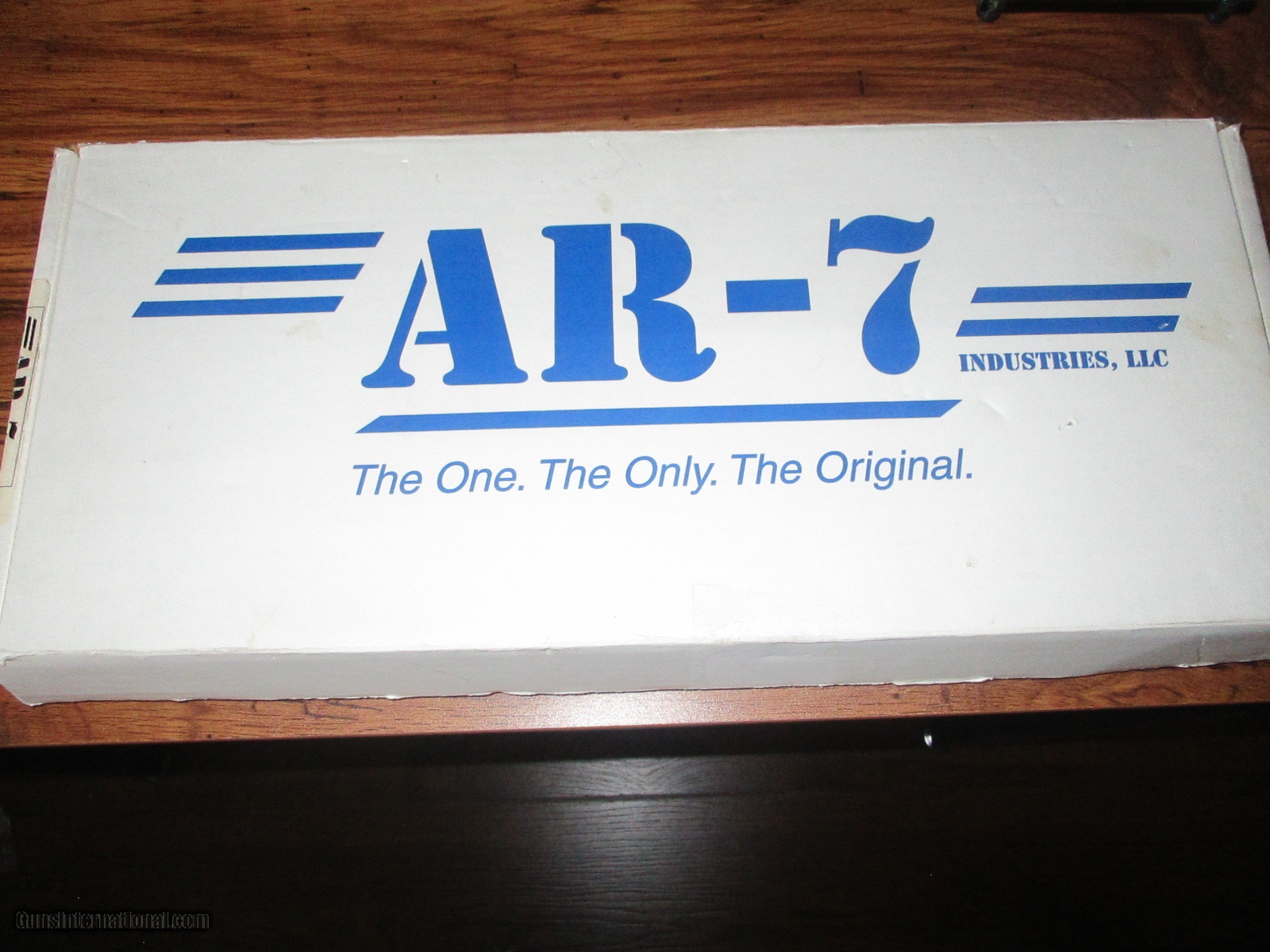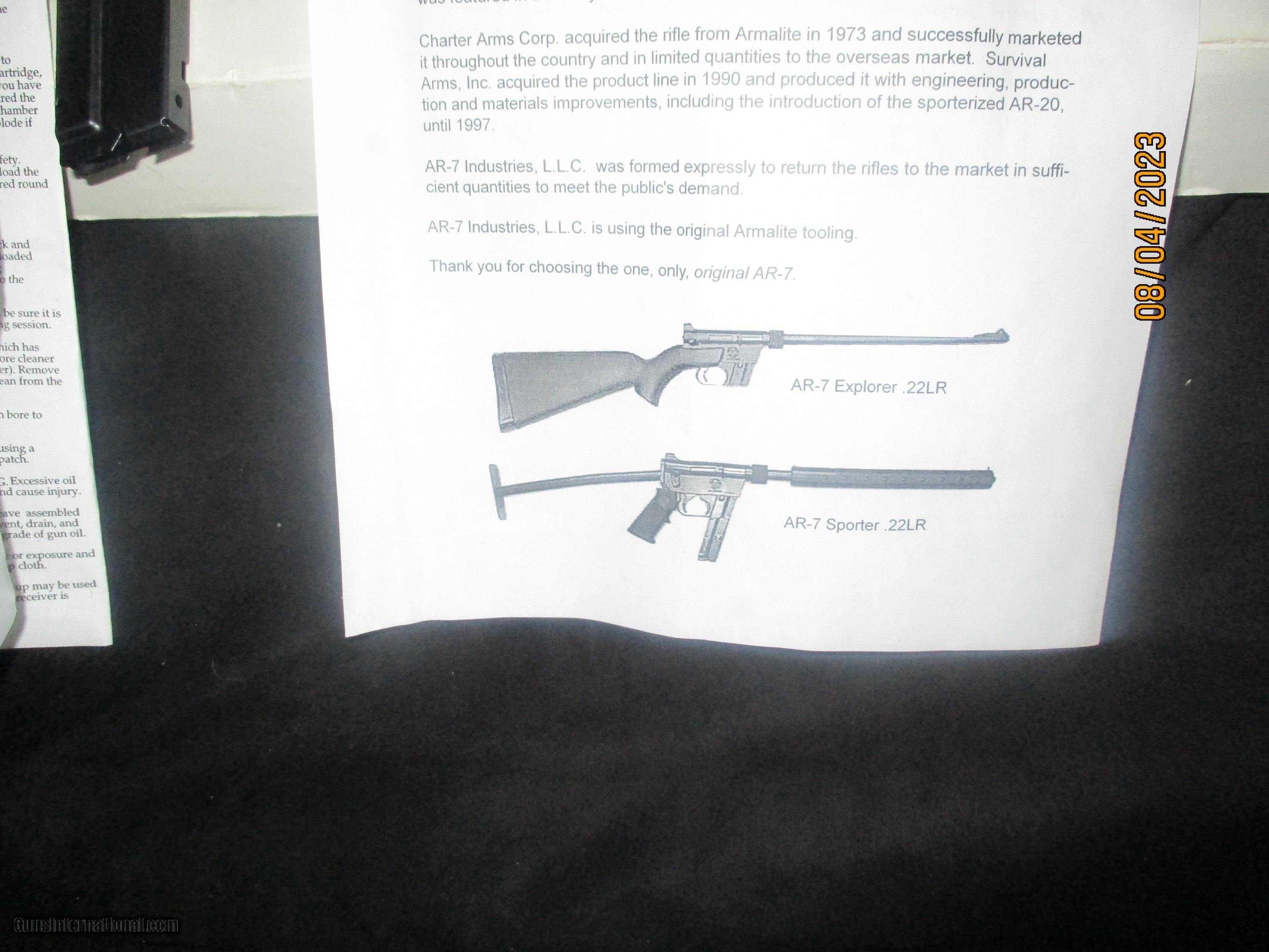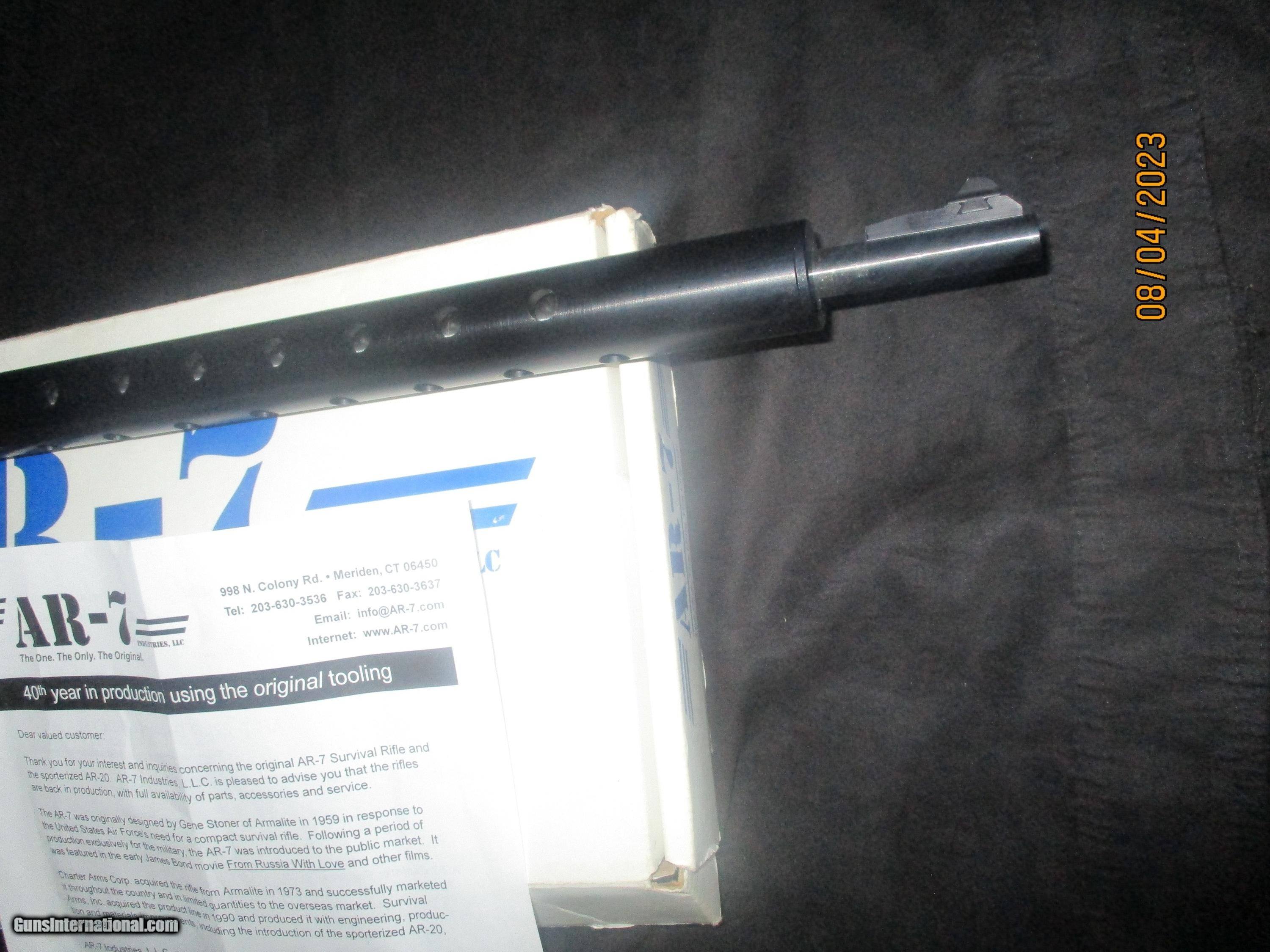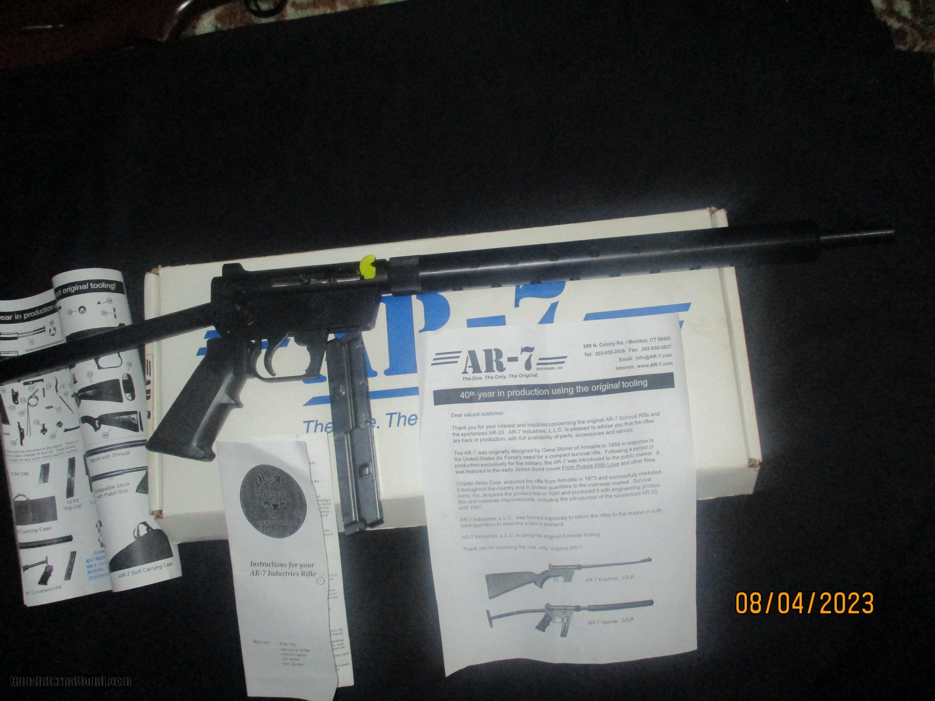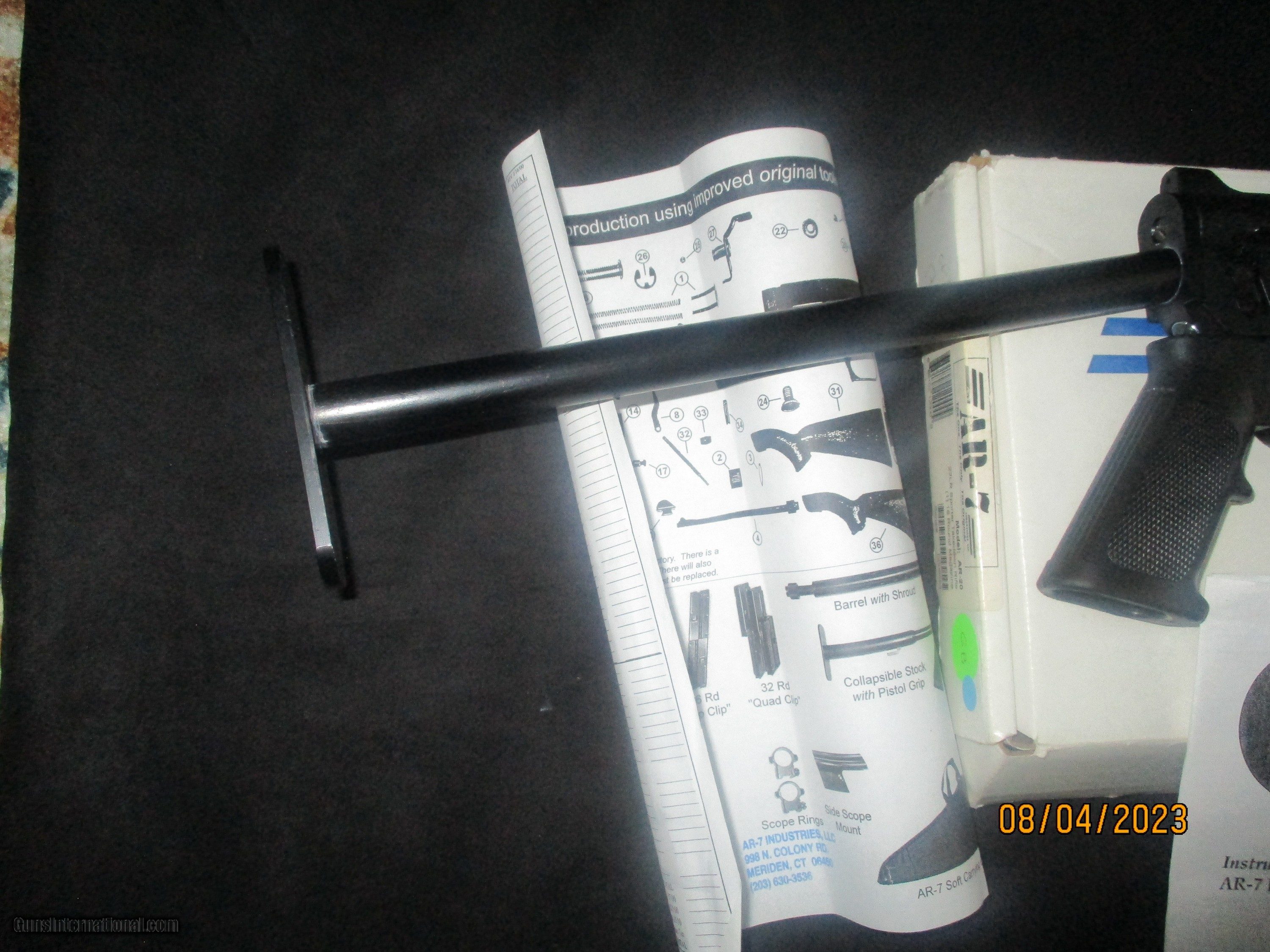 Description: 16" bbl. front vented screwon bbl. blade, rear peep hole top, receiver extended straight with dttatchable tube sholder stock, 20 shot factory inverted base to base attached 10rd. clips into a (20 rd.) clip, as new- looks unfired in box, provanance, parts list w/schmetics, manual ( This tube style vented screw on bbl., metral tube straight stock, double end reverse insert clip (20 rd.)version extremely rare, The Original AR 7 with extended steel tube stock AR 20, (shown as new carbine is all factory original) with documentation!! shipped disasembled in shown original box with extensive info., Pretty RARE!! SOLD |