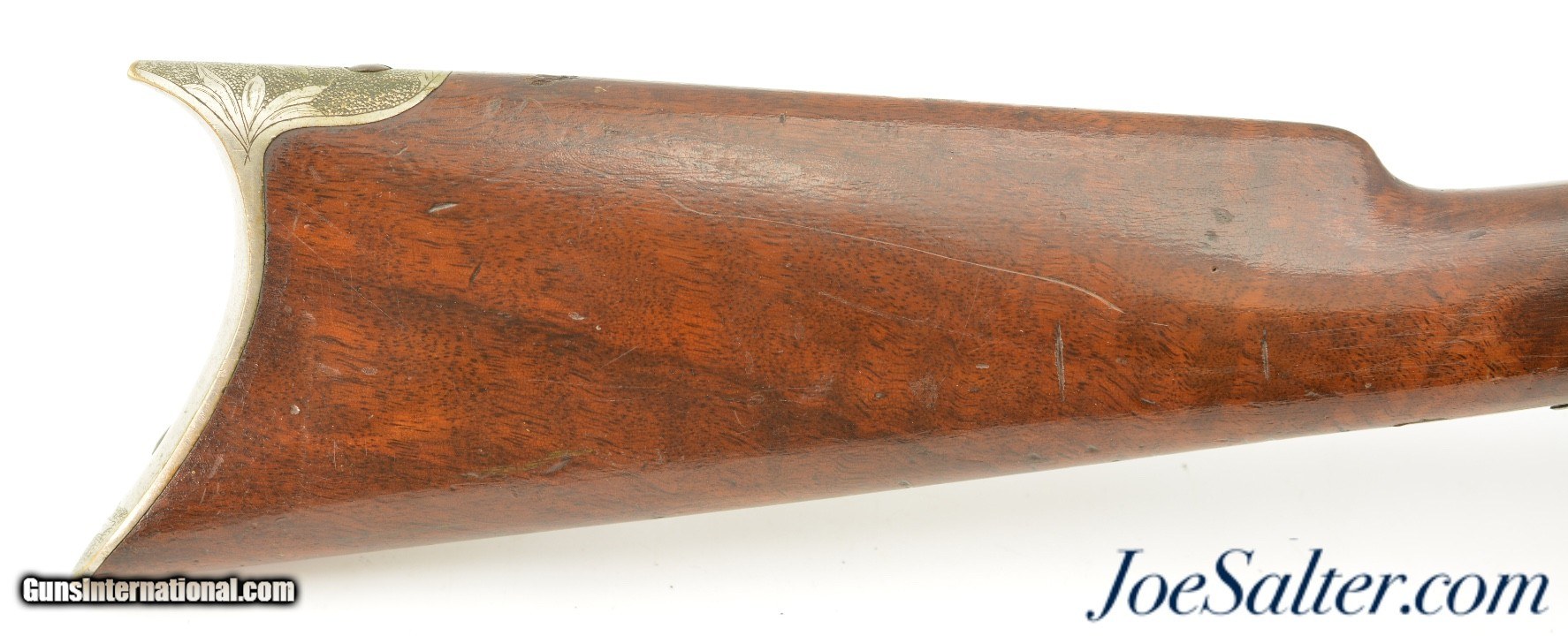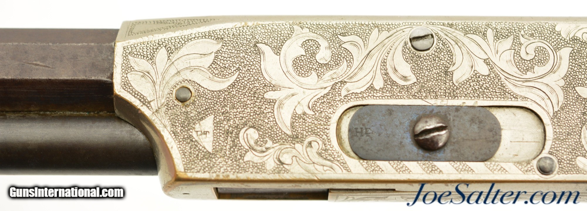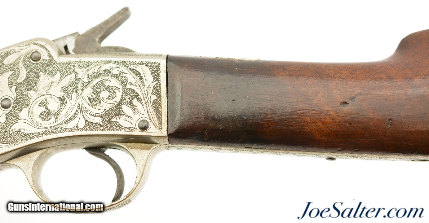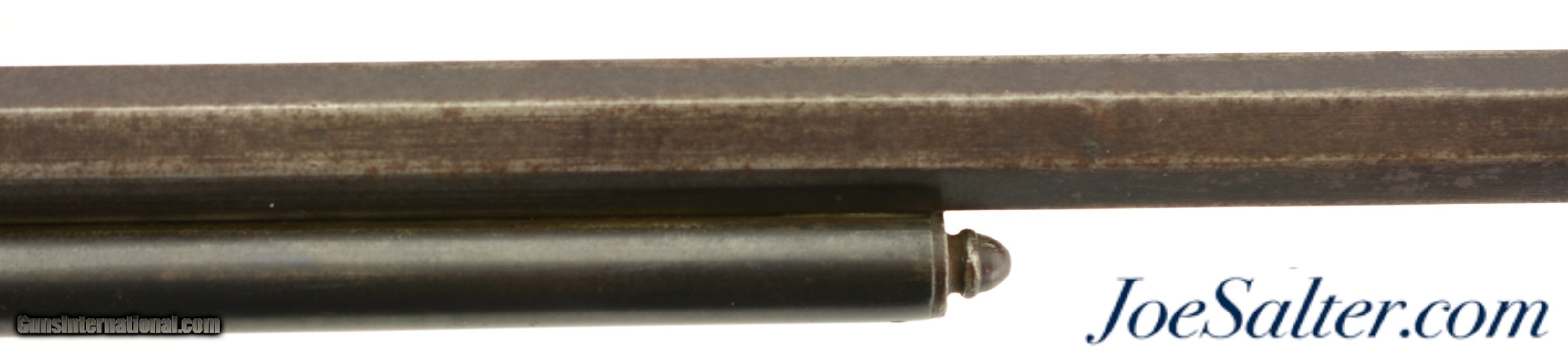Description: Serial #5, .44 RF, 25" octagon barrel with a good bore that has some spots of dark pitting within the grooves. This is a very handsome rifle, built on Orville Robinson’s April 23, 1872, patent, and utilizes a manually-operated toggle lock that rides in a mortise along the top of the receiver operated via a knurled handle on the right side. The frame has retained 85-90% of the original nickel plated finish, with flaking to the underlying brass along the edges and projections, most noticeably on the underside of the frame ahead of the trigger guard bow. The frame has a lovely full-coverage floral scrollwork motif with punch-dot background, geometric patterns on the lower tang, and a deer head on the top flat at the breech. A large rectangular panel is present on the right side just above the early, spring steel, Winchester type loading gate that reads "John A. Macdonald" in flowing script. Unlike every other known example of the Model 1872, the barrel of this rifle is not secured by a transverse pin, but rather by a screw entering from the right side. The bolt and spring steel loading gate have visible traces of their original bright fire blue finish, with the balance turned to a mild blue-black patina, and muted color case-hardening can still be seen on the rear toggle link and hammer. The barrel retains traces of the original blue finish on protected areas, while the balance has an overall plum-brown patina that has silvering and gray fading at the muzzle and along the edges of the barrel facets. The magazine tube retains more of the original blue, with some mild fading and plum-brown on the balance. The barrel is equipped with a period bead front sight mated to a shallow V-notch elevation adjustable rear sight, as well as a vacant socket on the top tang for a no longer present aperture rear sight. The nicely figured walnut buttstock has minor handling marks scattered throughout the original varnish, which has flaked lightly at the wrist on either side as well as chip in the toe. While there is no documentation attesting to whether the name on the frame is in fact the same John A. Macdonald who became the first Prime Minister of Canada in 1867, there are some clues that support it: first, the general quality of the engraving is quite high as compared to some later engraved examples, particularly the script used to write the name; second, the fact that the middle initial was used in the first place (Sir John A. Macdonald was joint premier of the Province of Canada with his political ally John S. Macdonald prior to Confederation and use of middle initials helped remove any confusion that might arise); third, its very low single digit serial number; but most importantly, the fact that one of the most noticeable flaws of the Robinson design & the use of a barrel pin & was corrected for this example, and only this example as far as is currently known. Certainly, the rifle possesses added refinements suitable for presentation to the head of state of a neighboring country, especially one with a capital less than 150 miles from Plattsburgh, NY. This is an extremely nice example of a high grade engraved Robinson rifle, with a likely connection to the first Prime Minister of Canada, and would make a wonderful addition to any collection. Antique; Orville Moses Robinson was an upstate New York gunsmith and inventor who received three US patents for breech-loading and repeating firearms. In 1870 Robinson, in partnership with A.S. Babbitt and two others, formed the Adirondack Firearms Co. to manufacture rifles based on his patents at their manufactory in Plattsburgh, NY. The firm is known to have employed Daniel Wilkinson (possibly J.D. Wilkinson, another upstate New York gunmaker and inventor) and Robinson’s son, William (who would’ve been about 10 years old at the formation of the company!) Adirondack Firearms Co. operated until 1874, ultimately producing what is thought to be slightly fewer than 1,000 rifles of all types, when it was purchased by the Winchester Repeating Arms Co. and permanently shut down. The Adirondack Firearms Co., and Robinson’s repeating rifle designs, represent an interesting footnote in the then rapidly advancing field of repeating breechloading long guns. ; Antique: Yes Price: $15,995.00 Contact Seller |