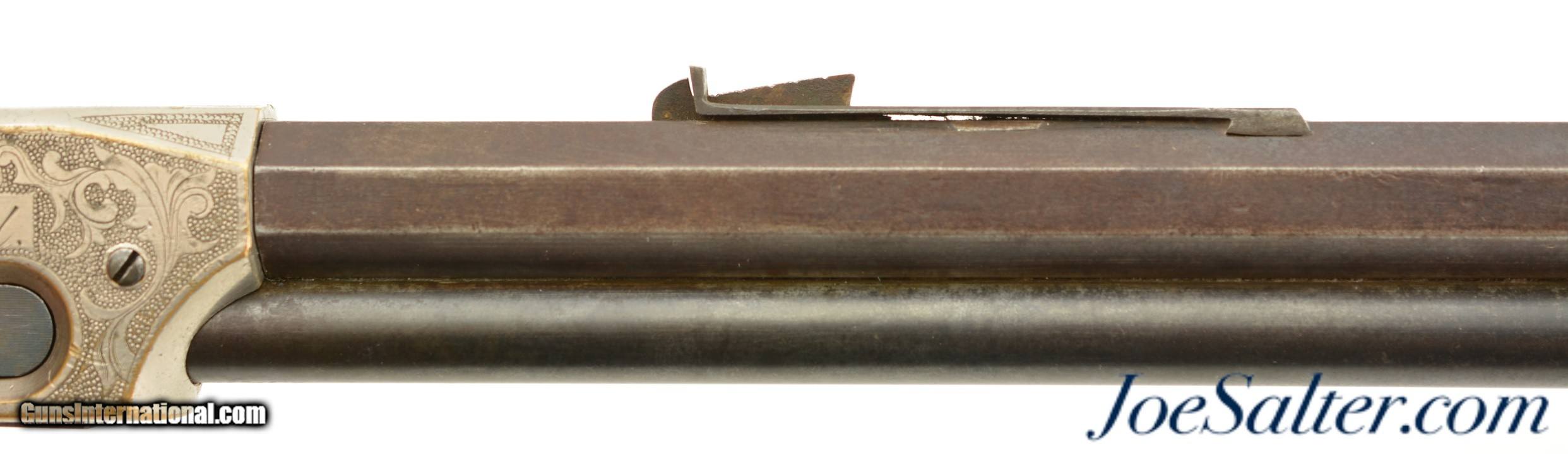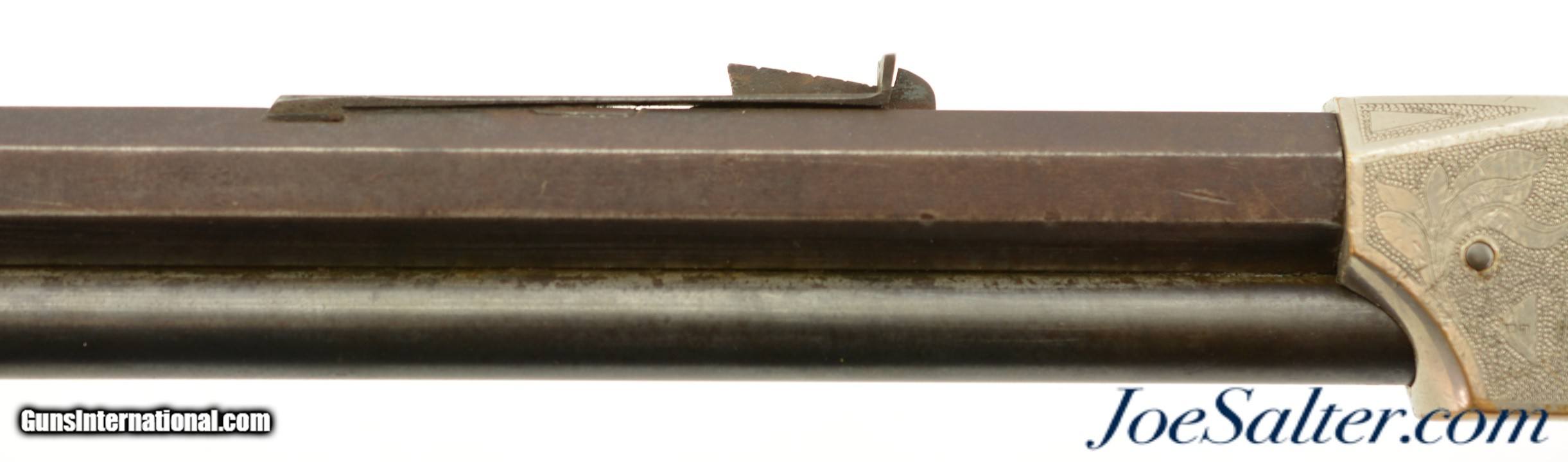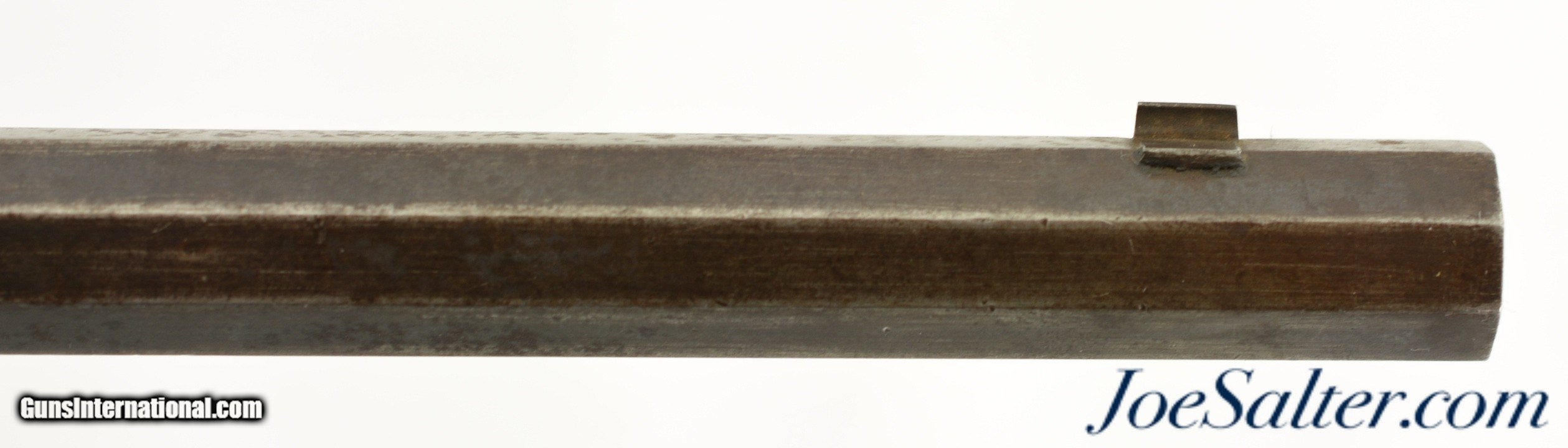 Description: Serial #5, .44 RF, 25" octagon barrel with a good bore that has some spots of dark pitting within the grooves. This is a very handsome rifle, built on Orville Robinson’s April 23, 1872, patent, and utilizes a manually-operated toggle lock that rides in a mortise along the top of the receiver operated via a knurled handle on the right side. The frame has retained 85-90% of the original nickel plated finish, with flaking to the underlying brass along the edges and projections, most noticeably on the underside of the frame ahead of the trigger guard bow. The frame has a lovely full-coverage floral scrollwork motif with punch-dot background, geometric patterns on the lower tang, and a deer head on the top flat at the breech. A large rectangular panel is present on the right side just above the early, spring steel, Winchester type loading gate that reads "John A. Macdonald" in flowing script. Unlike every other known example of the Model 1872, the barrel of this rifle is not secured by a transverse pin, but rather by a screw entering from the right side. The bolt and spring steel loading gate have visible traces of their original bright fire blue finish, with the balance turned to a mild blue-black patina, and muted color case-hardening can still be seen on the rear toggle link and hammer. The barrel retains traces of the original blue finish on protected areas, while the balance has an overall plum-brown patina that has silvering and gray fading at the muzzle and along the edges of the barrel facets. The magazine tube retains more of the original blue, with some mild fading and plum-brown on the balance. The barrel is equipped with a period bead front sight mated to a shallow V-notch elevation adjustable rear sight, as well as a vacant socket on the top tang for a no longer present aperture rear sight. The nicely figured walnut buttstock has minor handling marks scattered throughout the original varnish, which has flaked lightly at the wrist on either side as well as chip in the toe. While there is no documentation attesting to whether the name on the frame is in fact the same John A. Macdonald who became the first Prime Minister of Canada in 1867, there are some clues that support it: first, the general quality of the engraving is quite high as compared to some later engraved examples, particularly the script used to write the name; second, the fact that the middle initial was used in the first place (Sir John A. Macdonald was joint premier of the Province of Canada with his political ally John S. Macdonald prior to Confederation and use of middle initials helped remove any confusion that might arise); third, its very low single digit serial number; but most importantly, the fact that one of the most noticeable flaws of the Robinson design & the use of a barrel pin & was corrected for this example, and only this example as far as is currently known. Certainly, the rifle possesses added refinements suitable for presentation to the head of state of a neighboring country, especially one with a capital less than 150 miles from Plattsburgh, NY. This is an extremely nice example of a high grade engraved Robinson rifle, with a likely connection to the first Prime Minister of Canada, and would make a wonderful addition to any collection. Antique; Orville Moses Robinson was an upstate New York gunsmith and inventor who received three US patents for breech-loading and repeating firearms. In 1870 Robinson, in partnership with A.S. Babbitt and two others, formed the Adirondack Firearms Co. to manufacture rifles based on his patents at their manufactory in Plattsburgh, NY. The firm is known to have employed Daniel Wilkinson (possibly J.D. Wilkinson, another upstate New York gunmaker and inventor) and Robinson’s son, William (who would’ve been about 10 years old at the formation of the company!) Adirondack Firearms Co. operated until 1874, ultimately producing what is thought to be slightly fewer than 1,000 rifles of all types, when it was purchased by the Winchester Repeating Arms Co. and permanently shut down. The Adirondack Firearms Co., and Robinson’s repeating rifle designs, represent an interesting footnote in the then rapidly advancing field of repeating breechloading long guns. ; Antique: Yes Price: $15,995.00 Contact Seller |