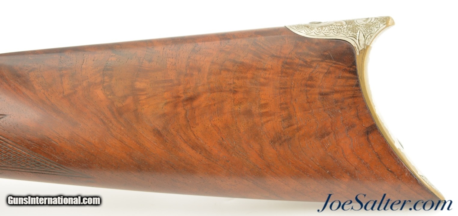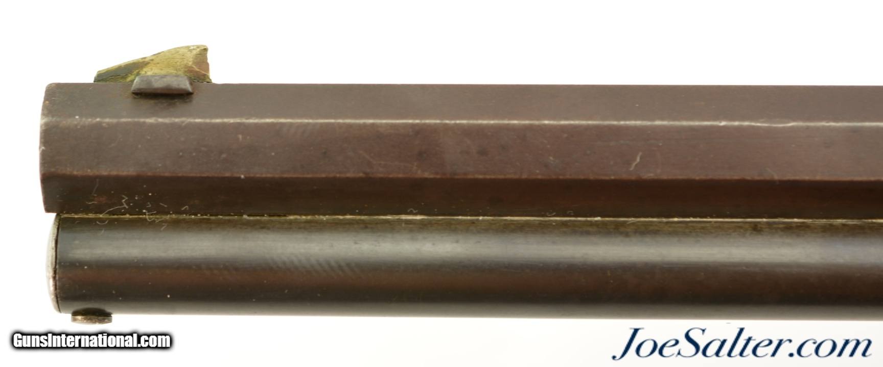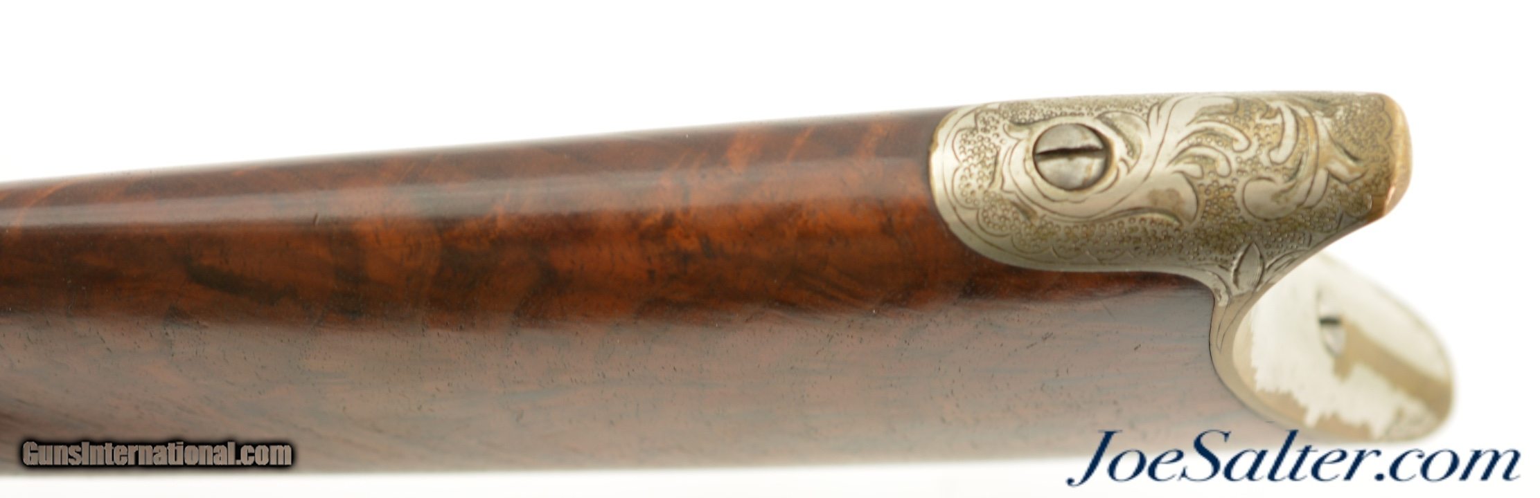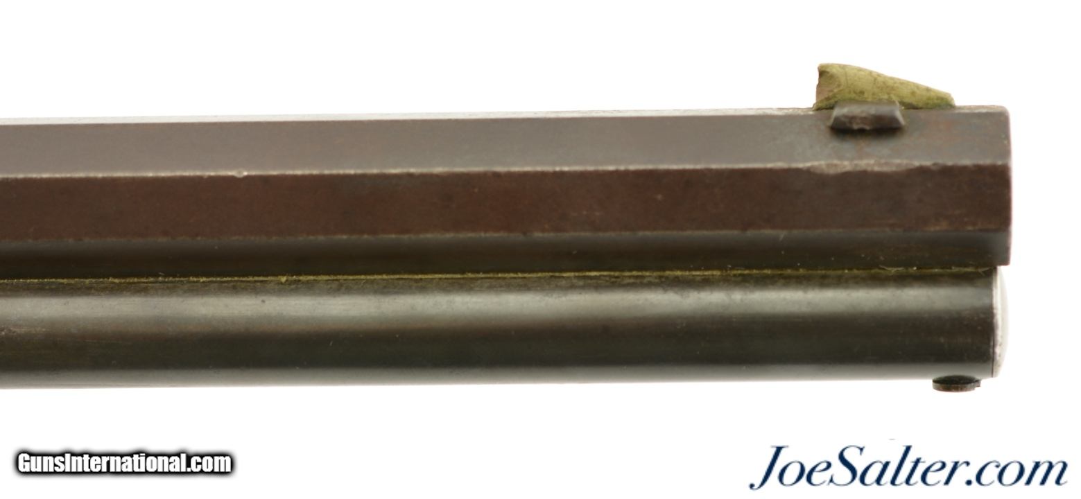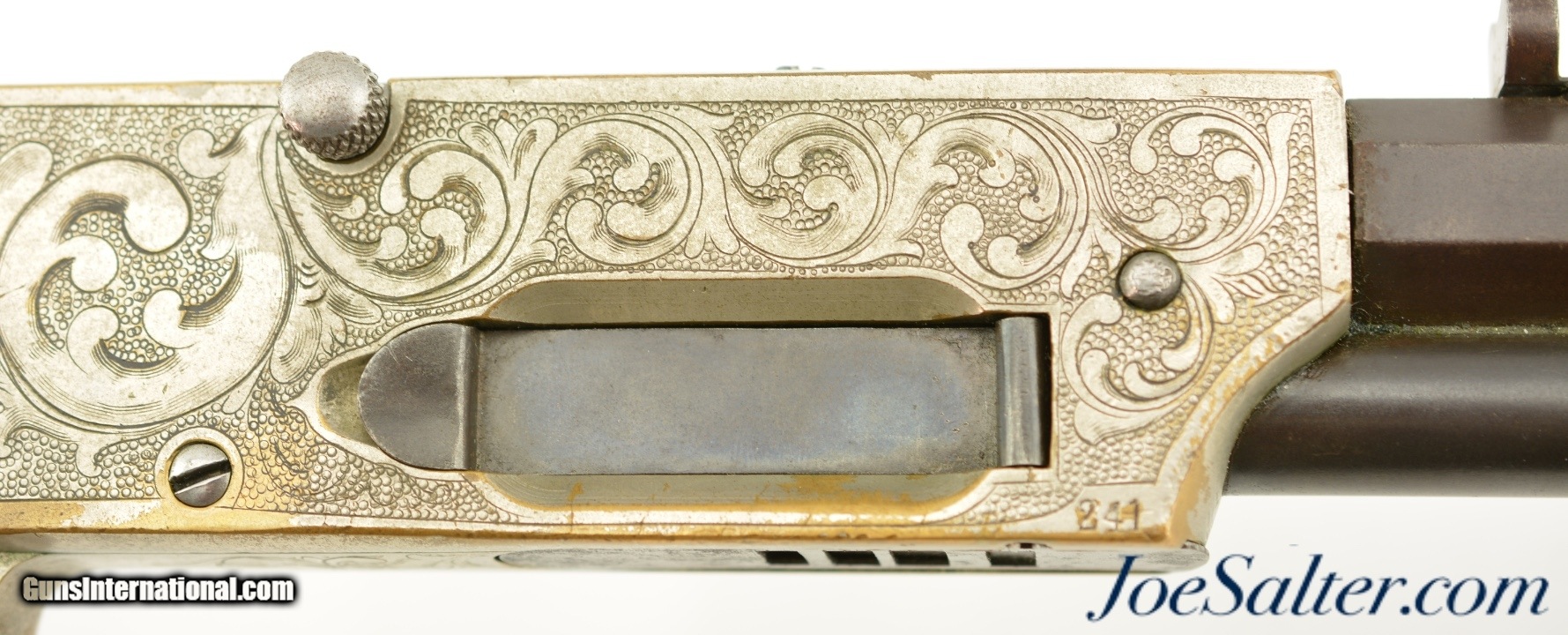 Description: Serial #241, .44 RF, 24 1/4" octagon barrel with a good bore that has dark pitting within the grooves. This is a very handsome rifle, built on Orville Robinson’s April 23, 1872, patent, and utilizes a manually-operated toggle lock that rides in a mortise along the top of the receiver operated via a knurled handle on the right side. The frame has retained 85-90% of the original nickel plated finish, with flaking to the underlying brass along the edges and projections, especially on the underside of the frame at the carry point. The frame and buttplate have full coverage floral scrollwork with punch-dot background, and there are a series of small impact marks on the forward portion of the left side of the frame surrounding the end of the barrel pin. Some faint traces of blue remains on the flip-open loading gate, with a blue-black patina on the balance. The barrel is equipped with an unusual full-length magazine tube and retains traces of the original blue finish on protected areas, with an overall plum-brown patina on the balance, and gray fading at the muzzle and along the edges of the barrel facets. The magazine tube retains more original blue, with plum-brown on the balance. The barrel is equipped with a period German silver front sight mated to a V-notch rear sight, screw-adjustable for elevation. The beautifully figured walnut buttstock has some very minor handling marks in the excellent original varnish, and sharp checkering at the wrist. This is a splendid example of a high grade engraved Robinson rifle, and would make a wonderful addition to any collection. Antique; Orville Moses Robinson was an upstate New York gunsmith and inventor who received three US patents for breech-loading and repeating firearms. In 1870 Robinson, in partnership with A.S. Babbitt and two others, formed the Adirondack Firearms Co. to manufacture rifles based on his patents at their manufactory in Plattsburgh, NY. The firm is known to have employed Daniel Wilkinson (possibly J.D. Wilkinson, another upstate New York gunmaker and inventor)) and Robinson’s son, William (who would’ve been about 10 years old at the formation of the company!) Adirondack Firearms Co. operated until 1874, ultimately producing what is thought to be slightly fewer than 1,000 rifles of all types, when it was purchased by the Winchester Repeating Arms Co. and permanently shut down. The Adirondack Firearms Co., and Robinson’s repeating rifle designs, represent an interesting footnote in the then rapidly advancing field of repeating breechloading long guns. ; SOLD Antique: Yes |