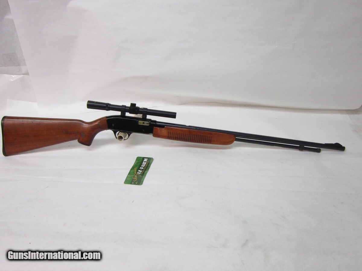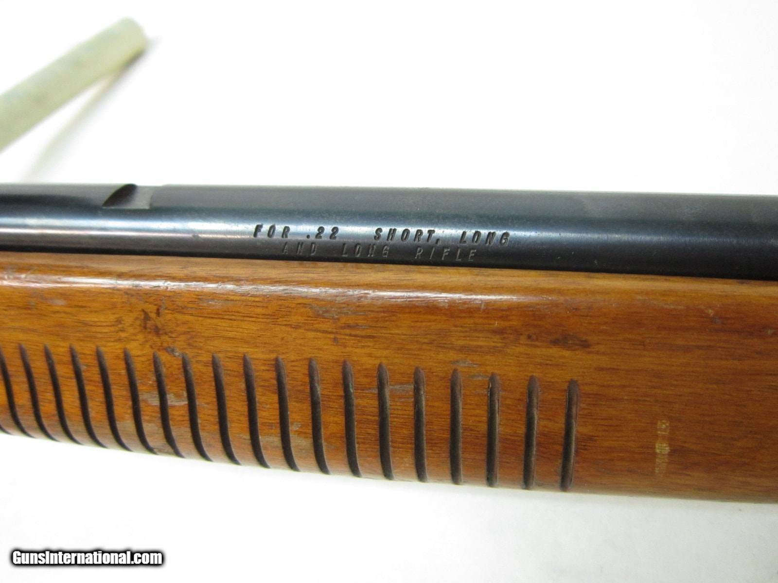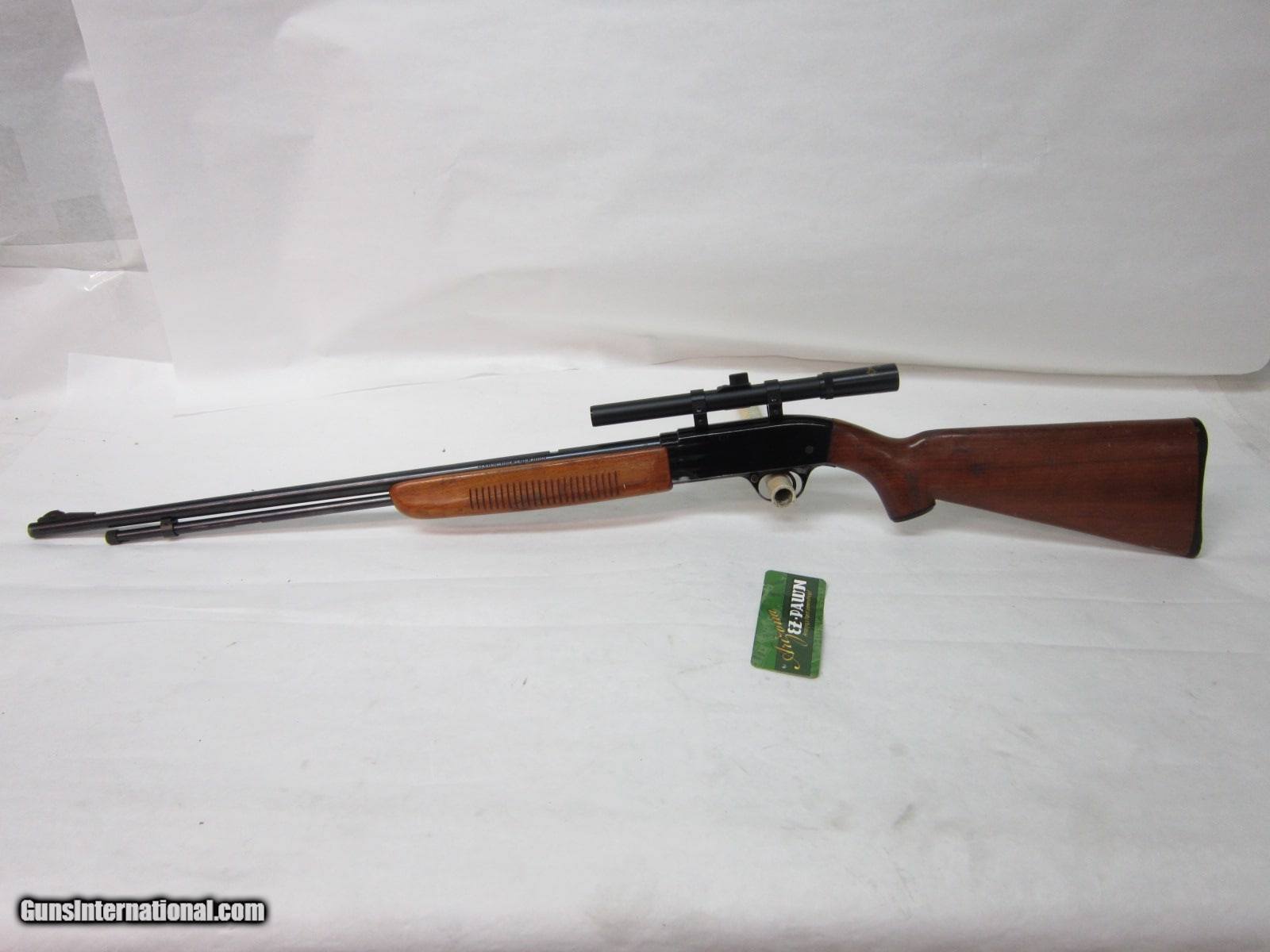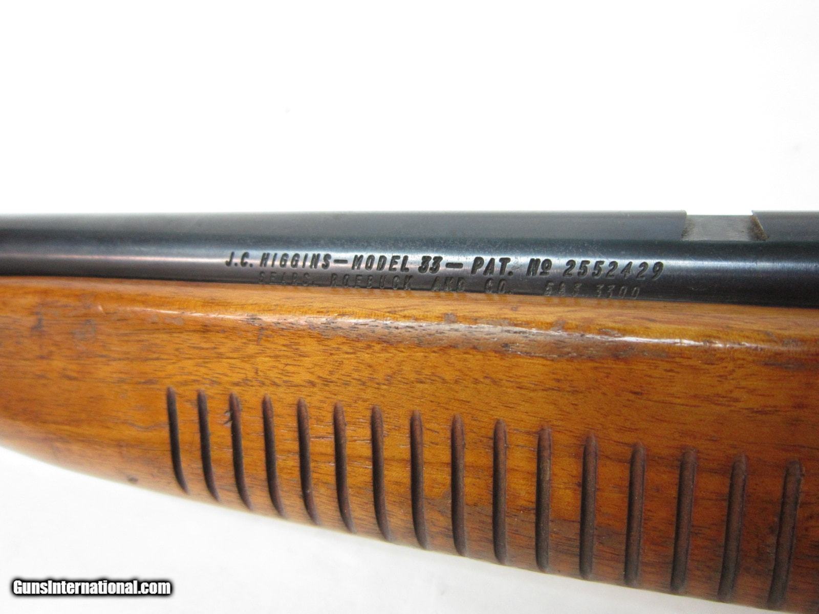 Description: Guns Listing ID: 809468 MAKE: Sears, JC Higgins MODEL: 33 ACTION: Pump CALIBER: .22 Short, Long, Long Rifle FINISH: Blued TYPE OF STOCK: Wood CONDITION: Good BARREL LENGTH: 24\" OVERALL LENGTH: 41 3/4\" PULL LENGHT: 14 3/8\" SCOPE: Crossman 4x15 SIGHTS: Rear sight is missing, metal ramp NUMBER OF MAGS: N/A CAPACITY: 12+1 (LR) CHOKE TYPE: N/A CASE: N/A ACCESSORIES: N/A SERIAL #: NVN ADDITIONAL DESC: A good condition, full sized rifle. Very good bore, chamber and muzzle brake. The action incorporates a disconnector and does not slam fire. The scope is cheap, small, a little dim, and difficult to use. It is currently focused at 15 yards. It will work for you until you can install something better. The receiver is NOT drilled and tapped for a scope base, but it is factory grooved for a clamp on scope mount. Sorry, but there is no factory box or owner‚‚s manual for the rifle. We do not know the date of manufacture. While the shotgun has been cleaned, lubed and inspected by our gunsmith, it has not been test fired SOLD Manufacturer: J.C. HIGGINS Model: 33 Caliber Info: .22 S-L-LR Condition: Used - Non-Certified Barrels: 24 BARREL Finish: BLACK |