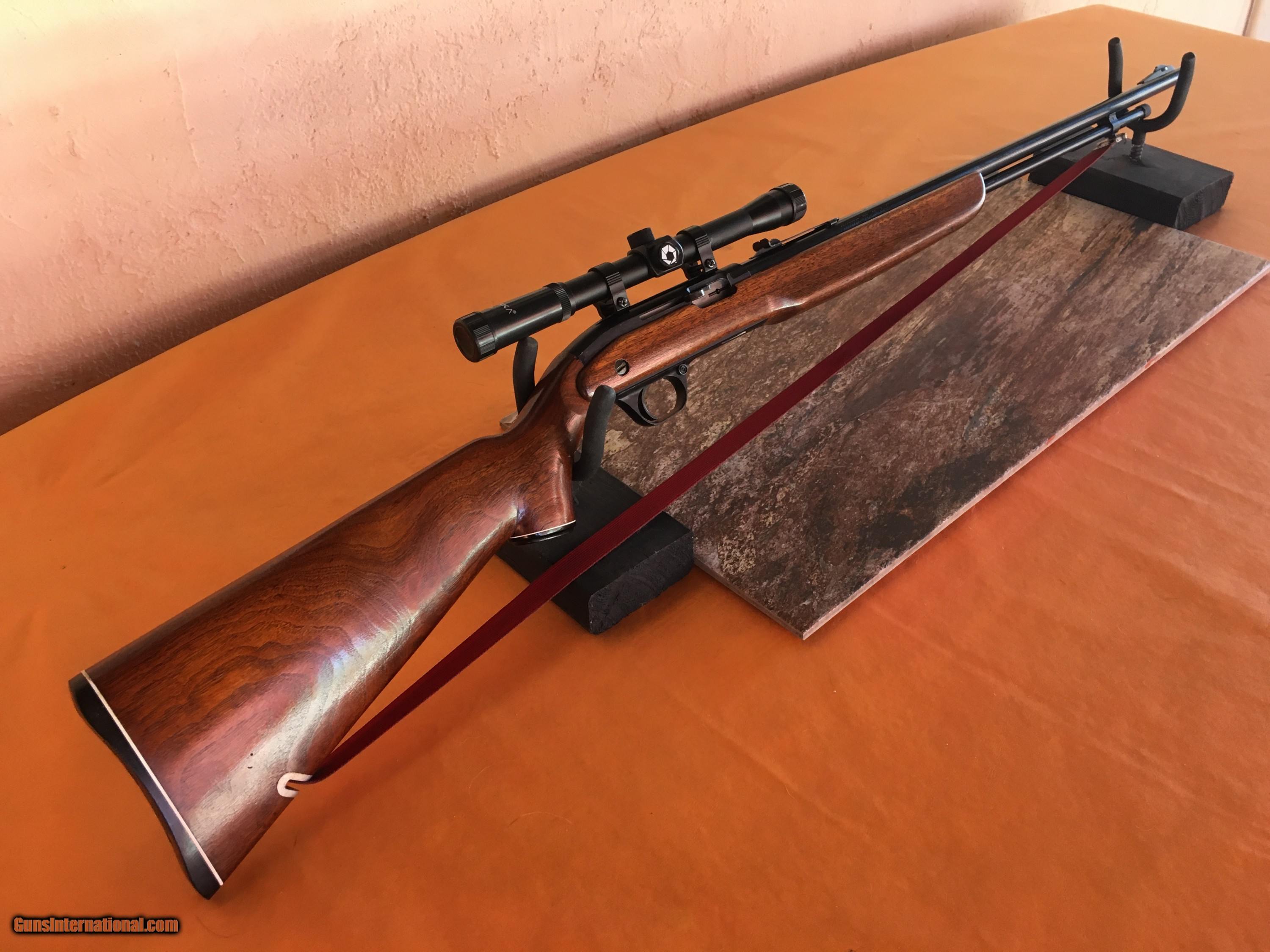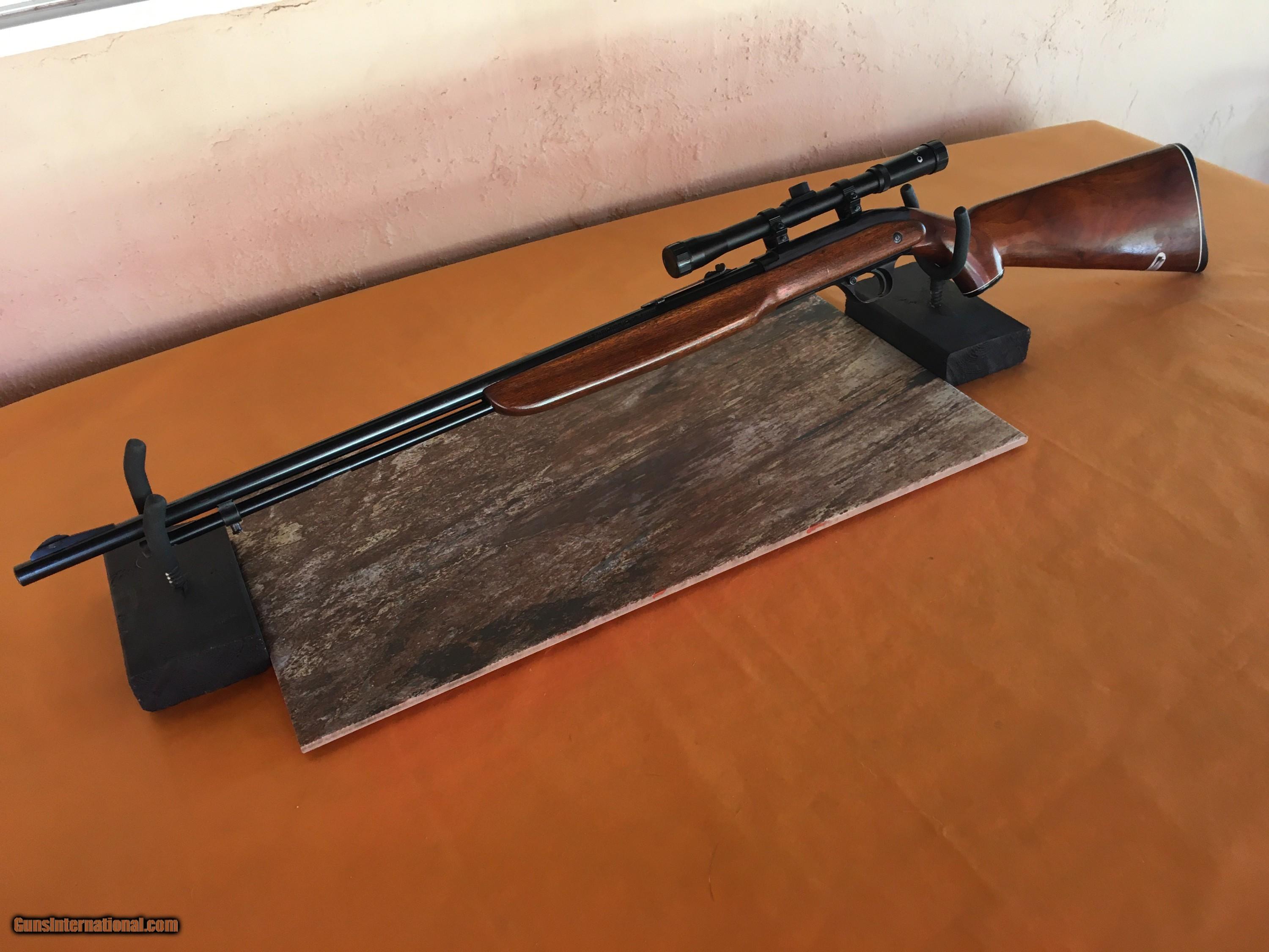 Description: J.C. Higgins Model 30 Semi - Auto - .22 LR Rifle - Smooth walnut 2 piece pistol grip style stock and forend with butt plate in excellent conditon . 24 In. long barrel with adj. open rear sight and a ramped front bead sight. Receiver grooved for scope. Includes a New Barska 4x20 scope and rings. Tubular magazine with 15 LR capacity. Built in retractable 1 in. wide red carry sling in excellent condition. Barrel and receiver are retaining approx. 90% bluing. Bore is clean and bright. 41.75 in . overall lenght. Wgt. 5 lbs. Includes a New soft sleeve. Stock and forend are in exceptional condition with minimal handling marks. The overall condition of this rifle is excellent. Does not appear to have had much use. These were very stylish rifles manufactured by High Standard. Manufactured from 1950-1953. Excellent addition to any collection. We can ship to C&R or to your FFL dealer at a flat rate of $50.00 S&I to lower 48 states. All of our rifles have been cleaned and lubricated. SOLD Curio/Relic: Yes Rifle Caliber: .22 Long Rifle Manufacturer: J.C. Higgins Model: 30 Serial Number: NSN Barrel Length: 24 In. Long Condition: Excellent Metal Condition: Excellent Wood Condition: Excellent Bore Condition: Clean / Bright Action: Semi Butt Pad: Excellent Weight: 5 Lbs. Sights: Open / Bead Extras: Built in carry strap Case: New soft sleeve |