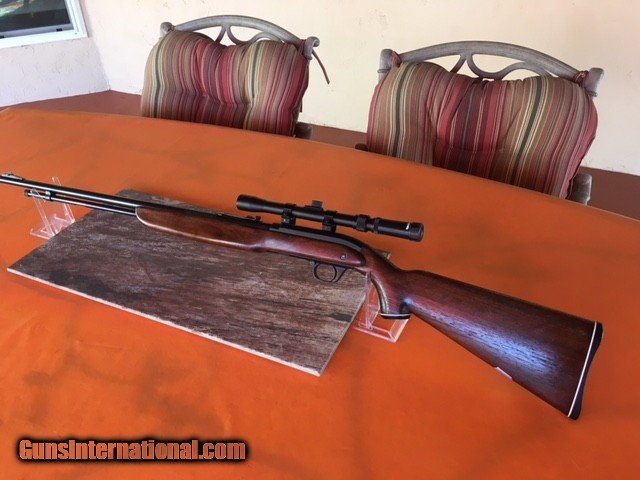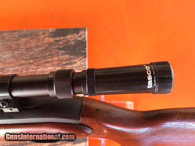 Description: J.C. Higgins Model 31-Semi -Auto-.22LR Rifle - Smooth walnut 2 piece pistol grip style stock with extended forend. Butt plate and white spacer are in excellent condition. Wrist emblem has new white spacer. Tubular 15 LR magazine . Wgt. 5.75 lbs. 24 in long barrel , open rear adj. sight and ramp style bead front sight. Bore is clean and bright. Includes a Tasco 7x42 Scope w/ mtgs. Barrel and receiver are retaining approx. 95% bluing. This was and still is a very stylish rifle . Also known to be extremely accurate . Some had built -in slings this one does not. Manufactured from approx. 1952 to 1959. This would make a great addition to any J.C. Higgins collection. SALE PENDING All of our rifles have been cleaned and lubricated . We can ship to C&R or to your FFL dealers a flat rate of $50.00 S&I to lower 48 states. SOLD Curio/Relic: Yes Rifle Caliber: .22 Long Rifle Manufacturer: High Standard Model: J.C.Higgins-31 Serial Number: NSN Barrel Length: 24 IN. Condition: Excellent Metal Condition: Very Good Wood Condition: Very Good Bore Condition: Clean / Bright Weight: 5.75 lbs. |