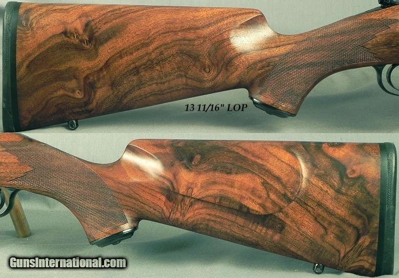 Description: #KA14556, Kimber Mfg. Inc., Yonkers, N.Y.: Kimber 22 Long Rifle Model Super America, 22" barrel without open sights, It remains in excellent condition, Controlled round feed claw extractor, Modern Weaver 3 - 9 x 32mm with their adjustable objective, A neat Model 70 type 3 position wing safety (Not many 22's have these), Wrap around point pattern checkering, Steel grip cap, 5 shot clip magazine, Sling eyes on the stock, Cheekpiece, Ebony forend tip, A nice piece of Claro Walnut with deep color & contrast, 13 11/16" LOP over a factory 5/8" pad, It will go 14 1/4" with a 1" pad, 7 lbs., The factory blue is 98%, The original stock finish is 98%, The checkering is 100%, The bore is as new. At 50 yards shooting 10 shot groups it has produced .747" - .810" - .815" & .910" groups with Federal Gold Medal Match, Norma Tactical, Winchester Power Point and Eley Subsonic. I believe that will work. SOLD Rifle Caliber: .22 Long Rifle |