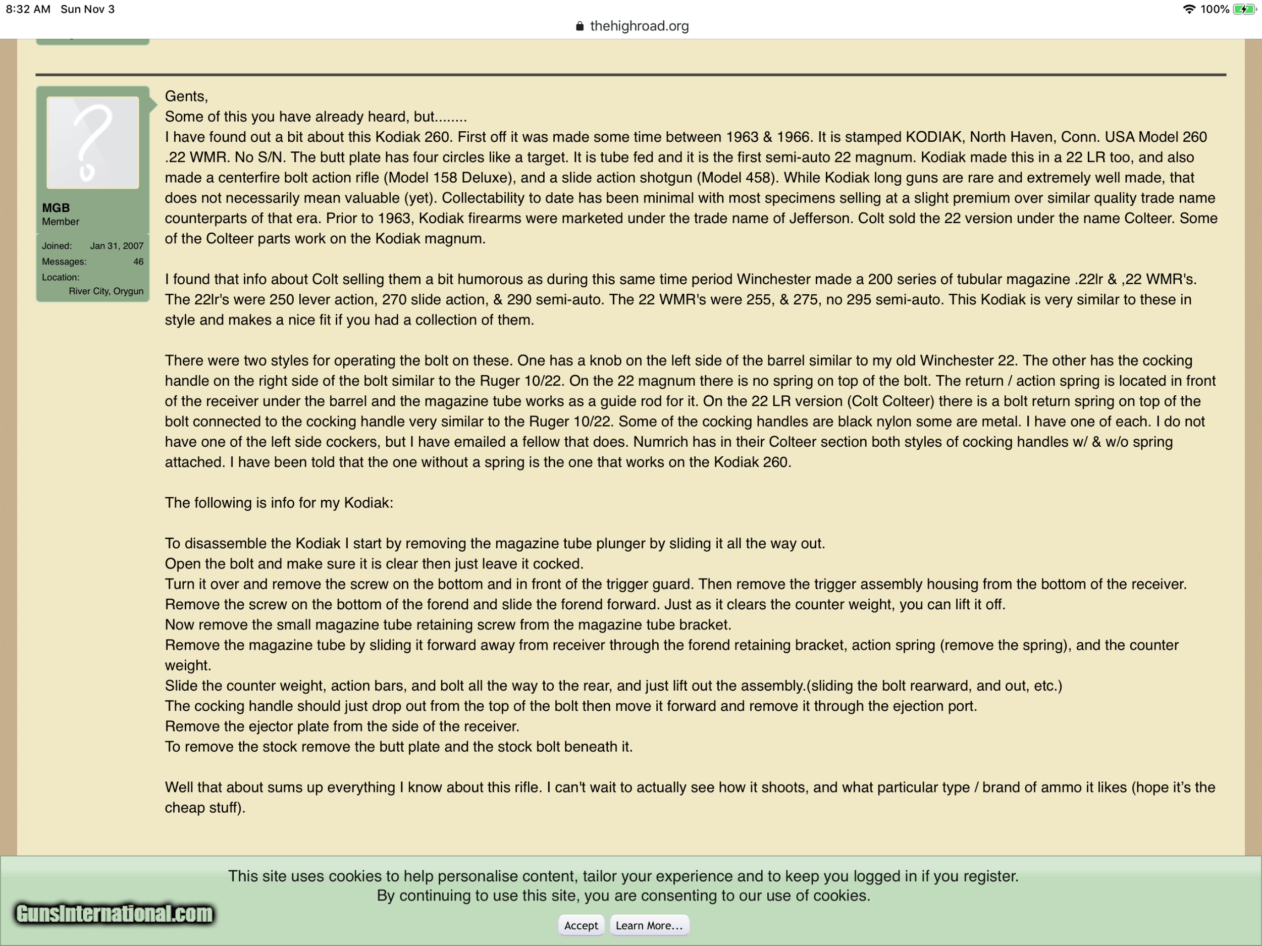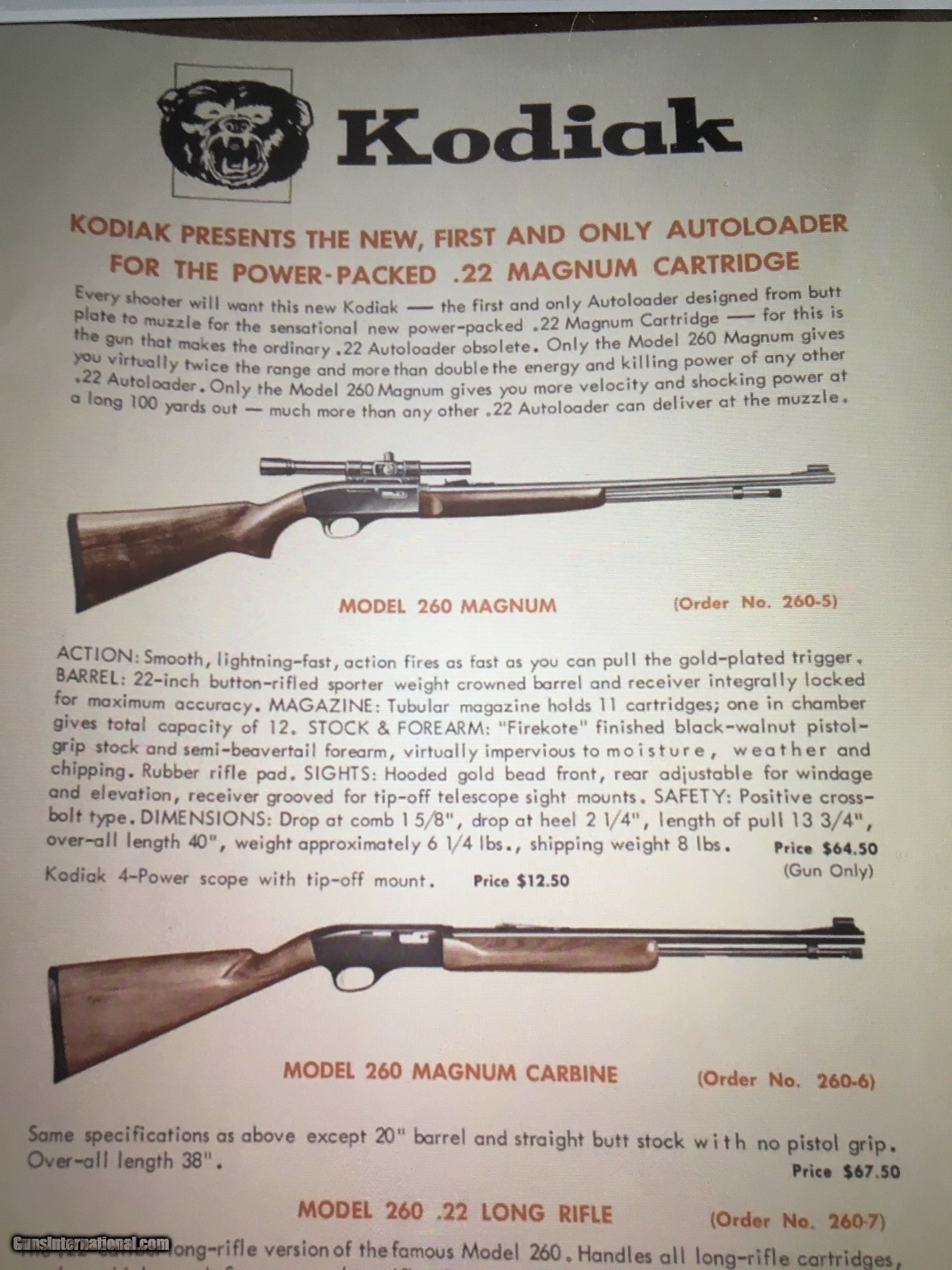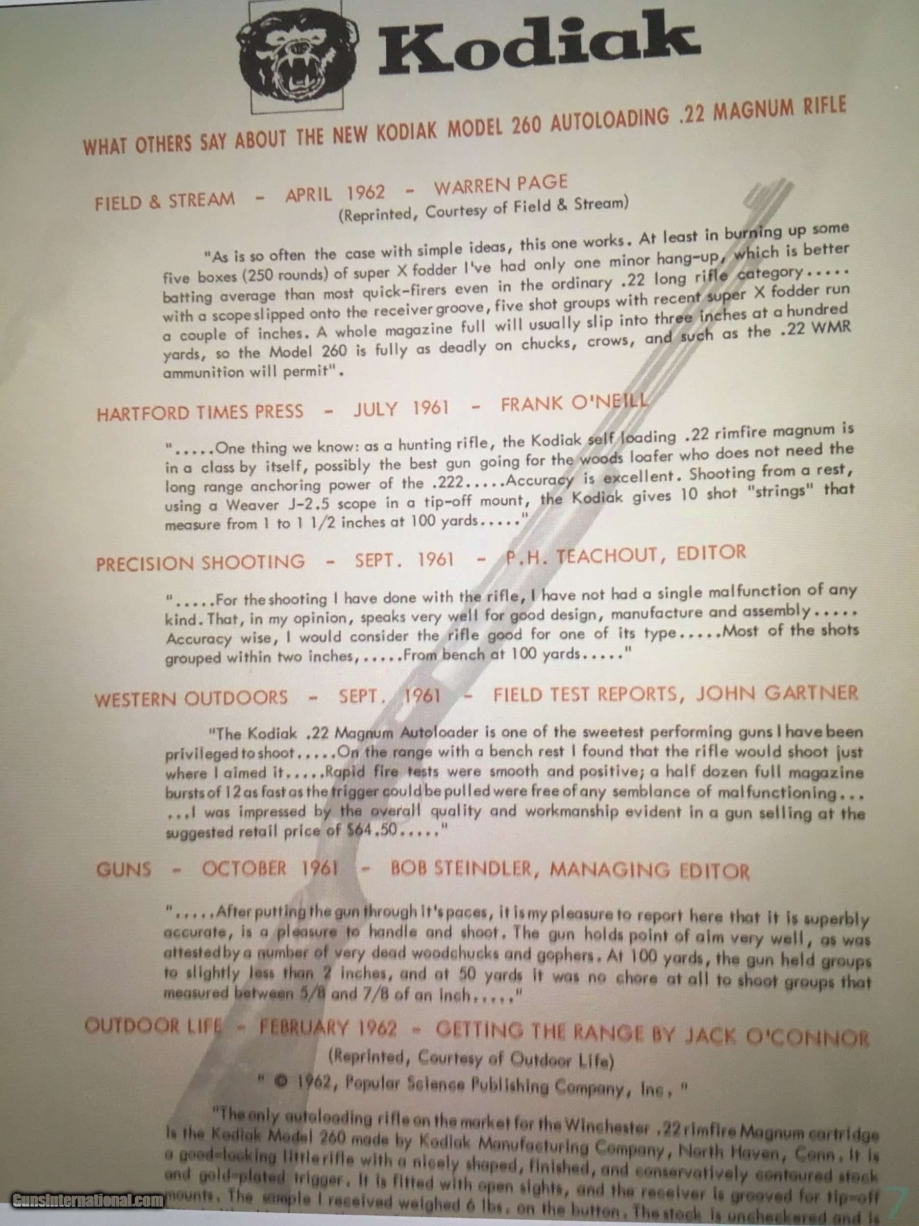 Description: Kodiak Arms of North Haven, Conn. was the first manufacturer of the the 22 rim fire magnum semi-autoloader. Serial # 15925 is on front of receiver behind forestock.Please see photo documentation for complete description,measurements and reviews. They are interesting! This rifle is in extremely nice condition and is truely a rim fire collector’s rifle. Please note all photos. Shipping in hard case 50.00. *** No Returns ***. Priced to sell! SOLD Curio/Relic: Yes |