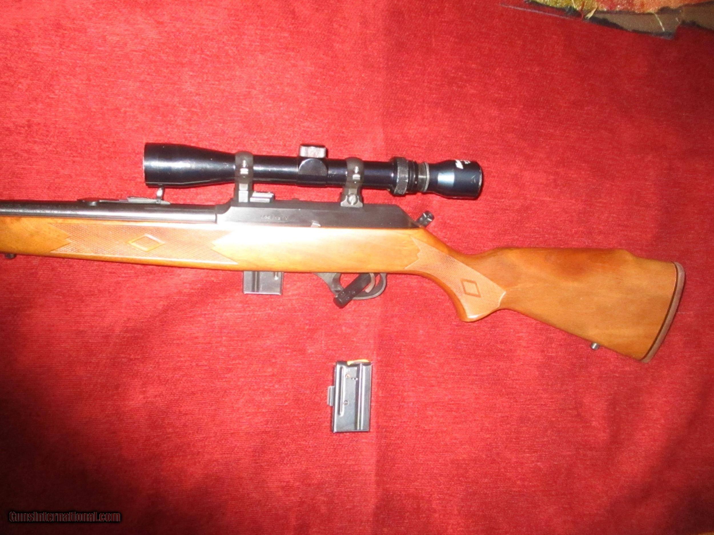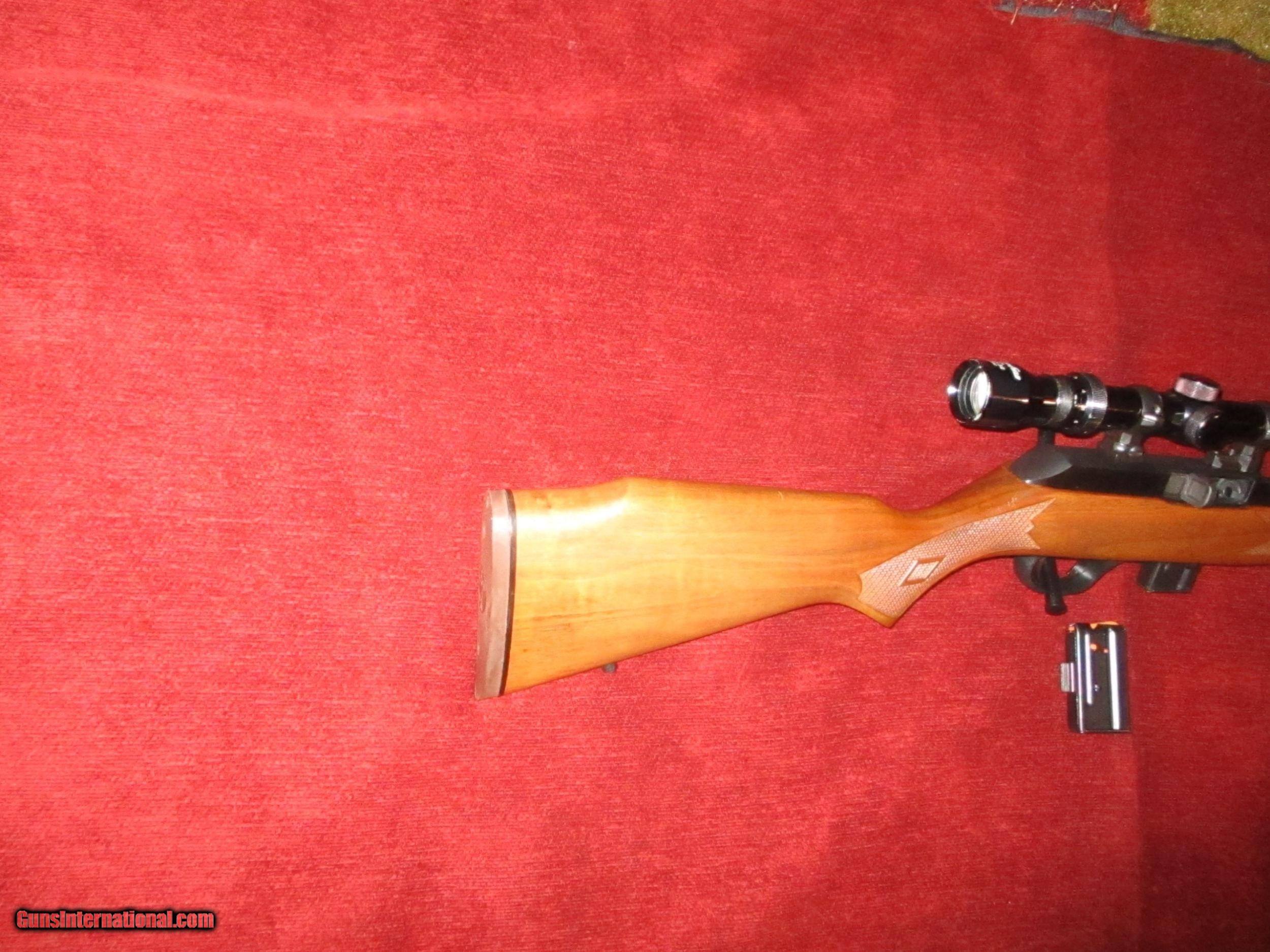 Description: 20 1/2" carbine Micro-Groove med. weight slightly tapered bbl., flawless action, also (2) hi-capacity 7rd mags included, quality steel bases & 1" rings, American select grade, oil finished, checkered American select WALNUT stock, factory 3/8" solid pad, ' Beautiful 99% orig. example 922 magnum" set-up for varmit, game & sport shooting, looks as new condition shot little, plus proper Westernfield period 3 X 9x variable scope, very accurate, only: SOLD |