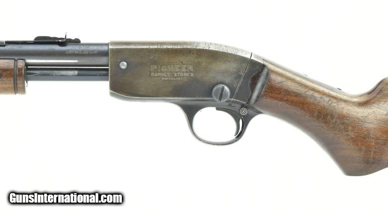 Description: Pioneer 31 .22 S, L, LR caliber rifle. Pre-war slide action. Bore is excellent. Receiver has a gray patina with an area of light pitting. Good overall condition.