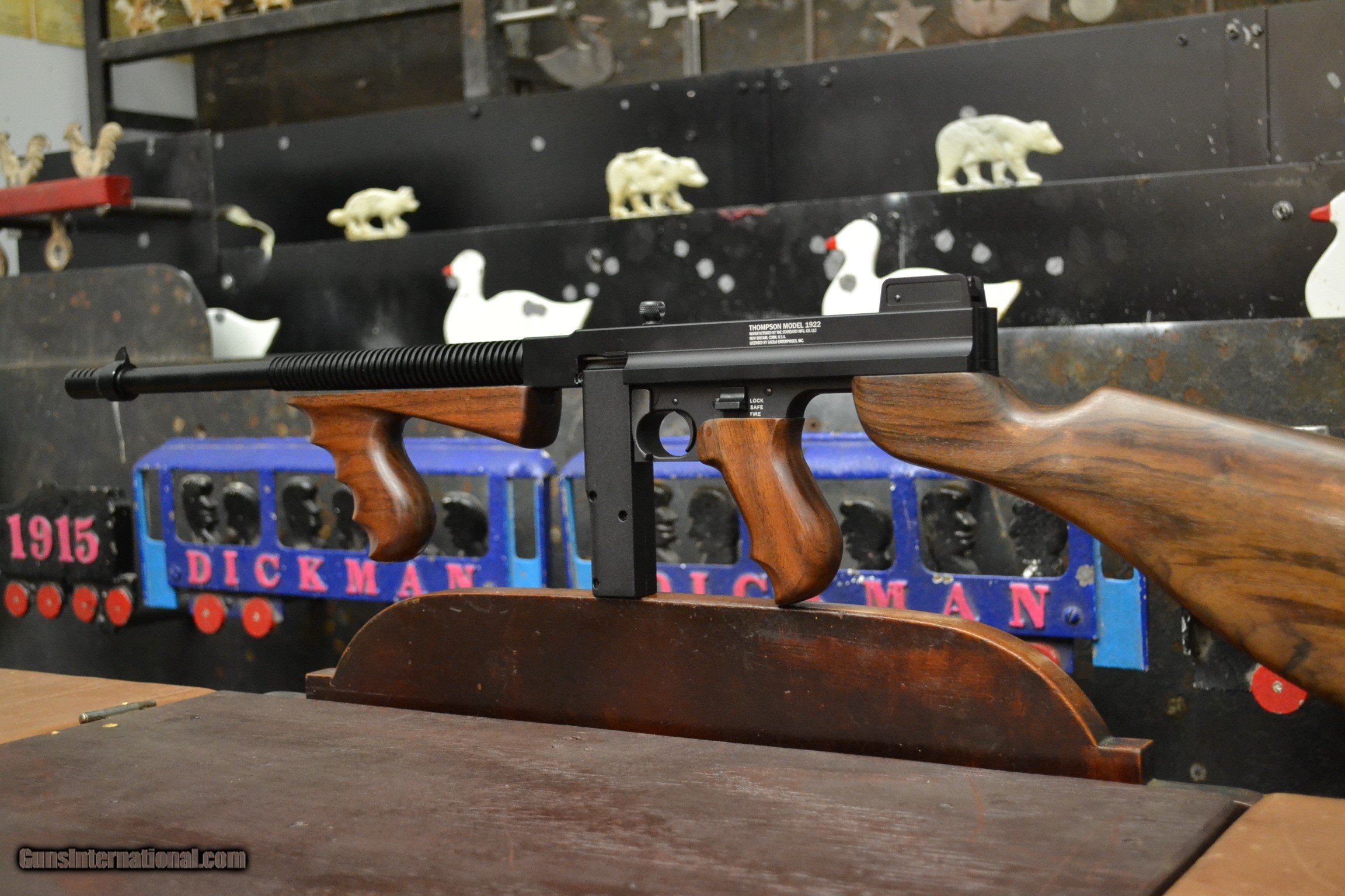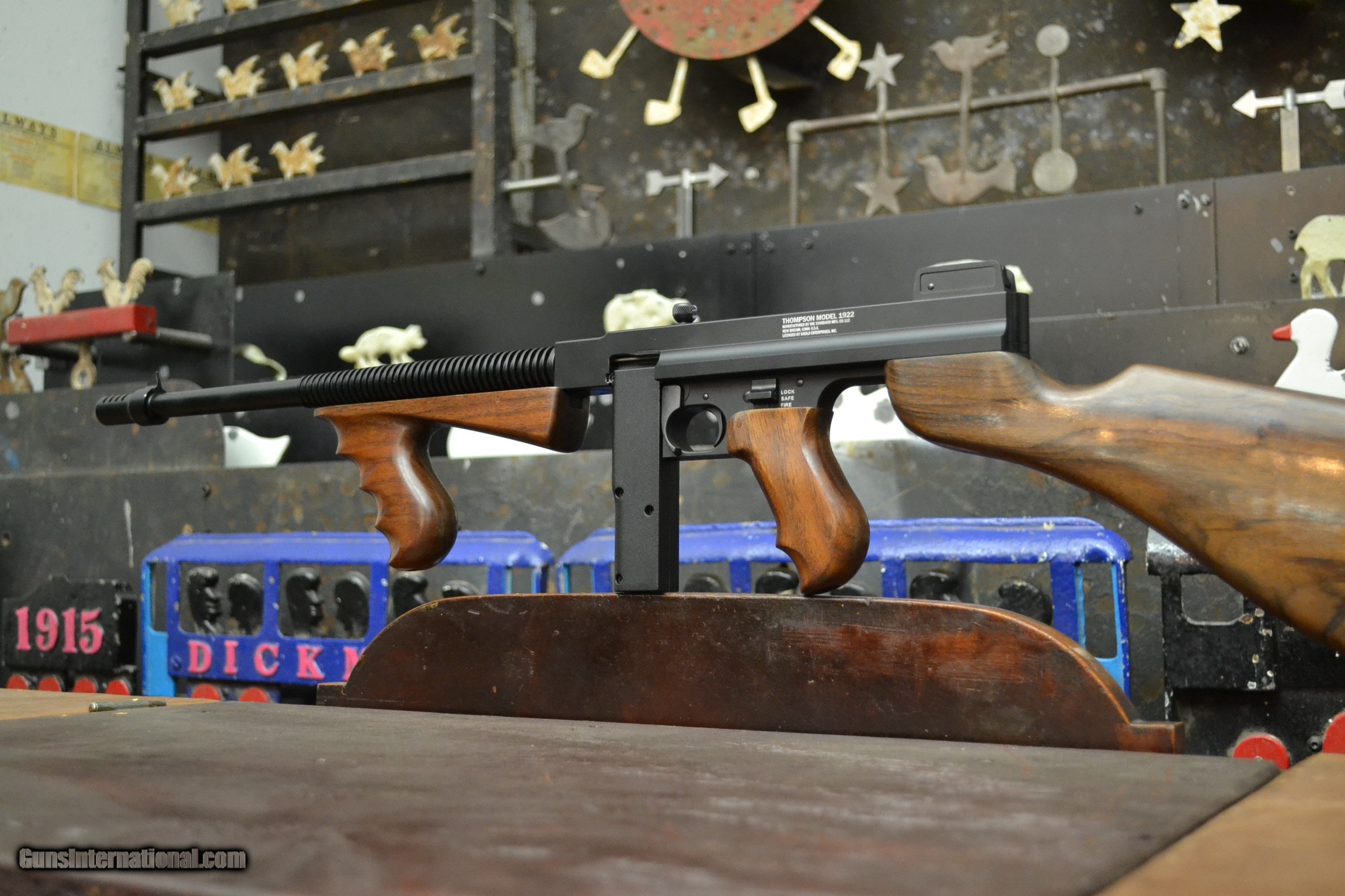 Description: Standard Manufacturing Company- Thompson Model 1922, .22 Long Rifle, Semi Automatic Rifle, 16.4” barrel, walnut stock and grips, 1/2 size frame, the gun is completely machined out of aircraft grade aluminum. Standard Manufacturing Company is proud to offer the Tommy Gun Semi Automatic Rifle in .22LR This is the first time in history that a Thompson product is offered on a true scaled frame according to its caliber. Don’t confuse this gun with a crude finished gun, these guns are built like a Swiss watch, all metal and wood finishes are superior to any other comparable guns on the market, this gun is a marvel of modern engineering, it will be the centerpiece of your gun collection. Barrel Length- 16.4” Overall Length- 34 ½” Weight with 10 round magazine- 4lbs. 10oz. Optional 50 round drum magazines available separately. $1,100.00 We have a limited number of guns available for immediate delivery SOLD |