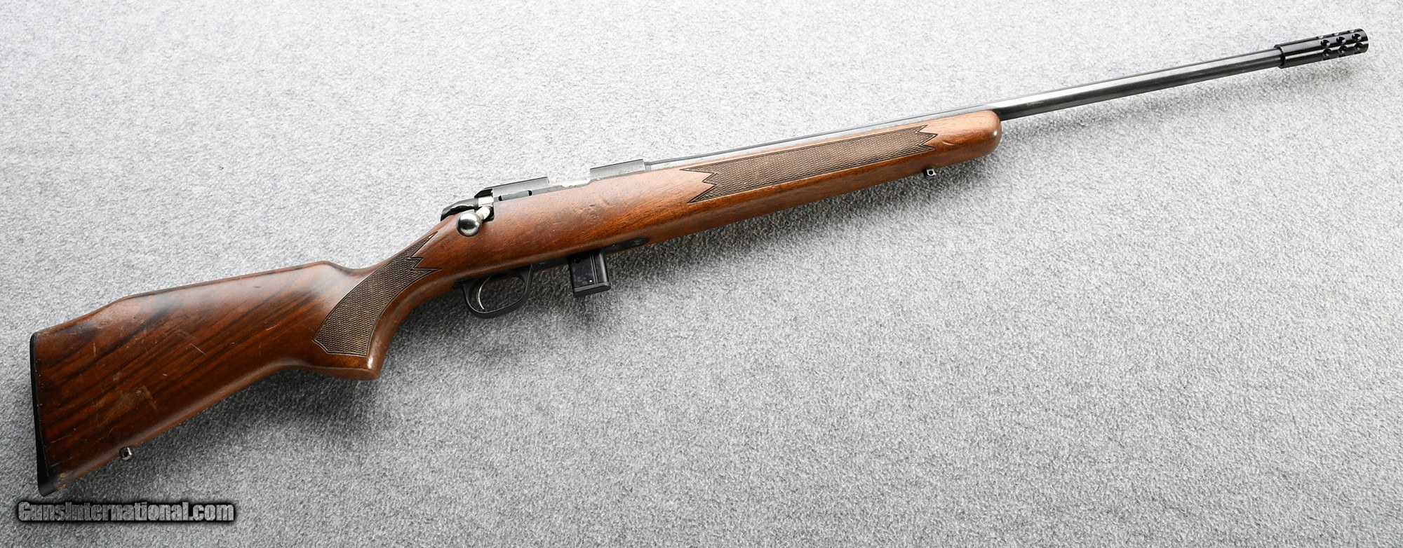 Description: Good condition with some handling marks and bluing loss, some staining on the butt stock. One ten round detachable magazine, muzzle break. .22 Long Rifle Chambers: .22 LR in a ten round detachable magazine Metal Condition: Good Wood Condition: Good Bore Condition: Very good Stock Dimensions: 13.5" LOP Fore End: Checkered Walnut Butt Pad: Sako hard plastic Weight: 6lbs 2oz Sights: Integral scope mount Item Location: Grand Junction, CO Price: $999.99 Contact Seller |