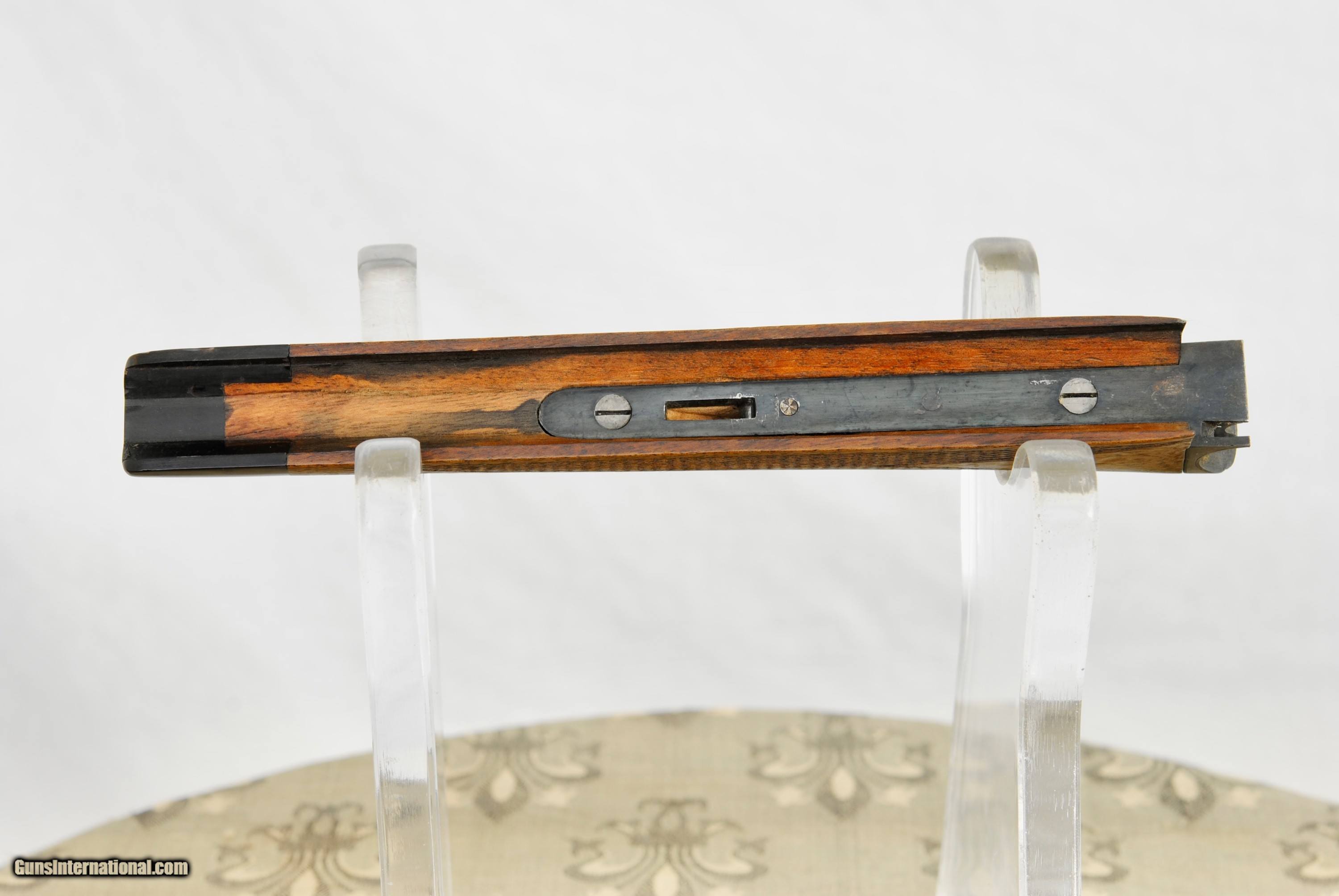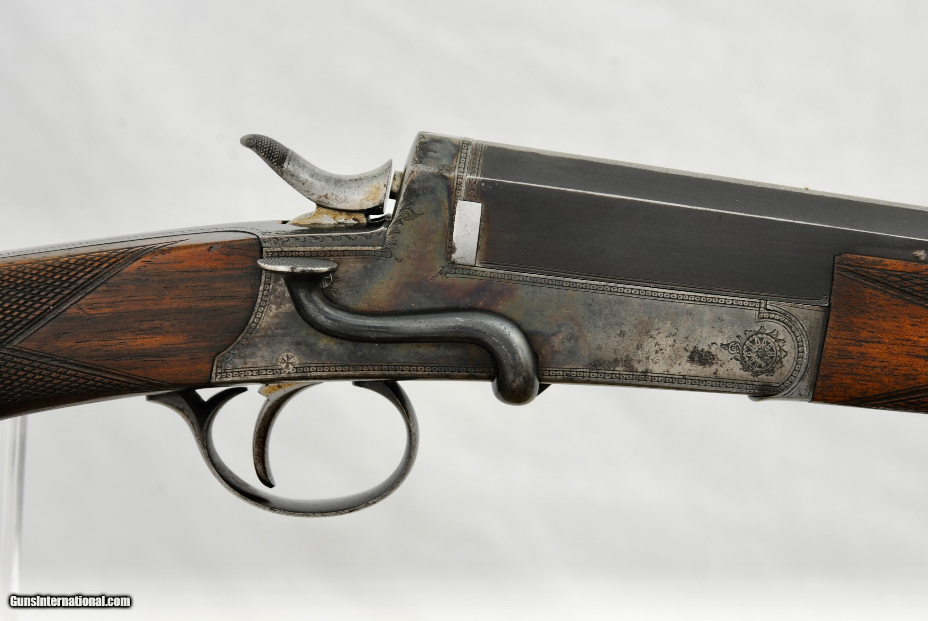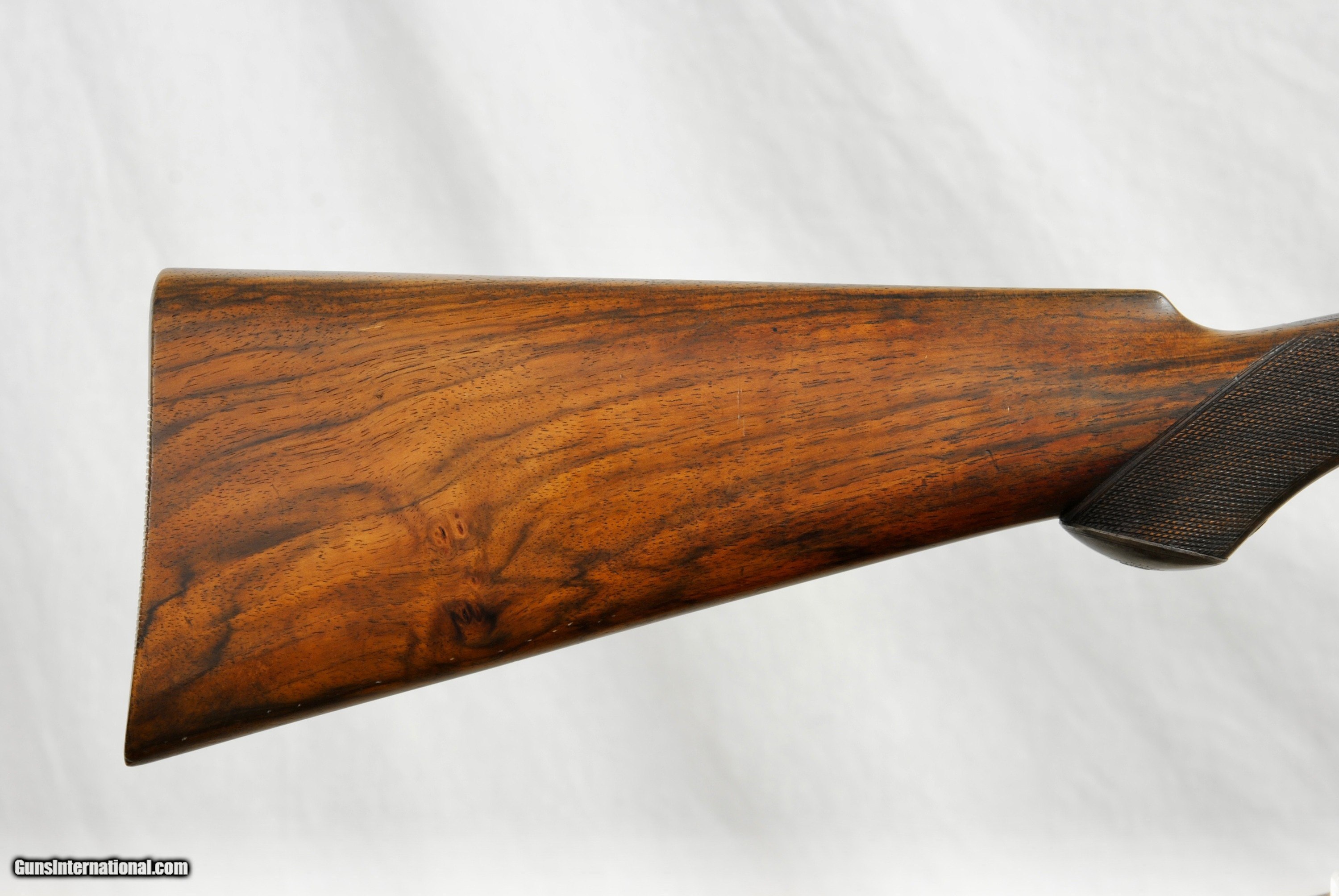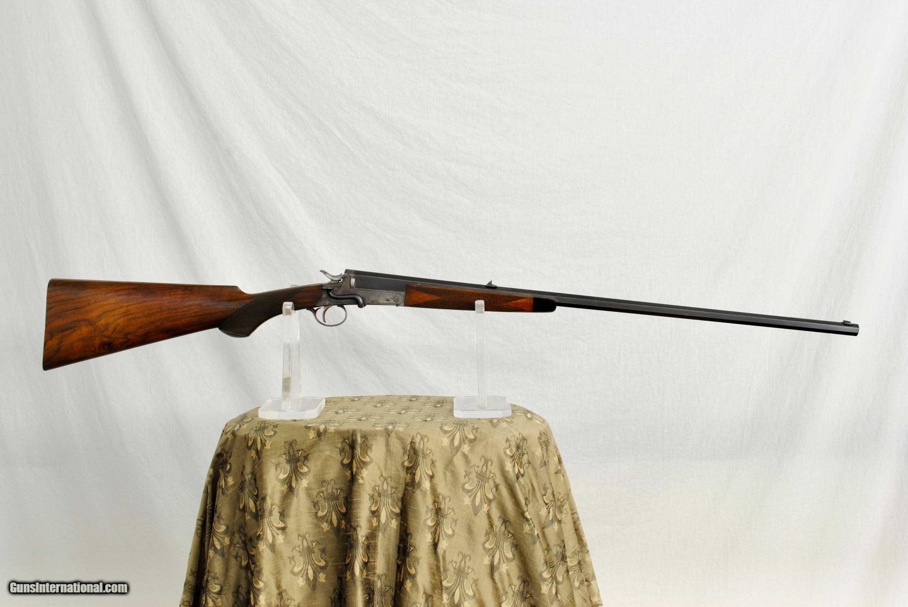 Description: Army Navy London Rook Rifle in 300 Rook. This high condition pre-1898 little rifle has many high quality features. Octagon 27" barrel with one standing sight marked "50" and two flip ups marked "100" and "150". Front blade sight with serrated. end to reduce glare. Mint bore with well defined rifling. Side lever opening with an automatic ejector system. Stock has a remarkable amount of figure for a rook rifle. Forend has a high polished horn tip. Well defined and lightly used checkering. Manual cocking system with high polished hammer. There is a generous amount of original case color in protected areas. Metal trigger guard and grip cap. Lightly and tastefully engraved. Gun is London Nitro Proofed with the specifics stamped on the underside of the barrel (Twist 1-18/4 Grains of Cordite/80 Grain Bullet). 300 Rook brass is available from multiple sources in the USA. The balance on this gun is remarkable - about 1" in front of the hinge pin. Weight of the gun is 5 LBS 8 1/2 OZ. The aesthetics of the stock are attractive with a full size LOP of 14 1/2". As an antique, this rifle can be shipped directly as local law allows. Shipping is $75. A London Best Rook Rifle that is a joy to shoot! SOLD Antique: Yes Rifle Caliber: .300 Rook |