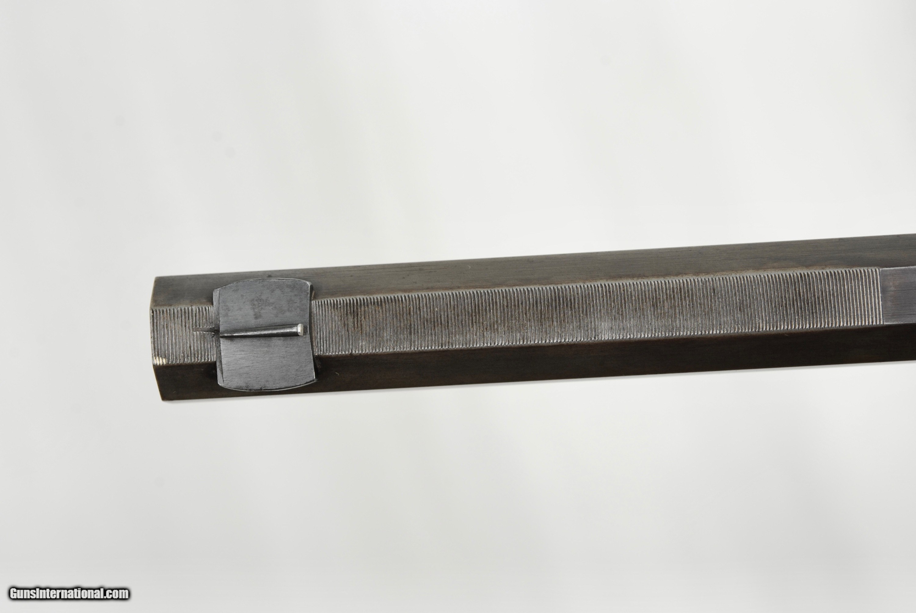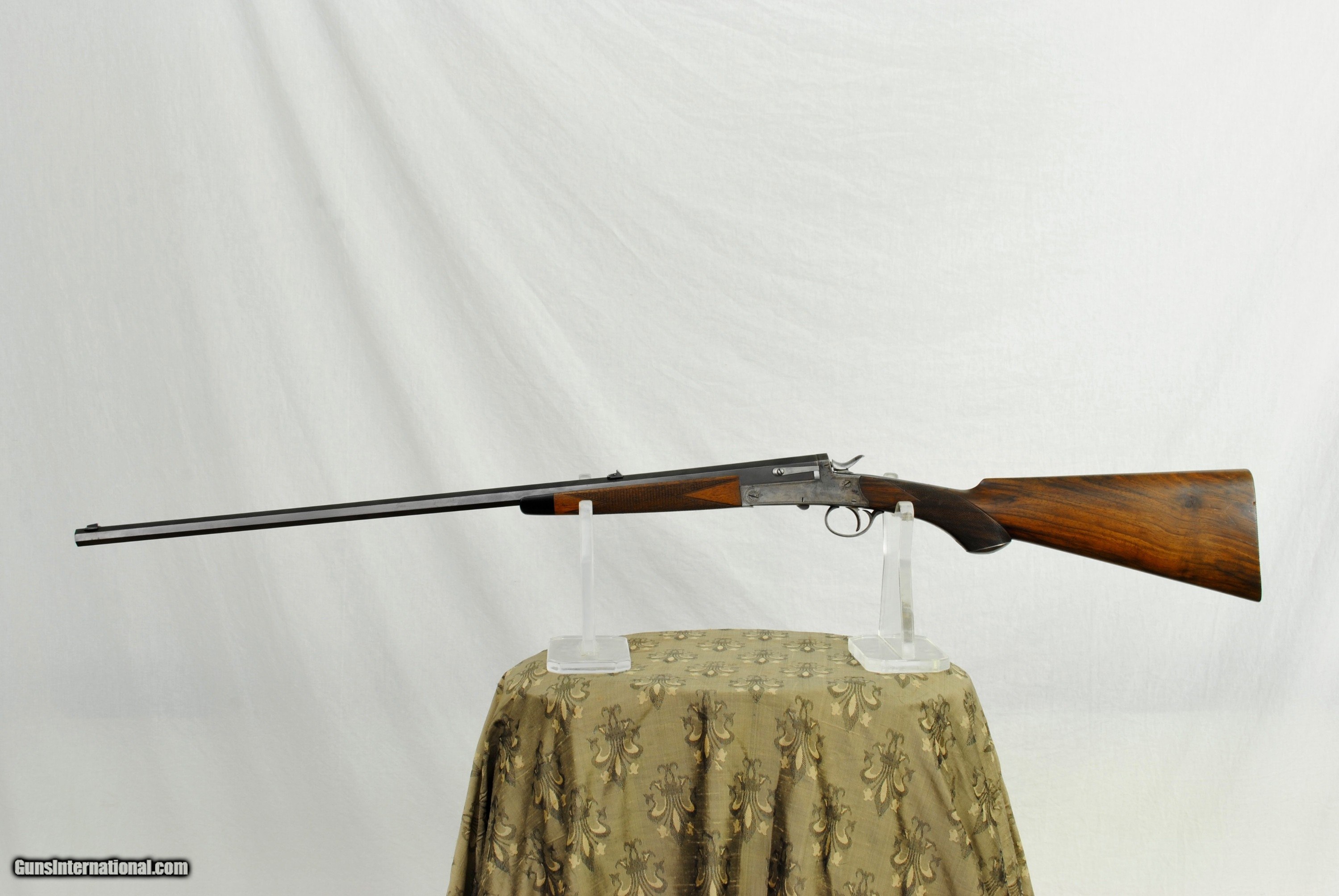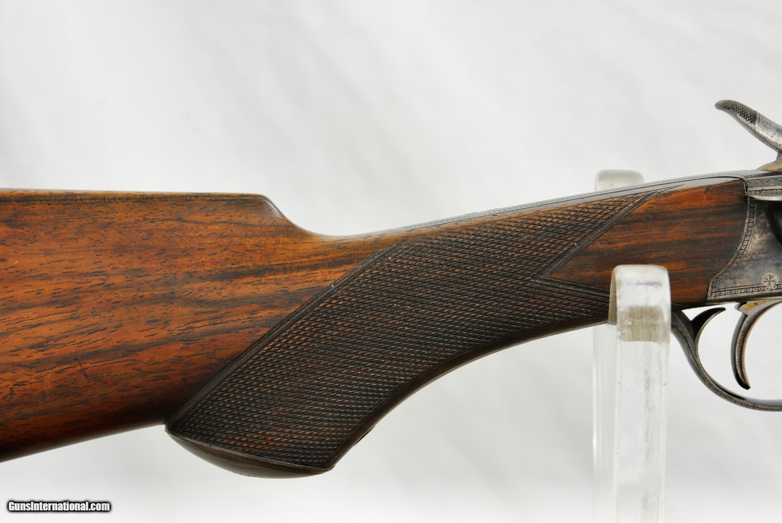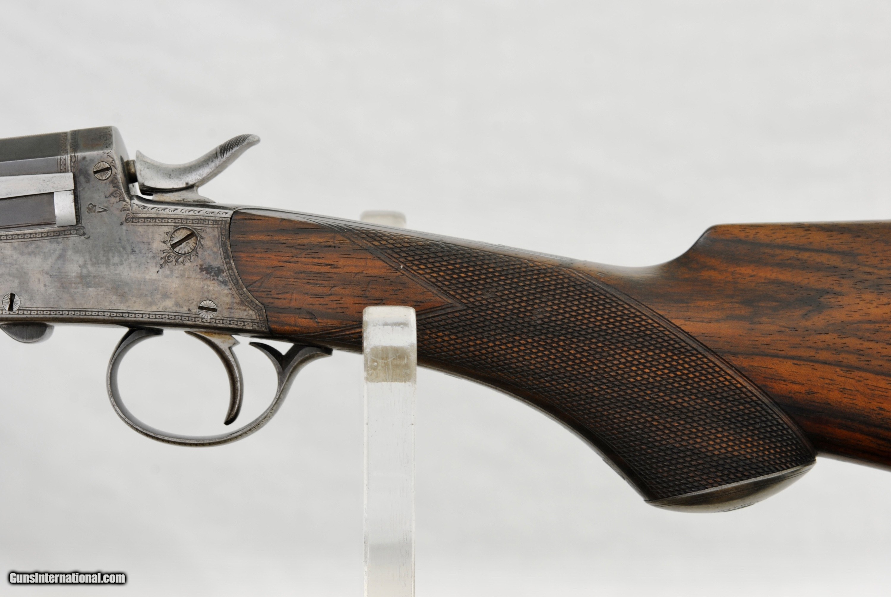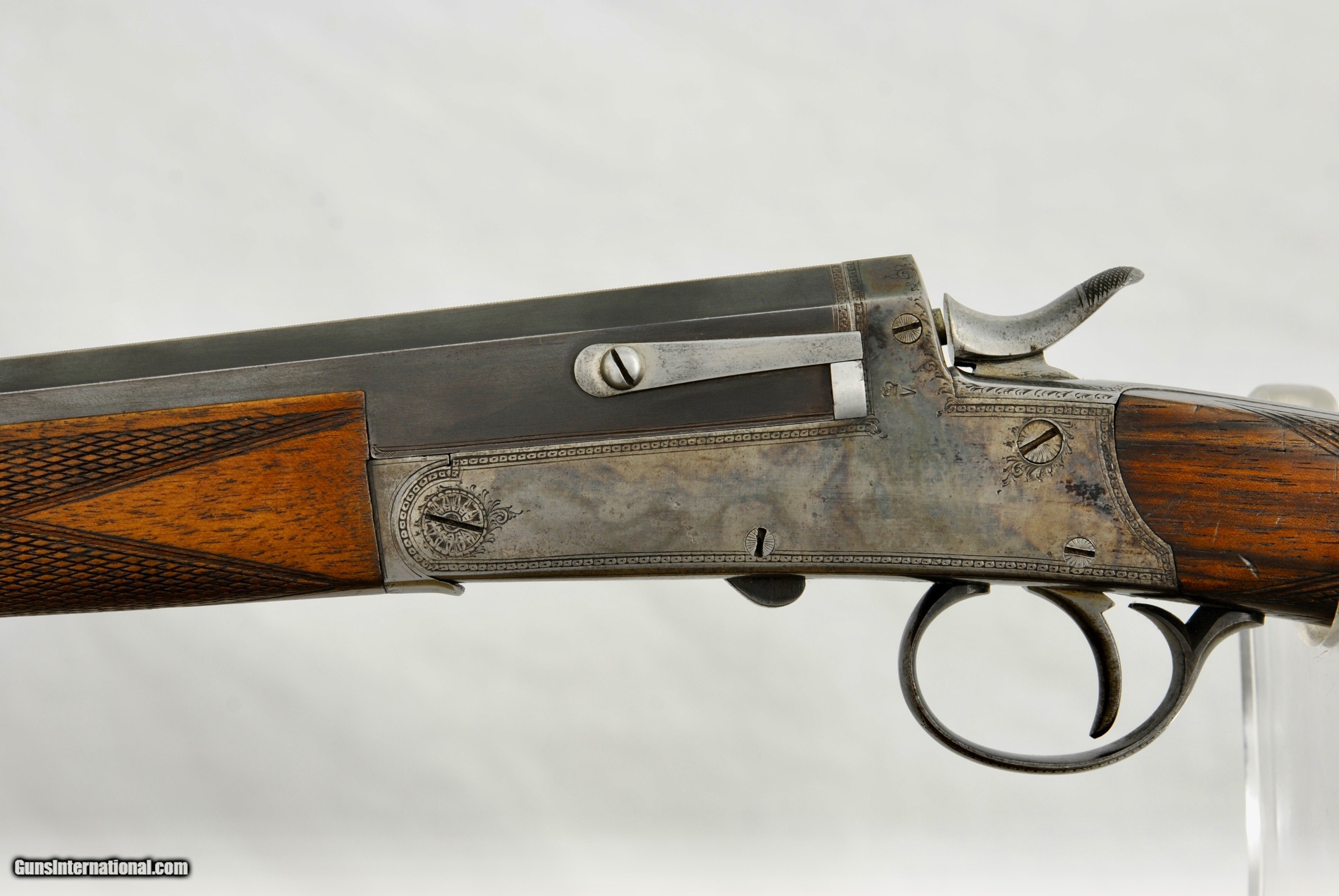 Description: Army Navy London Rook Rifle in 300 Rook. This high condition pre-1898 little rifle has many high quality features. Octagon 27" barrel with one standing sight marked "50" and two flip ups marked "100" and "150". Front blade sight with serrated. end to reduce glare. Mint bore with well defined rifling. Side lever opening with an automatic ejector system. Stock has a remarkable amount of figure for a rook rifle. Forend has a high polished horn tip. Well defined and lightly used checkering. Manual cocking system with high polished hammer. There is a generous amount of original case color in protected areas. Metal trigger guard and grip cap. Lightly and tastefully engraved. Gun is London Nitro Proofed with the specifics stamped on the underside of the barrel (Twist 1-18/4 Grains of Cordite/80 Grain Bullet). 300 Rook brass is available from multiple sources in the USA. The balance on this gun is remarkable - about 1" in front of the hinge pin. Weight of the gun is 5 LBS 8 1/2 OZ. The aesthetics of the stock are attractive with a full size LOP of 14 1/2". As an antique, this rifle can be shipped directly as local law allows. Shipping is $75. A London Best Rook Rifle that is a joy to shoot! SOLD Antique: Yes Rifle Caliber: .300 Rook |