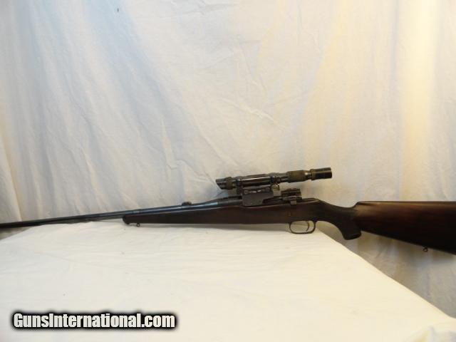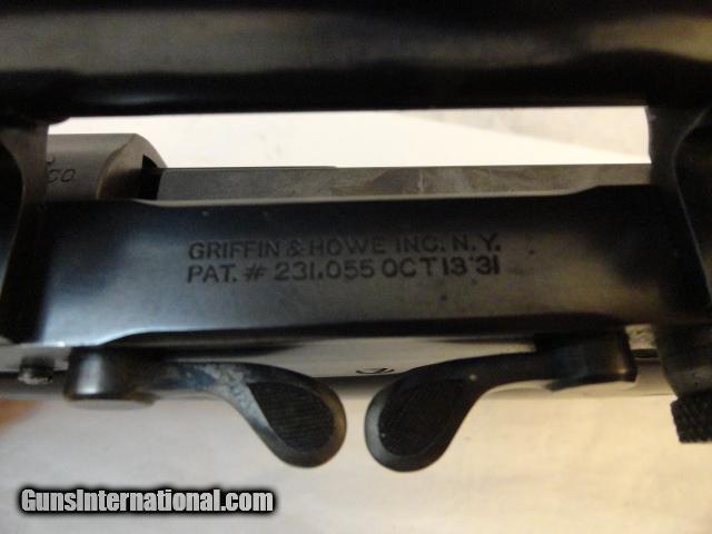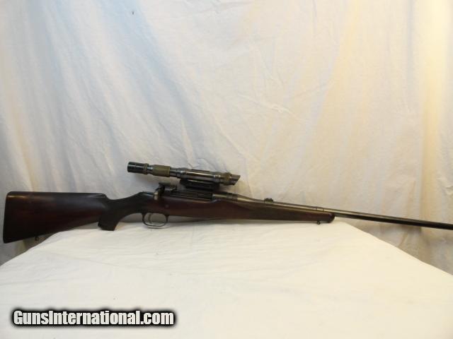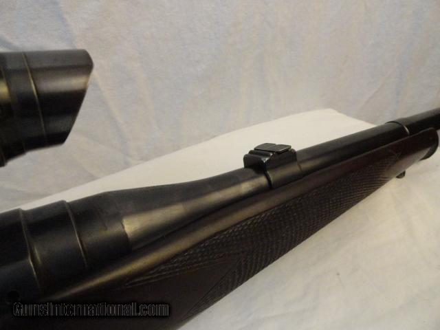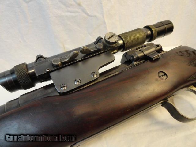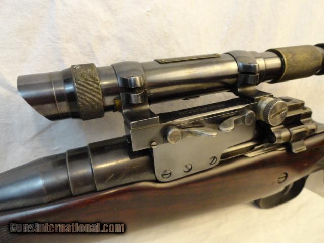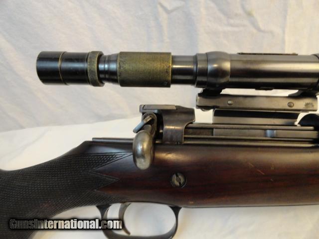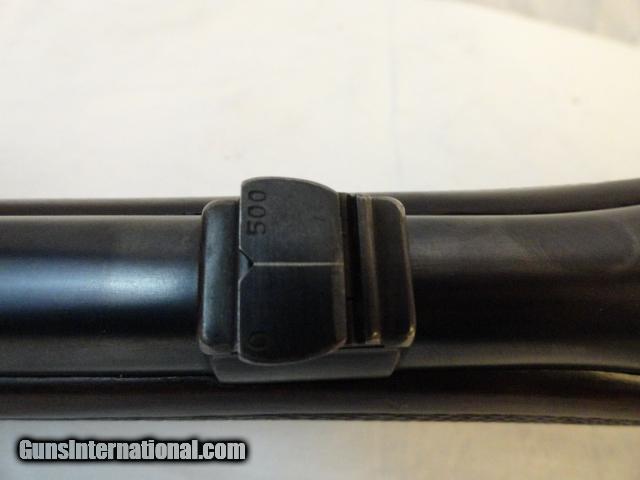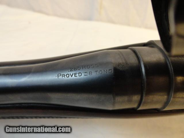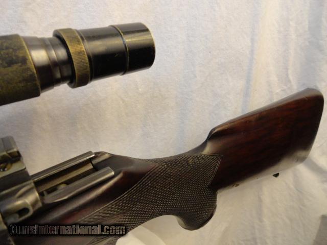 Aside from some minor blue loss on the front sight band and floor plate, gun retains all the original factory blue. It features two leaf fold down rear sight. Really stunning dark walnut stock with sharp as new checkering. Neidner style fine checkered butt plate. Mint bore and action in .280 Ross caliber. What sets this rifle apart is the Ross Rifle company marked scope with G&H quick release side mounts.
