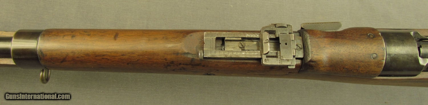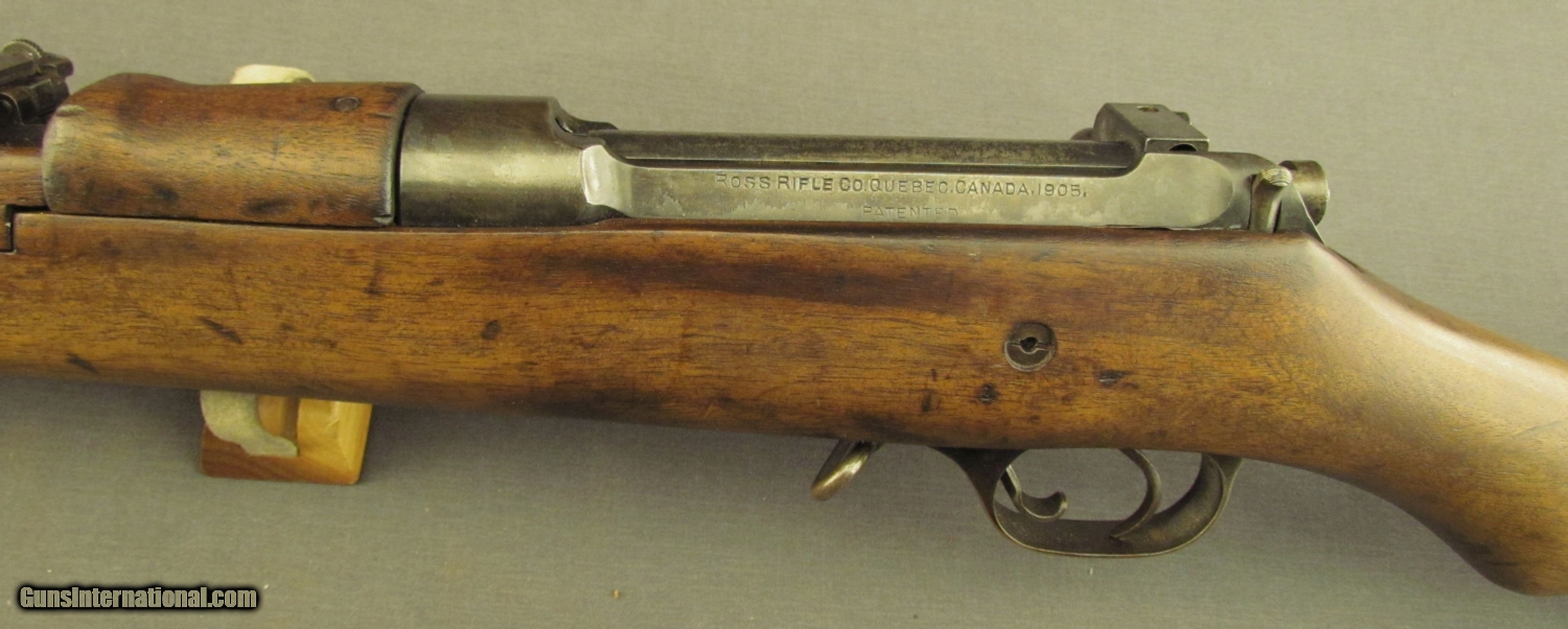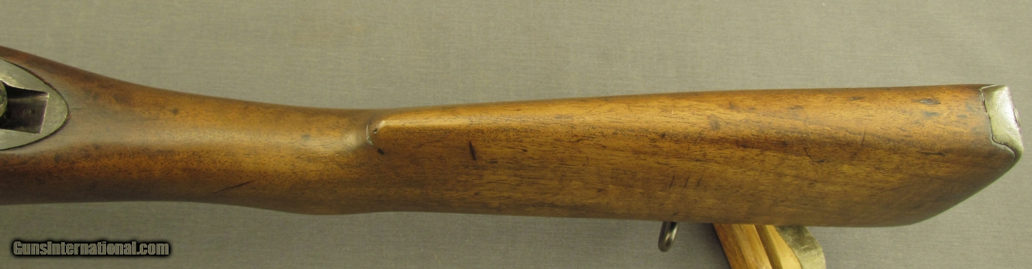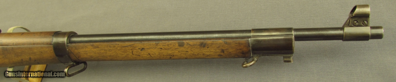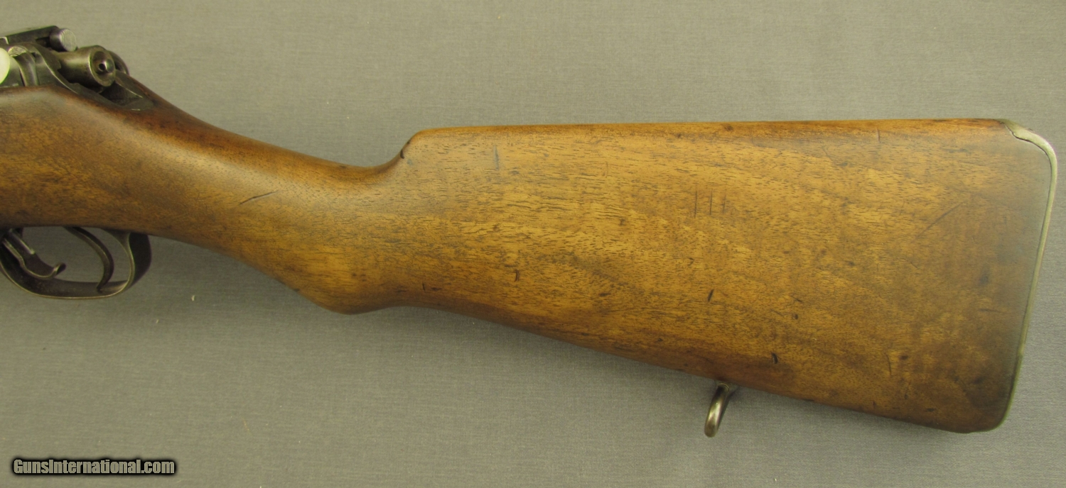 Description: Serial #17092, .303 British, 28” barrel with a very good bore that has some light freckling within the grooves. This well-traveled rifle has about 70-75% of the original blue remaining, mostly on the barrel, with the balance turned to an overall plum-brown on the receiver and having mild silvering at the muzzle and along the projecting edges. There are spots of mild freckling on the bolt, mainly along the top of the body and on the handle. Some further fading and freckling is present on the adjustable rear sight and on the Harris magazine thumb-piece. The walnut stock and handguards have an old added armory oil finish over numerous small handling marks minor surface blemishes. Extensive Canadian unit markings are present on the right side of the buttstock along with further U.S. Ordnance Dept. markings on the underside of the wrist applied when the rifle was issued as a training and reserve rifle during the initial build-up to U.S. entry into World War I. This is a great example of a Canadian and U.S. marked Mk. II* Ross military rifle in very good plus-near fine condition overall, and would make an exceptional addition to either a Commonwealth or U.S. military collection. {Ref. “The Ross Rifle Story” by Phillips, Dupuis, and Chadwick; 1984} FFL or C&R SOLD Curio/Relic: Yes Manufacturer: Ross Model: 1905 Serial Number: 17092 Caliber Info: .303 Gauge Info: .303 |