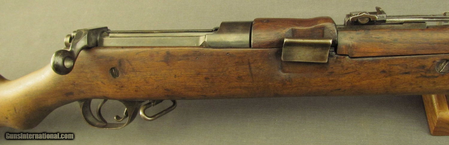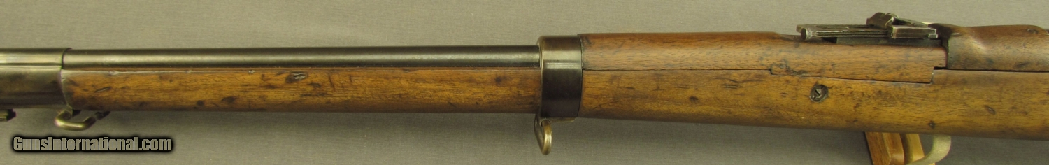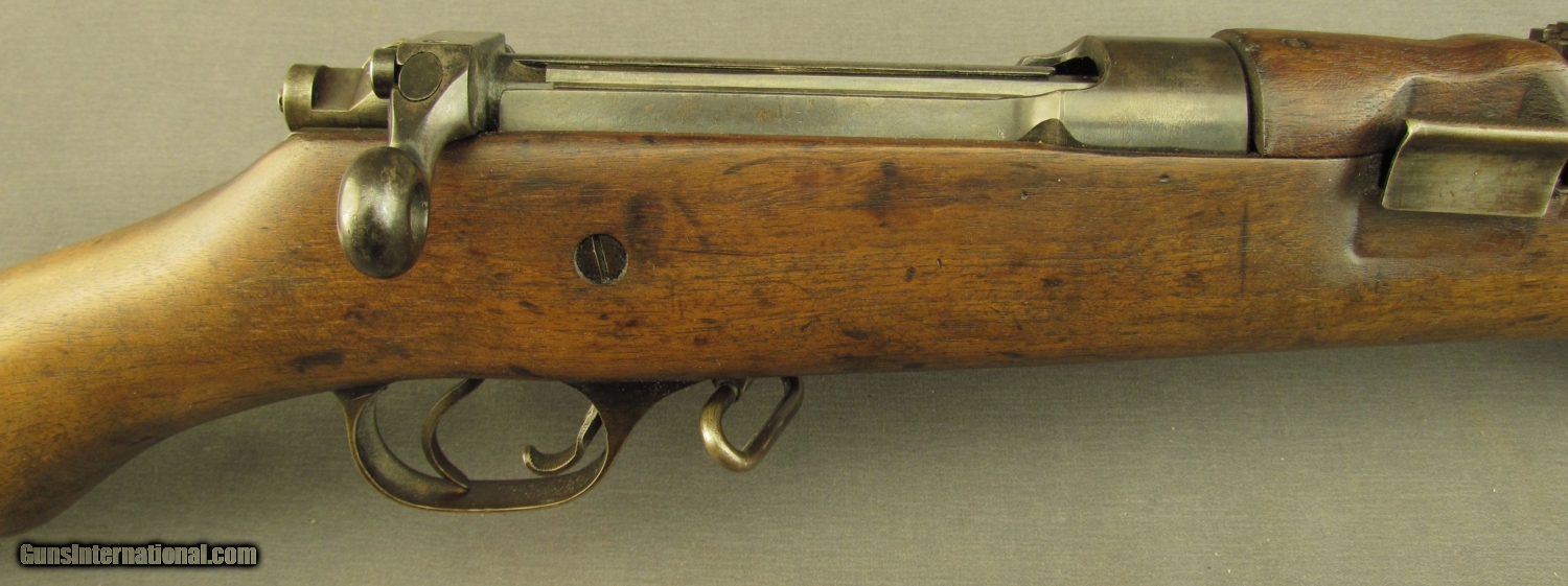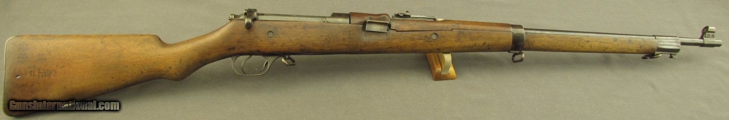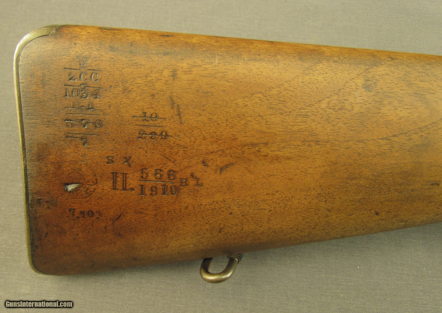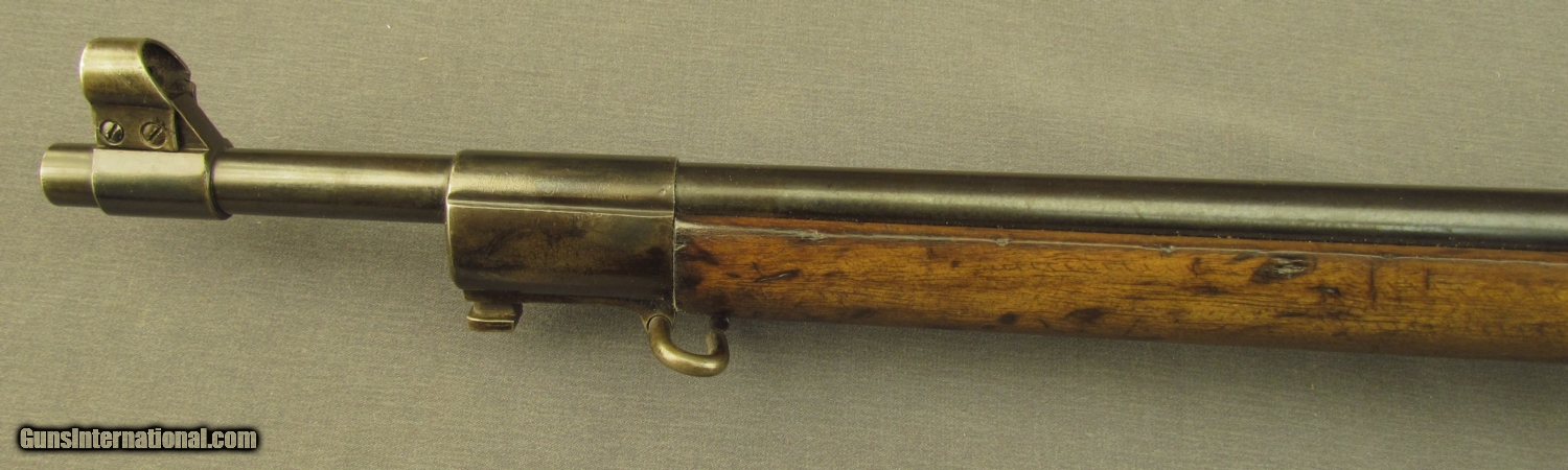 Description: Serial #17092, .303 British, 28” barrel with a very good bore that has some light freckling within the grooves. This well-traveled rifle has about 70-75% of the original blue remaining, mostly on the barrel, with the balance turned to an overall plum-brown on the receiver and having mild silvering at the muzzle and along the projecting edges. There are spots of mild freckling on the bolt, mainly along the top of the body and on the handle. Some further fading and freckling is present on the adjustable rear sight and on the Harris magazine thumb-piece. The walnut stock and handguards have an old added armory oil finish over numerous small handling marks minor surface blemishes. Extensive Canadian unit markings are present on the right side of the buttstock along with further U.S. Ordnance Dept. markings on the underside of the wrist applied when the rifle was issued as a training and reserve rifle during the initial build-up to U.S. entry into World War I. This is a great example of a Canadian and U.S. marked Mk. II* Ross military rifle in very good plus-near fine condition overall, and would make an exceptional addition to either a Commonwealth or U.S. military collection. {Ref. “The Ross Rifle Story” by Phillips, Dupuis, and Chadwick; 1984} FFL or C&R SOLD Curio/Relic: Yes Manufacturer: Ross Model: 1905 Serial Number: 17092 Caliber Info: .303 Gauge Info: .303 |