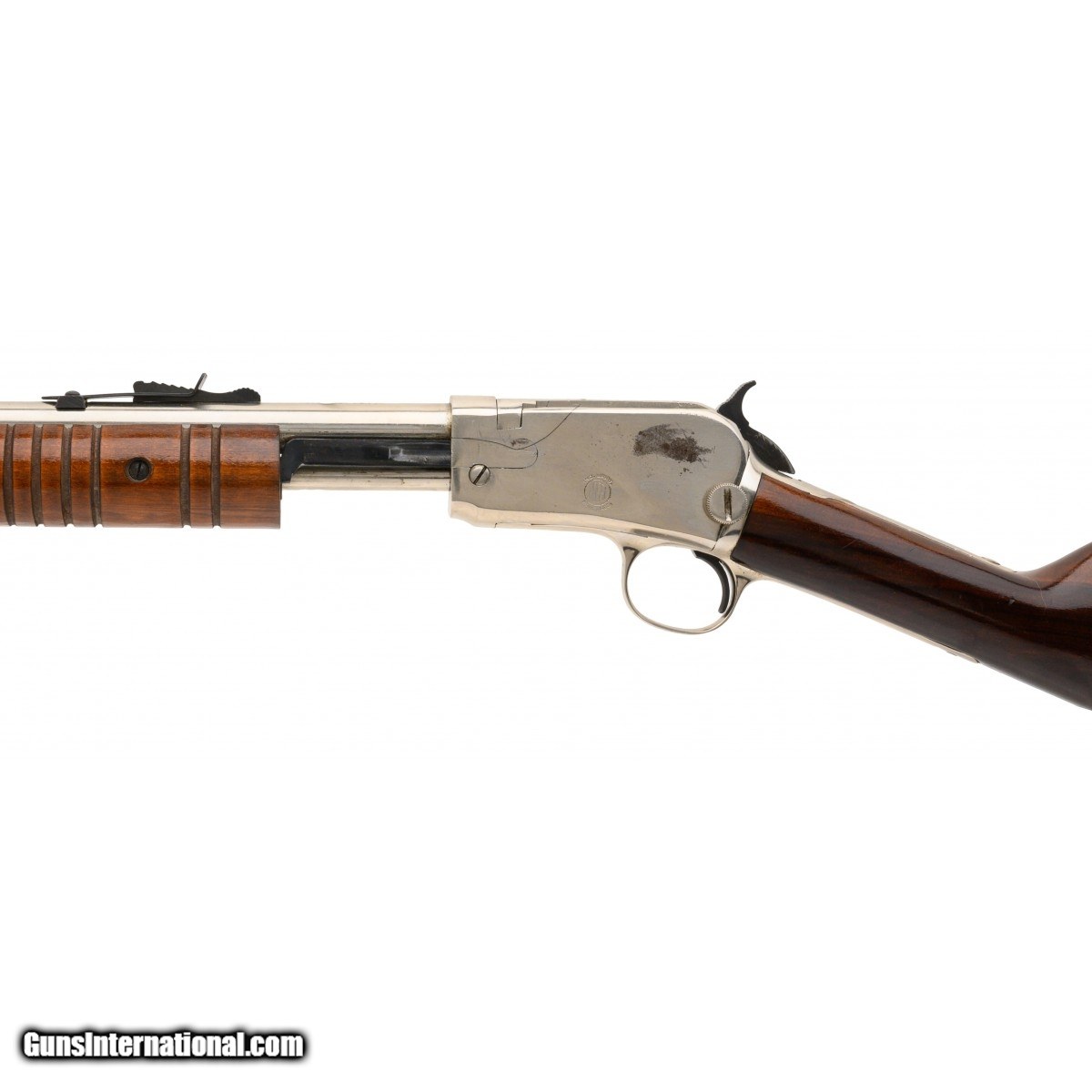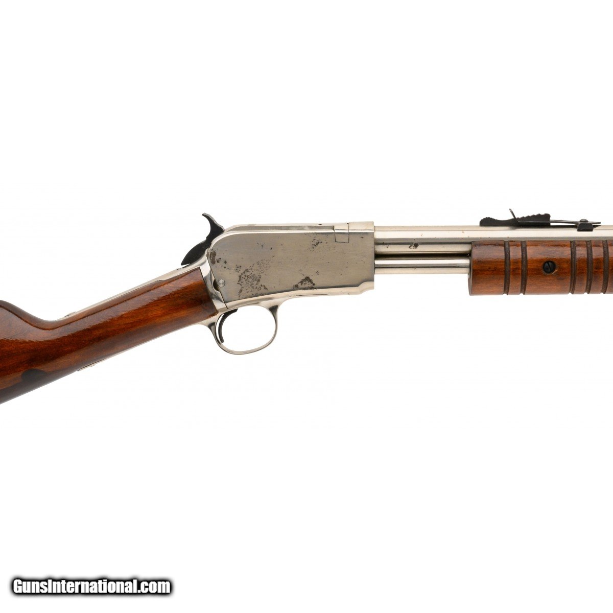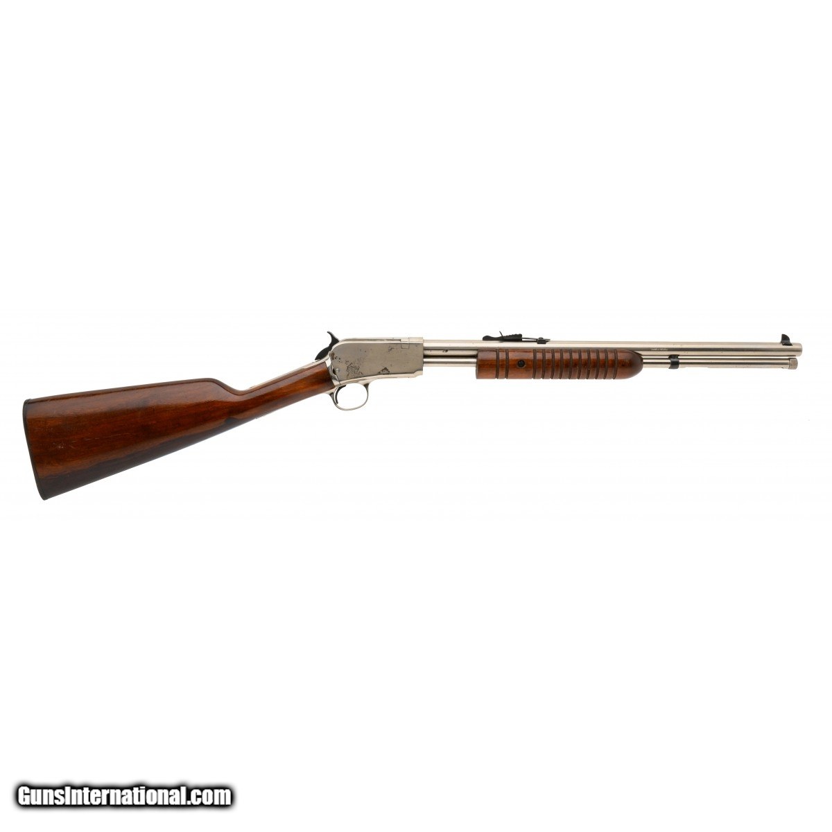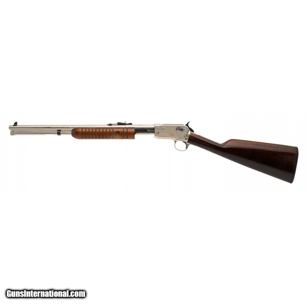 Description: " SN:G182208. Modern production. .22 S/L/LR with a 16.5" barrel. Bore is very good. Pump action .22 rifle. Nickel finish is in good condition with wear noted on the receiver. Wood furniture is in good condition with handling wear noted on the stock. Overall good condition. SOLD |