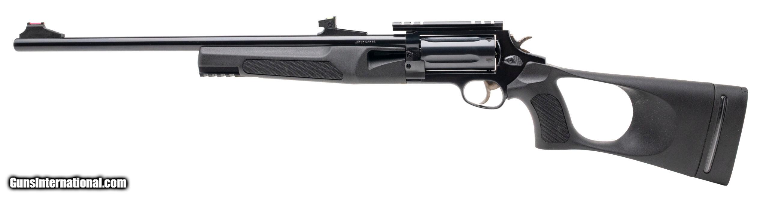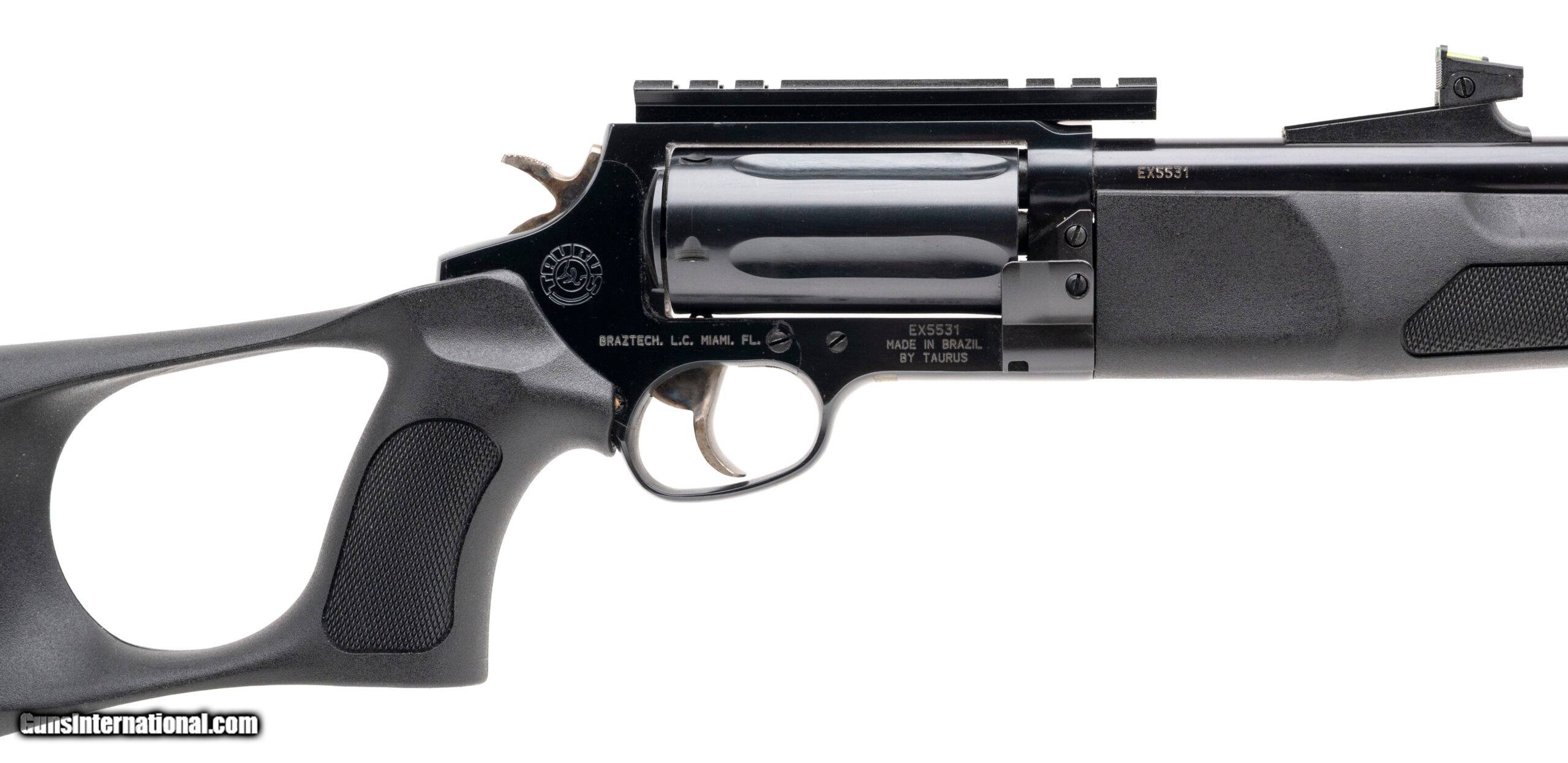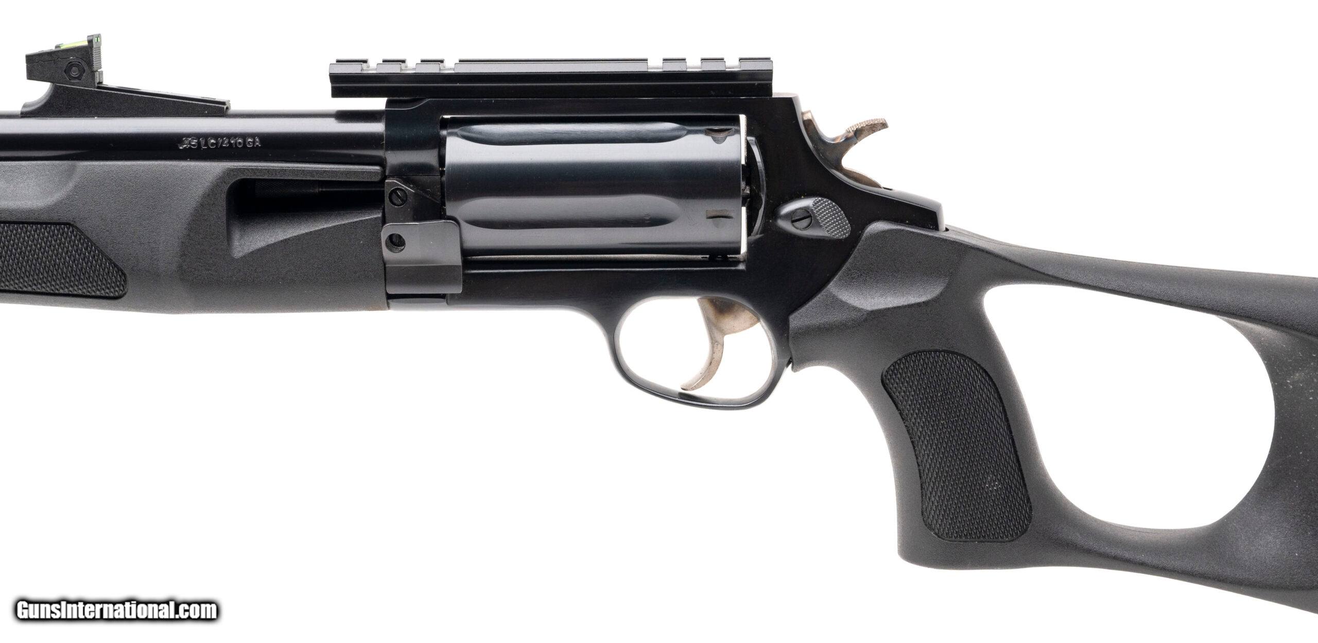 Description: "SN: EX5531. Modern production, .45 Colt/.410 Gauge with an 18.5"" barrel chambered for 3"" shells. Bore is excellent. Double-action revolving hybrid rifle with a fiber-optic front & rear sight, 5rd cylinder, picatinny optic rail, blued finish, and black checkered thumbhole synthetic stock w/integrated picatinny accessory rail. Stock shows minor marks. Includes original box. Overall condition is near excellent. Price: $749.95 Contact Seller |