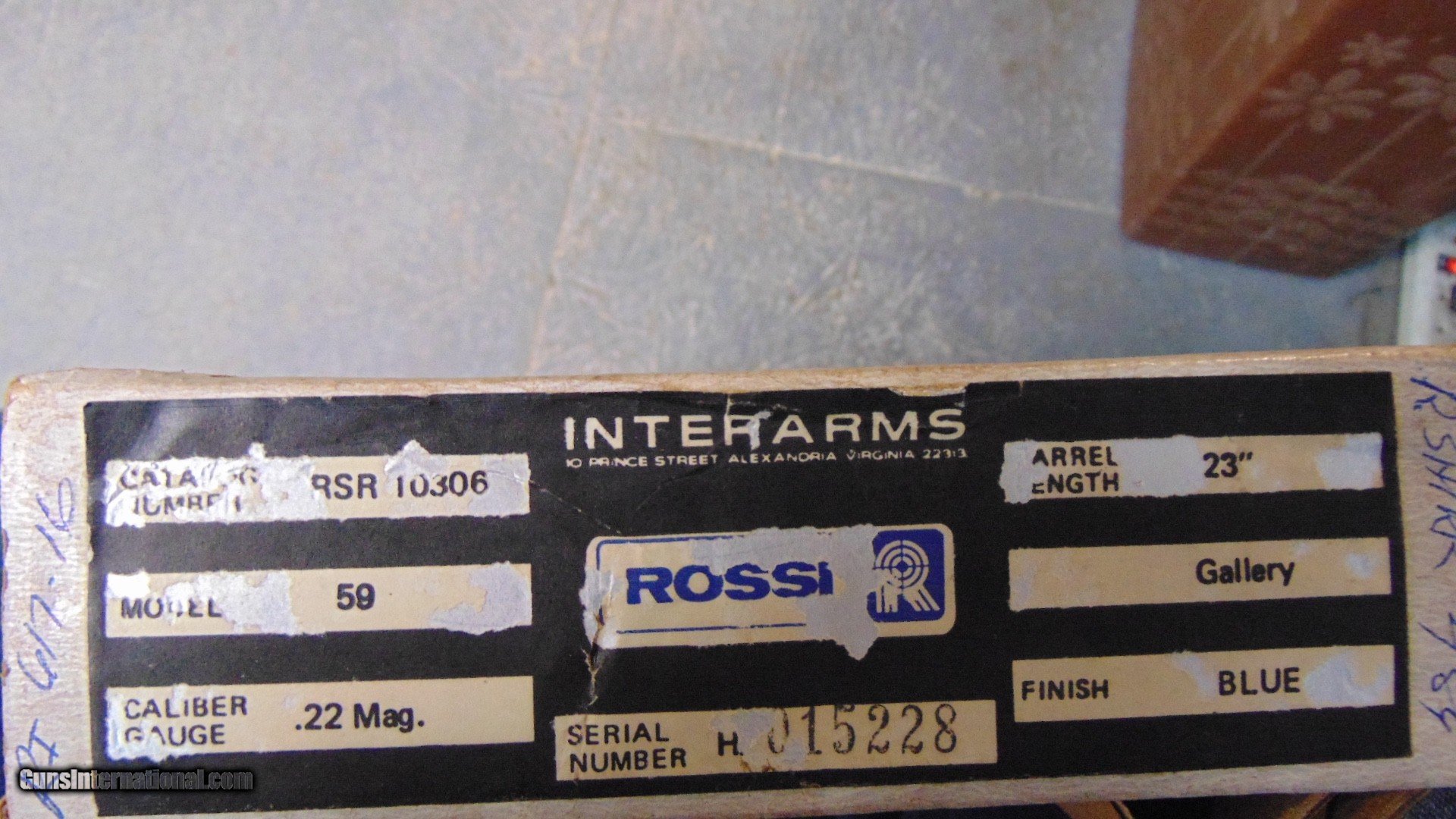 Description: !!! SOLD !!! Rossi Model 59 Gallery Rifle,22 Magnum,23" Round Barrel, Blued,Pre- Safety, Importer Interarms Alexandra,VA., Appears New in Box with Papers!! Store Hours-Thurs-Fri-10AM-8PM Sat-9AM-12PM All Other Times Please Leave a Message, Thank You! Lower 48 State Sales Only No California Sales 6% Pa Sales Tax Applicable Shipping $35.00 SOLD Rifle Caliber: .22 WMR (.22 Magnum) Manufacturer: Rossi Model: 59 Gallery Serial Number: H015228 Barrel Length: 23 |