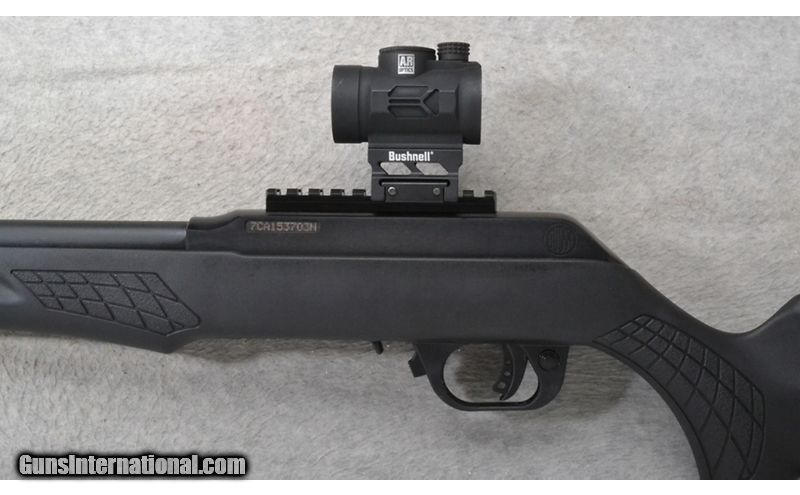Description: This Rossi Model RS22M is a right hand semi-auto rifle in .22 Magnum Cal. It has a 21 inch barrel. It is outfitted with a Bushnell AR Optics red dot sight. No iron sights. The butt stock is a textured grip black polymer pistol grip. The forearm is a smooth grip black polymer with finger grooves. It has a marksman trigger. .22 MAG SOLD Chambers: 10 shot. Metal Condition: Excellent. A couple of minor handling marks. Bore Condition: excellent. Barrels: 21 inch. Triggers: Marksman trigger. Stock Dimensions: LOP 13 3/8 inches. Fore End: Smooth grip black polymer with finger grooves. Butt Pad: Grooved black polymer. Weight: 5 lb. 12 oz. Sights: Bushnell AR Optics red dot sight. No iron sights. Item Location: Richfield, WI |