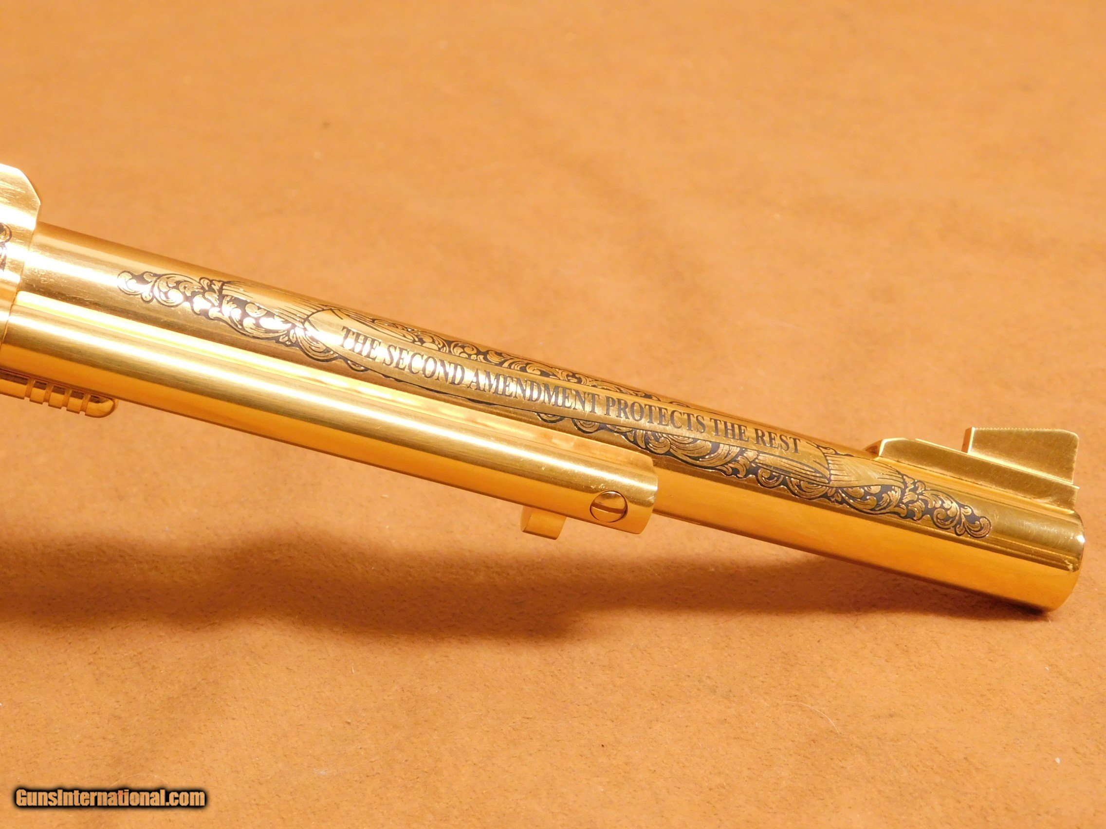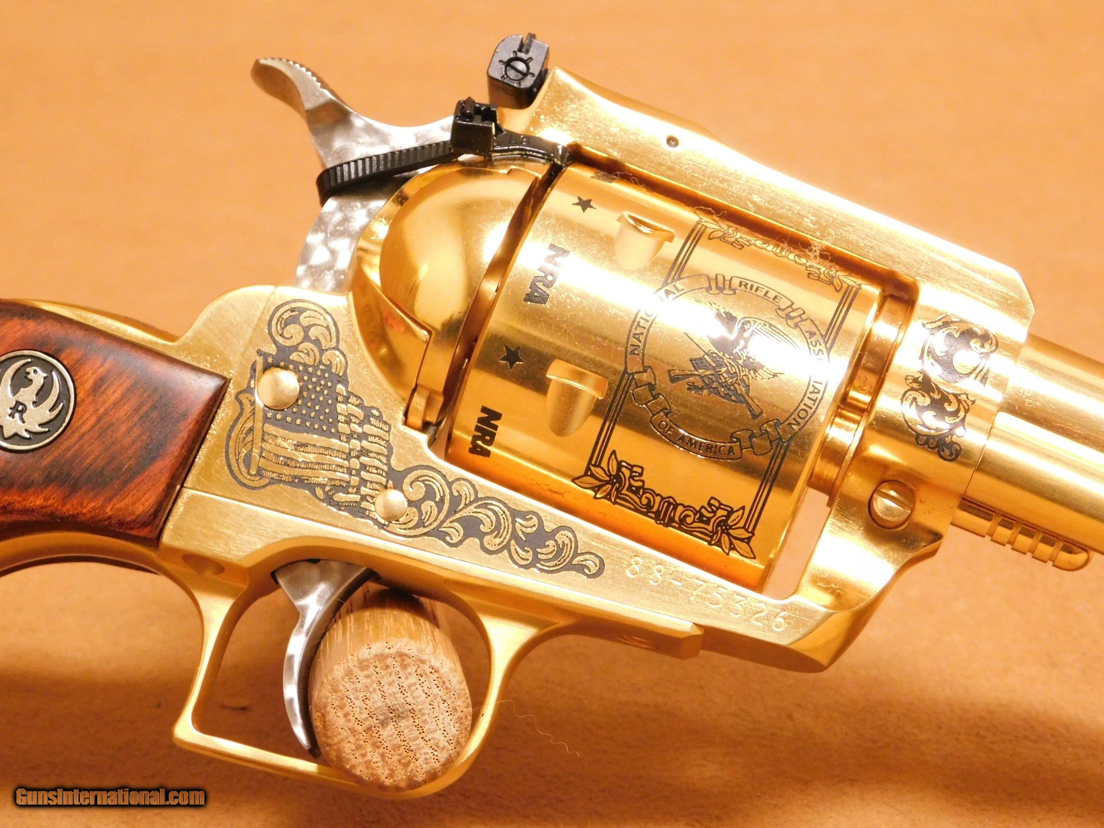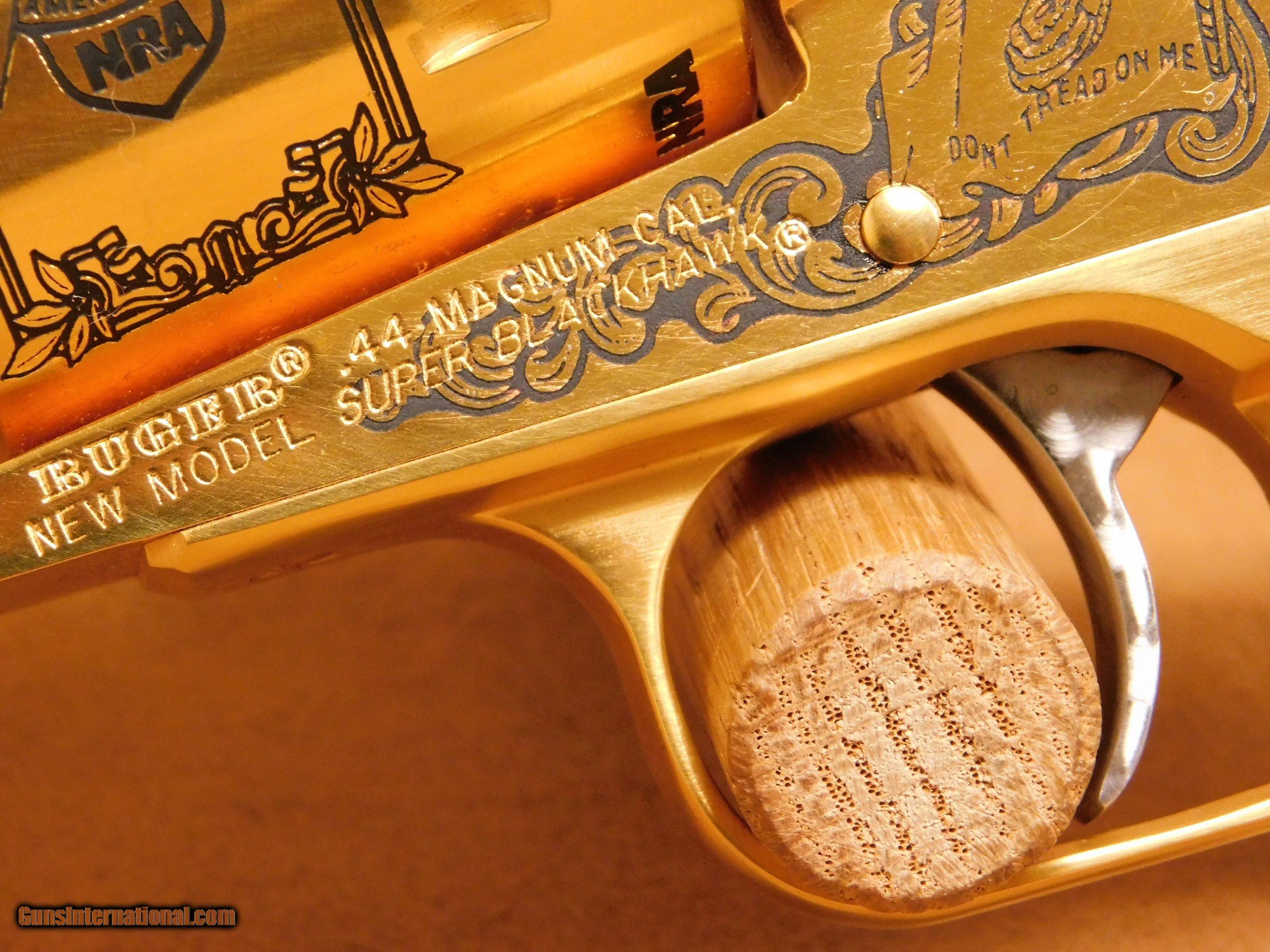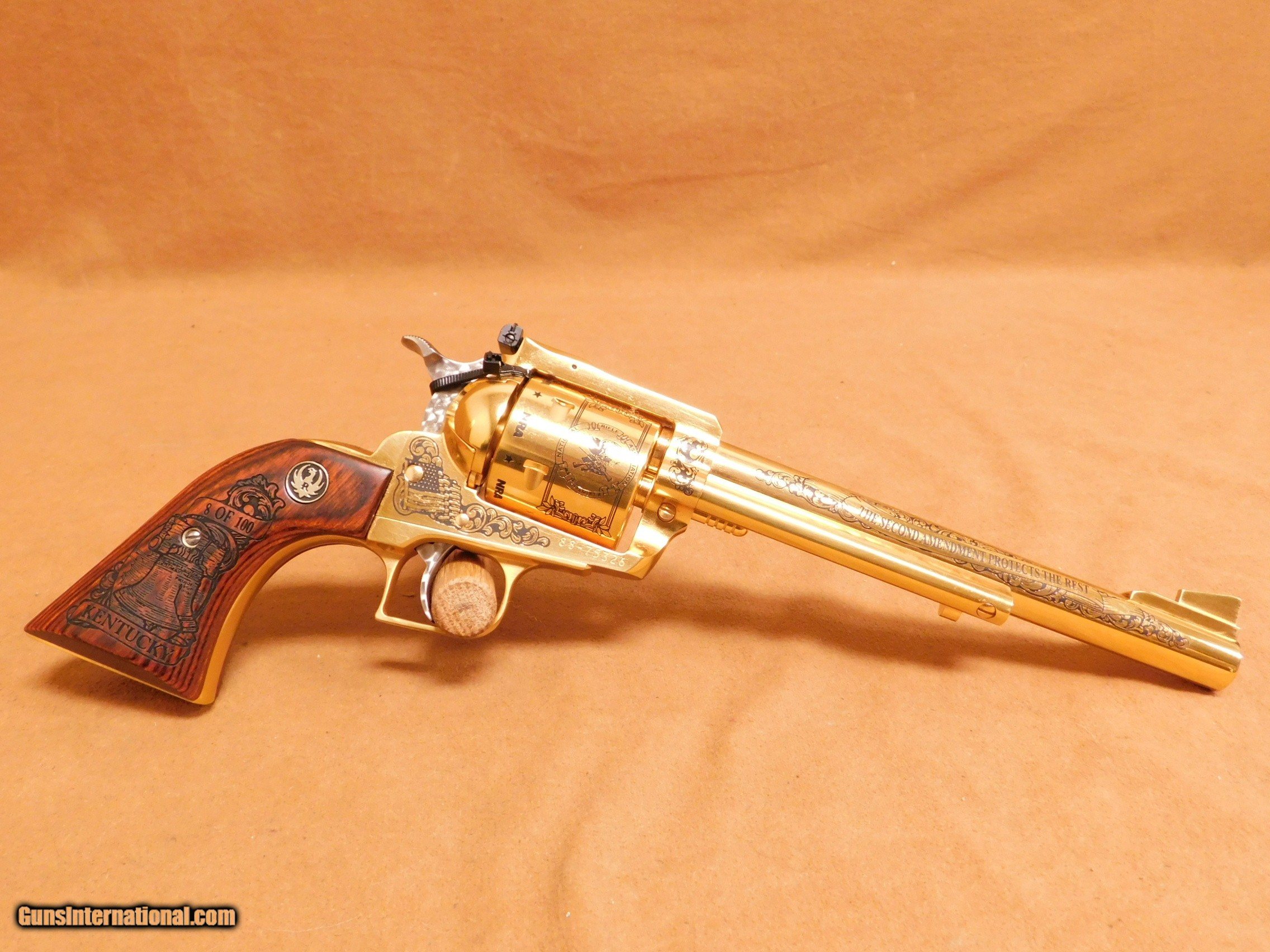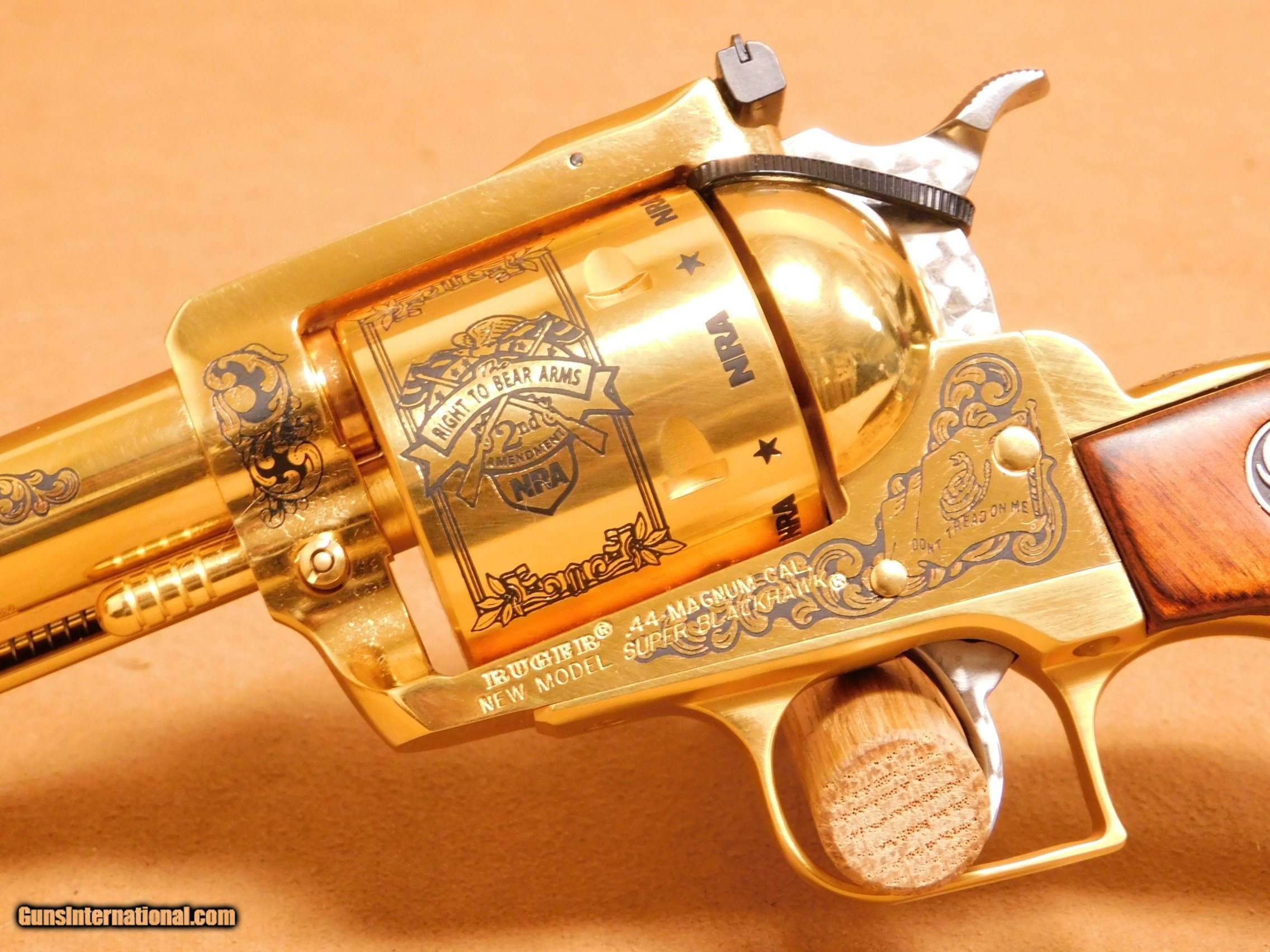 Description: This is a Ruger New Model Super Blackhawk NRA Commemorative. 100 of these were made for every state, and this is number 8 of 100 for Kentucky. This is a very nice looking revolver, featuring a beautiful full gold wash finish. It includes its NRA/2nd amendment display case. By the looks of this gun, it does not appear that its cylinder has been turned. This is a great collector piece for any NRA member or advocate for the 2nd amendment. All items are also available for sale in our brick & mortar store and are subject to prior sale. Think long, think wrong. Payment On firearms, we typically only accept credit cards or money orders/cashier's checks.