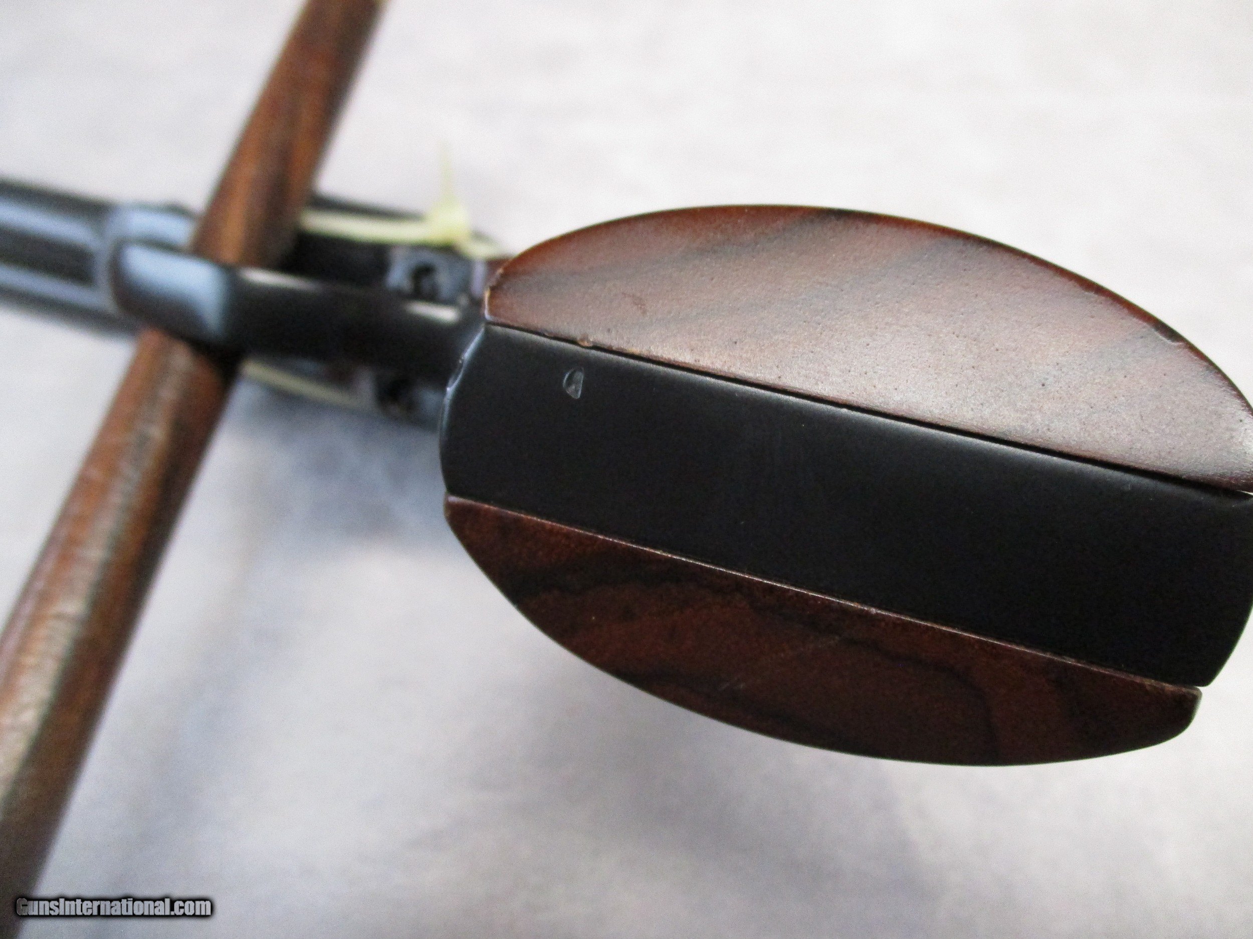 Description: The Single Six can be considered as the definitive 22-caliber single action revolver. It has been used for a variety of purposes ranging from target shooting to varmint hunting, whether it be for the acquisition of food or fur-selling. The convertible is a very popular variation of the classic Single-Six, as it comes with not one, but two cylinders. One cylinder is chambered for the 22 Long Rifle while the other is chambered for the 22 Magnum. The 22 Mag cylinder is non-fluted and clearly marked for the 22 Magnum cartridge. The Magnum cylinder is for the 22 Mag only. The difference in dimensions between the two rounds prohibits the use of 22 Long Rifle in the mag cylinder. The example shown is the special 50th Anniversary Edition made to commemorate 50 years of Ruger firearms. It is in like new condition and comes with its special red plastic box with the special emblem on the top. It has not been fired since leaving the factory. Indeed, it still has the yellow plastic chamber insert in the cylinder. As this firearm is also displayed in our store, the zip tie has been added to prevent anyone from cycling the action and putting a turn ring on the cylinder. The 22 Magnum cylinder remains sealed in the bubble wrap. There is some light pitting on the trigger and hammer, and a small ding on the bottom of the trigger guard. The former issue is due to the pistol being stored in the box for many years. Please see the pictures. All of the original paperwork is in the box. The second picture has been altered to hide Ruger’s FFL # which the put on the label for the envelope housing the fired case for testing purposes. The actual envelope has not been altered in any way, only the picture. This Ruger would make a nice addition to any Ruger collection. SOLD Handgun Caliber: .22 Long Rifle, .22 WMR (.22 Magnum) Manufacturer: Sturm, Ruger & Co., Inc. Model: Single Six 50th Anniversary Edition Serial Number: 268-36921 Bore: Rifled, 1-in-14” RH twist Chambers: 6 Ejectors: Manual, ejector rod Condition: Like New in Box Barrel Type: Round Action: Single-Action Triggers: Single Action Army trigger Stock: Wood grips with Ruger Medallions Finish: Blued Sights: Fixed, u-notch rear, half-moon front, sight radius 5.5 inches (140 mm) Manufacture Date: June 26th, 2003 Engraving: Ruger 50th Anniversary Markings Case: Ruger Box |