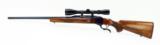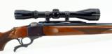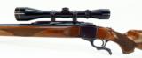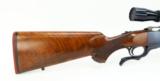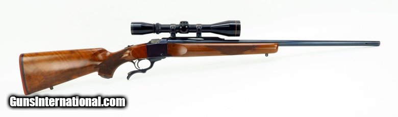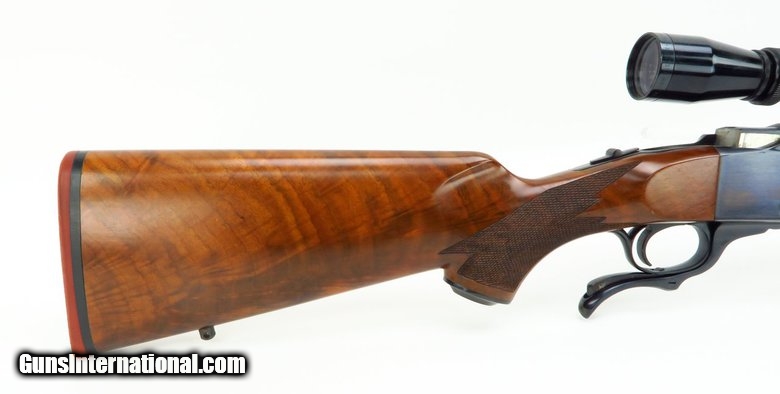 Ruger No.1 7mm Rem Magnum caliber rifle. Single shot sporter with extra fancy feathered walnut. The barrel has been Mag-Na-Ported. Excellent condition with Leupold 3x9 scope.