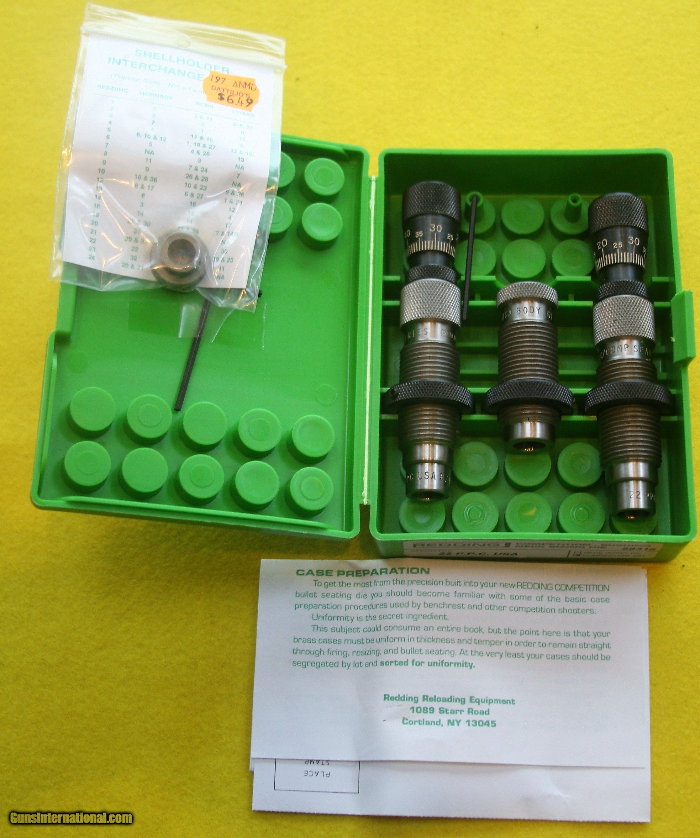 Description: PENDING APPROVAL UNFIRED, NEW Ruger No. 1 in the extemely accurate .22 PPC for sale at a quick sale price. You will not be dissatisfied! Make sure to notice how nice the wood is. I would ask the distributors to select the best wood possible. This unfired heavy barrel #1 will give you the chance to break it in properly. I know I used to take great pains in spending a long time to break in a barrel correctly thus allowing the best possible accuracy from the rifle. Always beware of barrels that have "shot out" by overheating. And... Includes Redding Competition Die set with holder. 150+ rounds of brand new Norma brass. All you need is powder and your favorite bullet and a primer. Checking the Midway site the Die set has a MSRP of $543 but sells for $353.99. Don't mistake the standard dies for the competition set - comp sets have micrometer adjustments. The brass when available was priced at $77.99/50 ($233 worth of brass) I would consider breaking out the dies and brass if requested. Unfortunately I have not been able to locate the box but I am still looking. In a move my boxes got a bit scattered about. I bought this years ago when I used to do a lot of long range varmit shooting but never took the time to load and shoot. I have several different rifles that I did this with. Just too much room in my safes and needed to fill them. Please review the hi-res photos and do not hesitate to request additional. I am happy to show you how perfect this rifle is. I will only ship to an FFL and will include a copy of my license for their use. Please forward me the address and a copy of their FFL. Shipping to most locations will be $65 which includes insurance. The Redding Competition Bushing Neck Sizer Die Set includes a Competition Bushing Neck Sizing Die, Body Die and Competition Seating Die. Both the Bushing Neck Sizing Die and the Competition Seating Die feature micrometer adjustments for precision. Bushings and Shellholder sold separately.