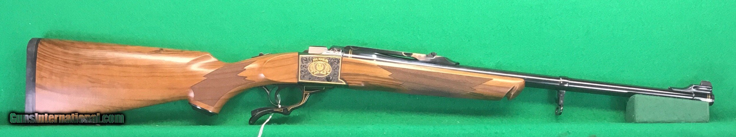 Ruger #1 50th anniversary 45-70, engraved with gold accents. Appears unfired.