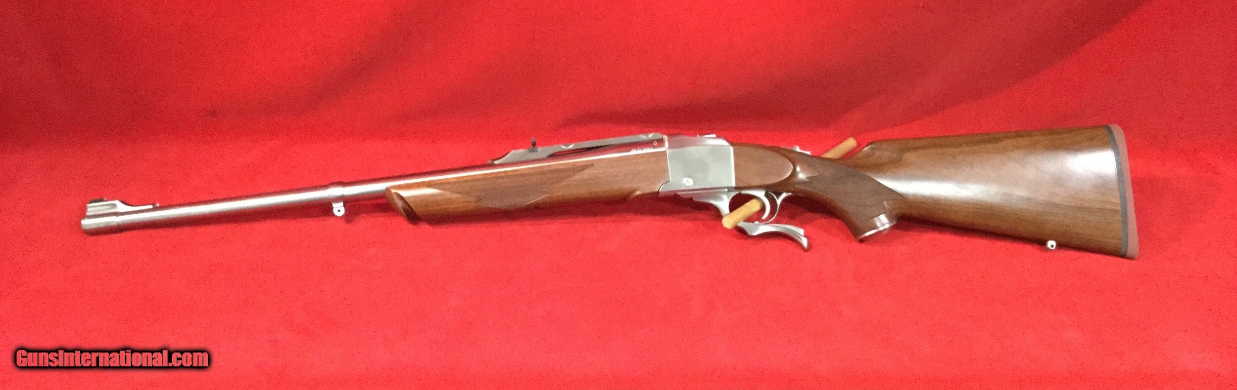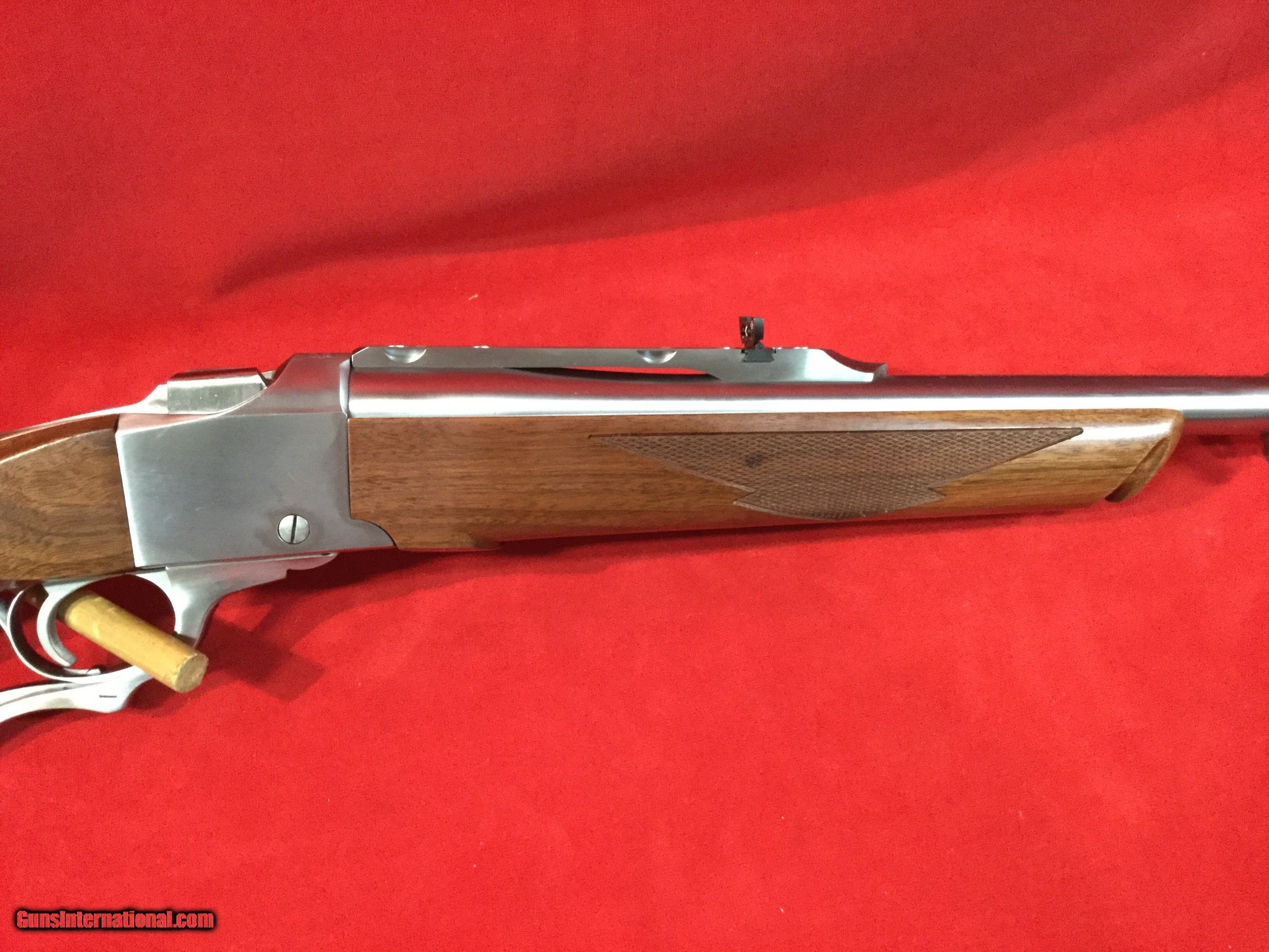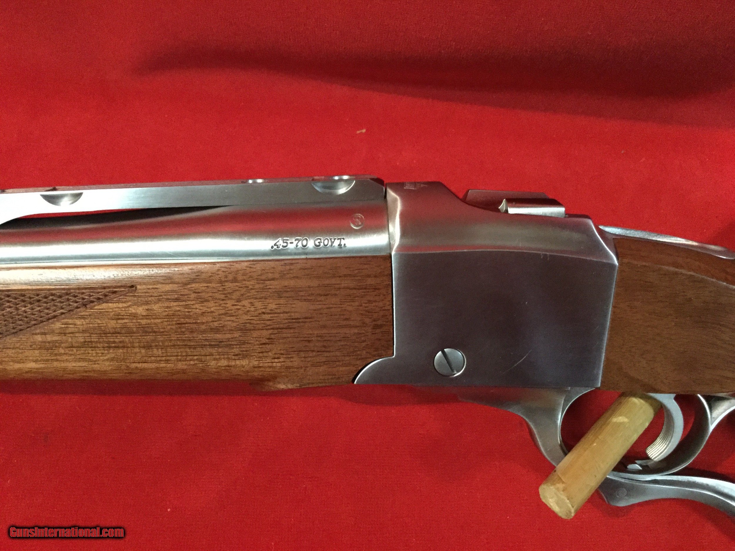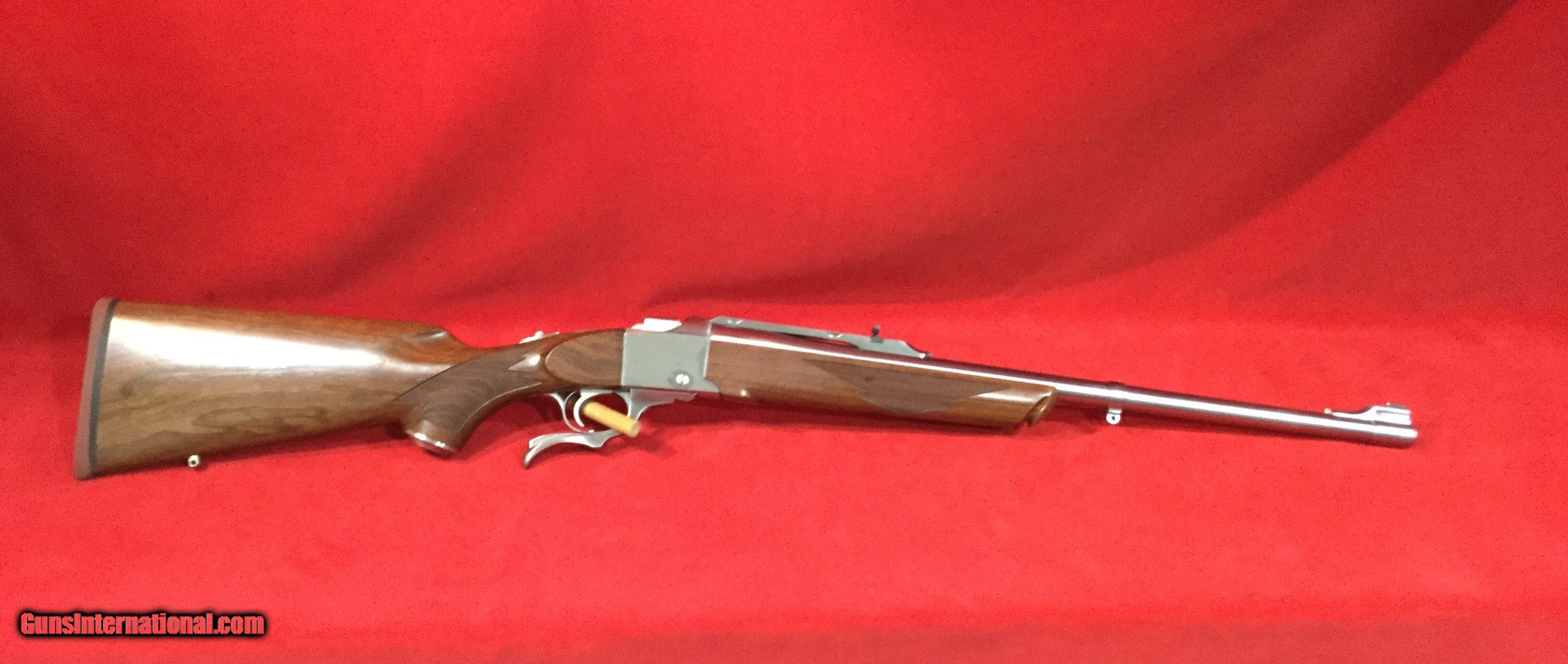 Description: Ruger #1 Brushed Stainless and walnut stock chambered in 45-70. 22" barrel with brass bead front sight. Rifle is lightly used with very little wear. Includes factory box and rings. $1495.00 plus $45.00 for shipping and insurance. Add 4% for credit card payments SOLD |