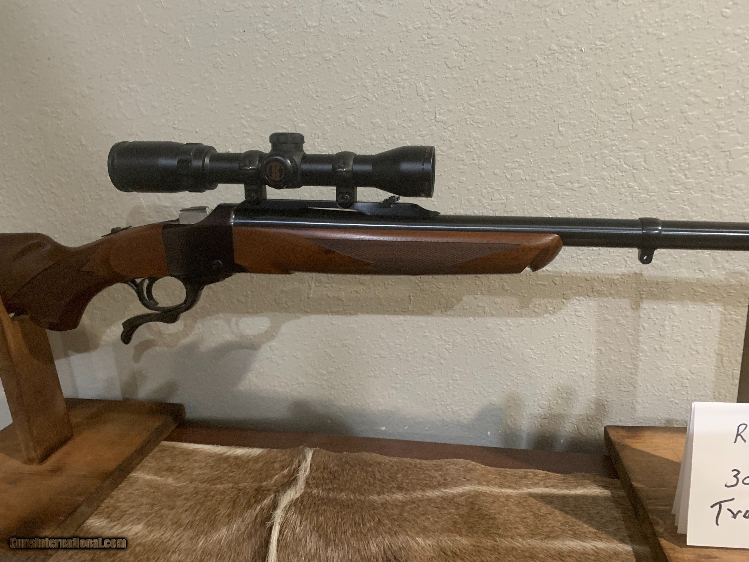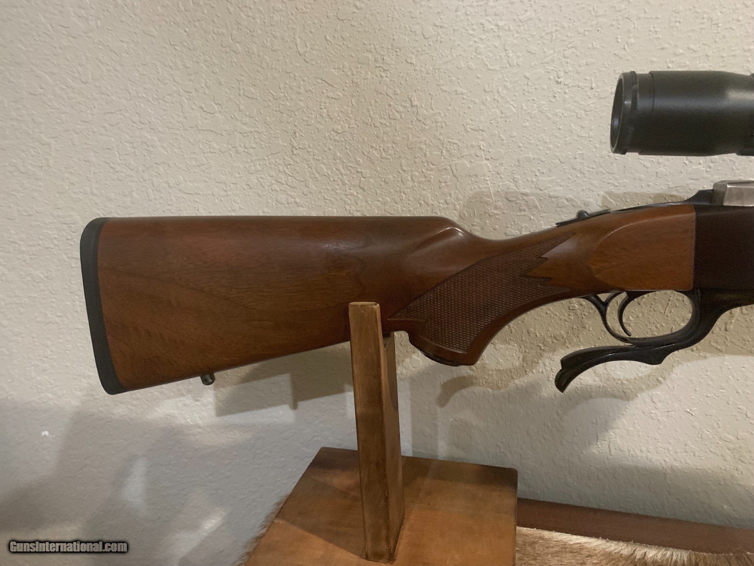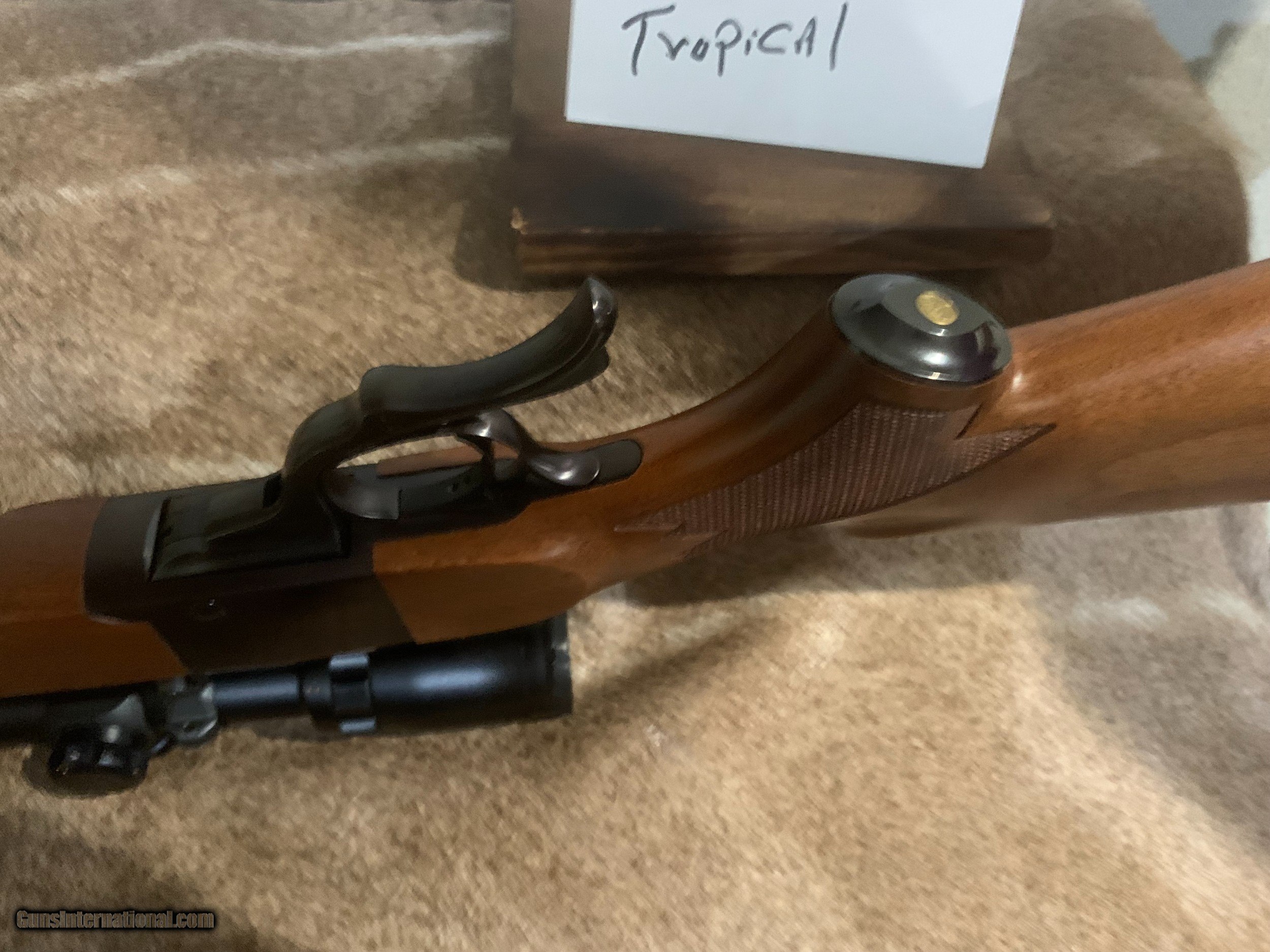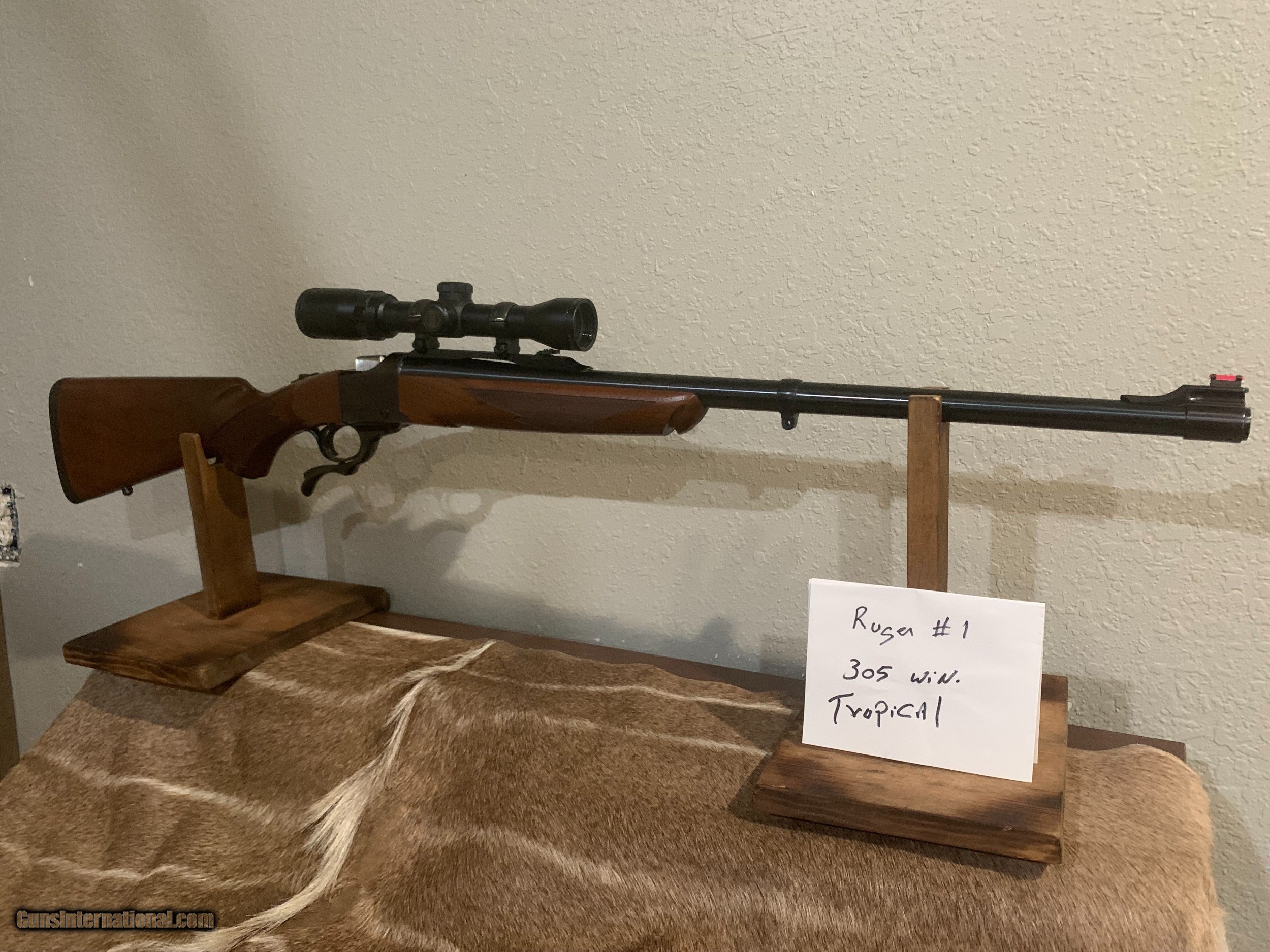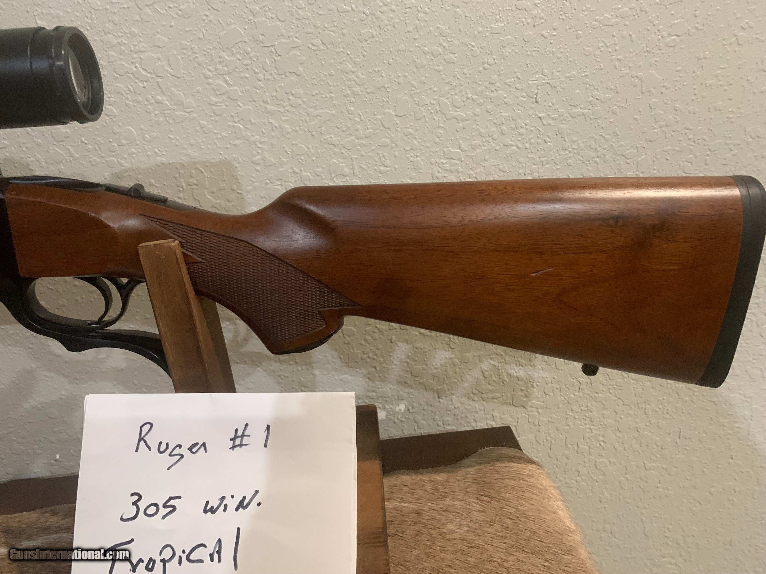 Description: This is a Ruger #1 Tropical in the great 405 caliber. The wood is very nice and carries a very nice grain and the barrel has excellent bluing . There is one very slight mark on the stock but is not very noticable. This is an excellent and hard to find caliber and makes and excellent large game rifle. This caliber is used to hunt large african game such as Buffalo , elefant ect. It will make a very nice addition to your hunting collection. It comes with 1 box of shells new in box and extra new brass and dies. THERE IS A MISTAKE IN LABELING THE PICTURES. THIS RIFLE IS NOT A 305 IT IS A 405 WINCHESTER. SORRY FOR ERROR. SOLD Rifle Caliber: .405 Winchester Manufacturer: Ruger Model: #1 Tropical Condition: excellent Metal Condition: excellent Wood Condition: excellent Bore Condition: excellent |