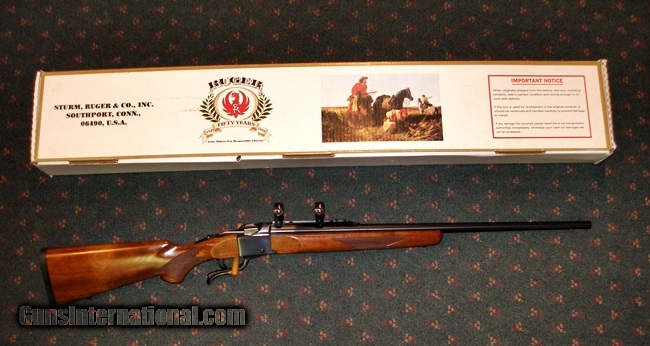 Description: RUGER 1-B 270 CAL RIFLE, 26" BBL, EJECTORS, SINGLE TRIGGER, MEDIUM DARK COLOR STREAKED WALNUT, PISTOL GRIP, LOP 13 5/8, 8LBS 6OZ, NO SIGHT, QUARTER RIB WITH SCOPE RINGS, IN ORIGINAL BOX, NEW & UNFIRED!!!! SOLD |