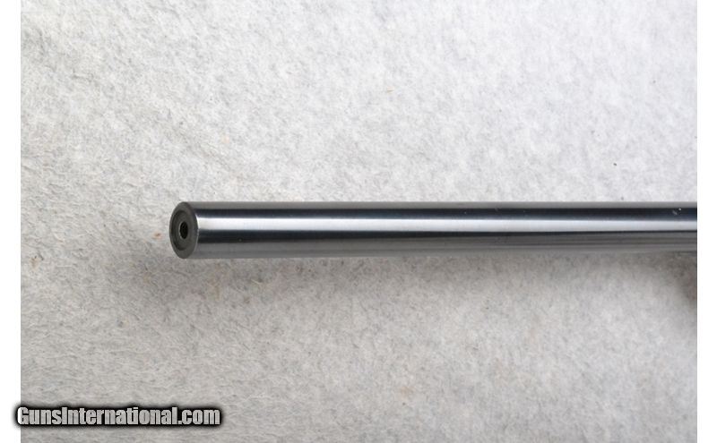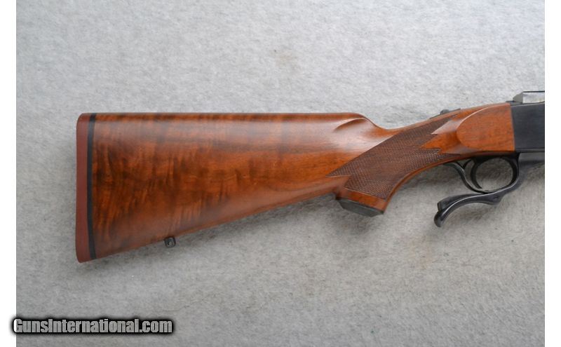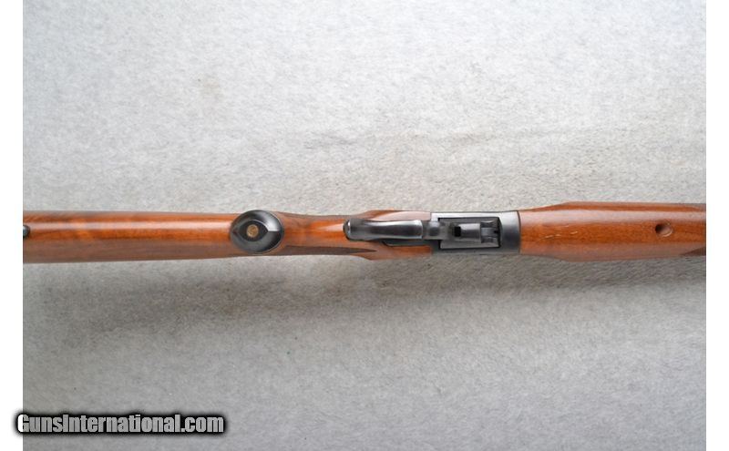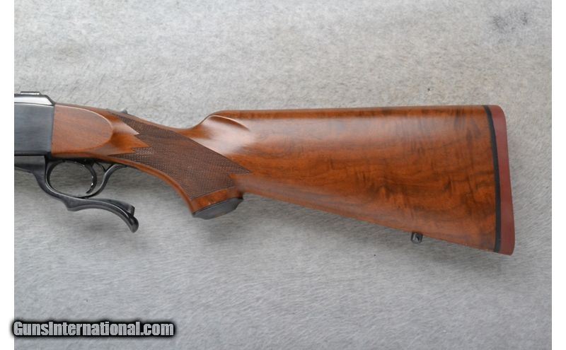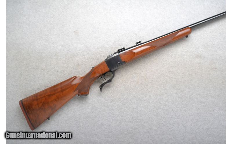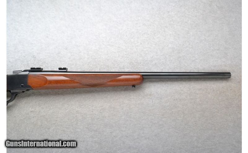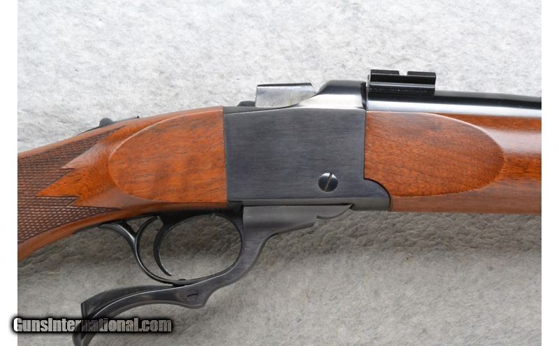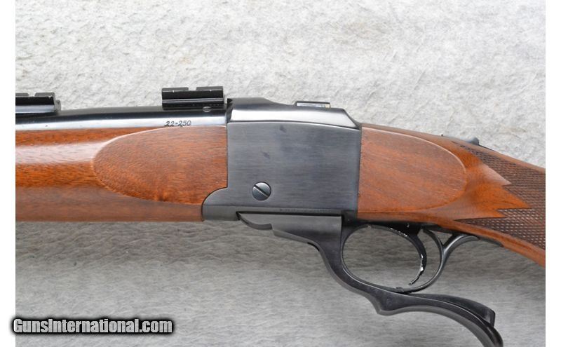 Description: This Ruger Model No.1 is a single shot falling block action rifle in .22-250 Rem. Cal. It has a 24 inch barrel. Scope mount bases are attached. No iron sights. It has a curved Farquharson lever. The butt stock is a checkered grip walnut pistol grip with a black cap. The forearm is a checkered grip walnut semi-beavertail style. S/N 132-77993. .22-250 Remington SOLD Chambers: Single shot. Metal Condition: Very good. A little very minor freckling. Light blue wear spot from use in the bottom of the barrel. Wood Condition: Very good. Some minor handling marks. Bore Condition: Excellent. Barrels: 24 inch. Triggers: Grooved. Adjustable. Stock Dimensions: LOP 13 5/8 inches. Fore End: Checkered grip walnut semi-beavertail. Butt Pad: Ruger red rubber pad. Weight: 8 lb. 8 Oz. Sights: Scope mount bases attached. No iron sights. Item Location: Richfield, WI |