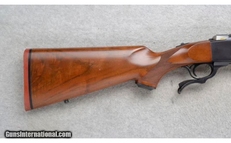 Description: This Ruger Model No.1 is a single shot falling black action rifle with a Farquharson lever in .22-250 Rem. Cal. It has a 24 inch barrel. Scope mount bases are attached. The butt stock is a checkered grip hardwood pistol grip with a black cap. The forearm is a checkered grip walnut. .22-250 Remington SOLD Chambers: Single Shot. Metal Condition: Excellent. Wood Condition: Excellent. A couple of minor handling marks. Bore Condition: Excellent. Barrels: 24 inch. Stock Dimensions: LOP 13 3/4 inches. Fore End: Checkered grip hardwood. Butt Pad: Ruger red rubber pad. Weight: 8 lb. 14 oz. Sights: Scope mount bases are attached. Item Location: Richfield, WI |