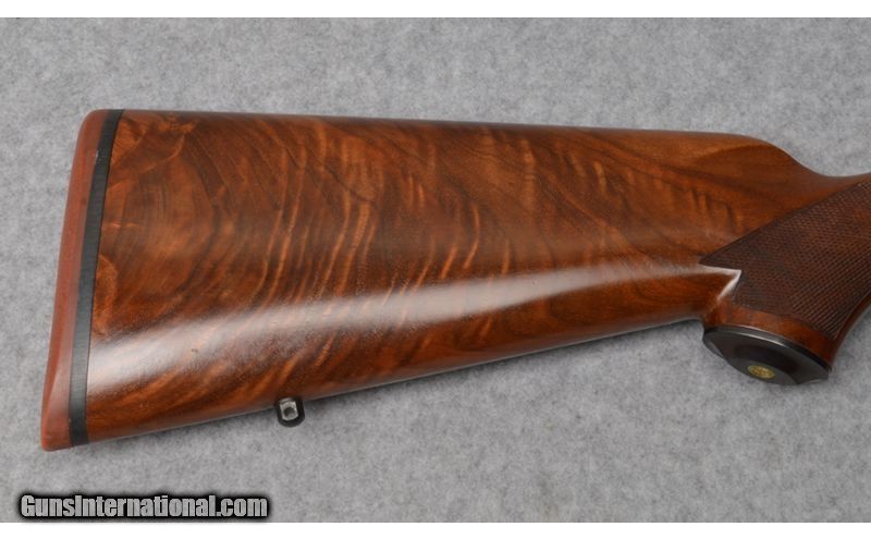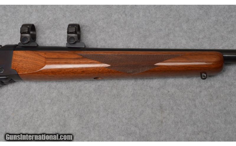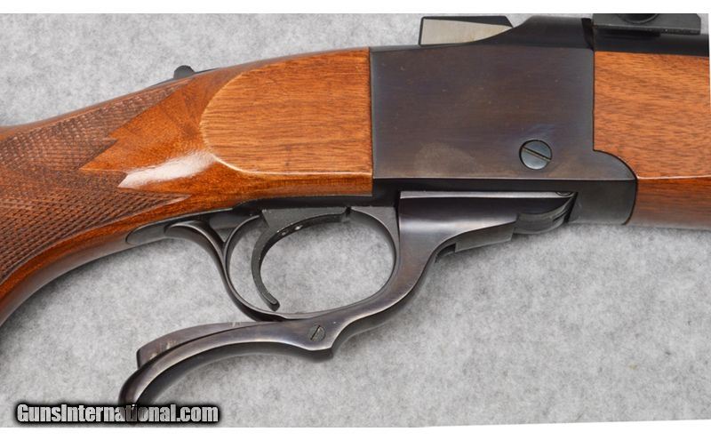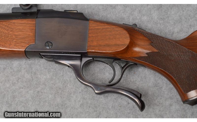 Description: This Ruger No. 1 in .22-250 Remington is an excellent example of quality and style.The beautifully marbled walnut buttstock is flawless as is the checkered forend. The blued 24" barrel is also excellent in condition and appearence. Bore condtion is b .22-250 Remington SOLD Metal Condition: Excellent Wood Condition: Excellent Barrels: Blued Round 24 Triggers: Factory Stock Dimensions: 13 3/4 LOP Fore End: Checkered Matching Walnut Butt Pad: Factory Rubber Sights: Scope Rings Item Location: West Chester, OH |