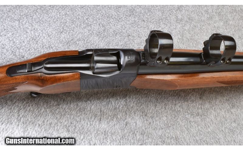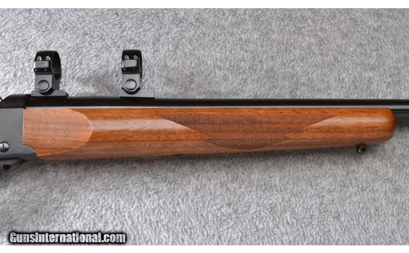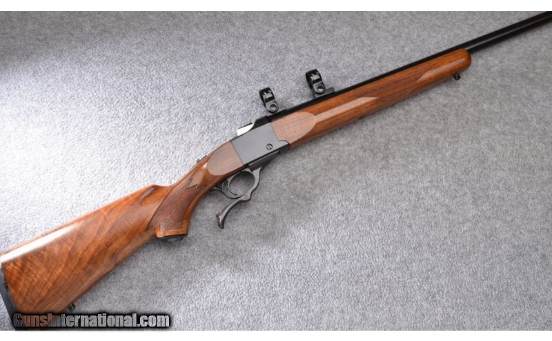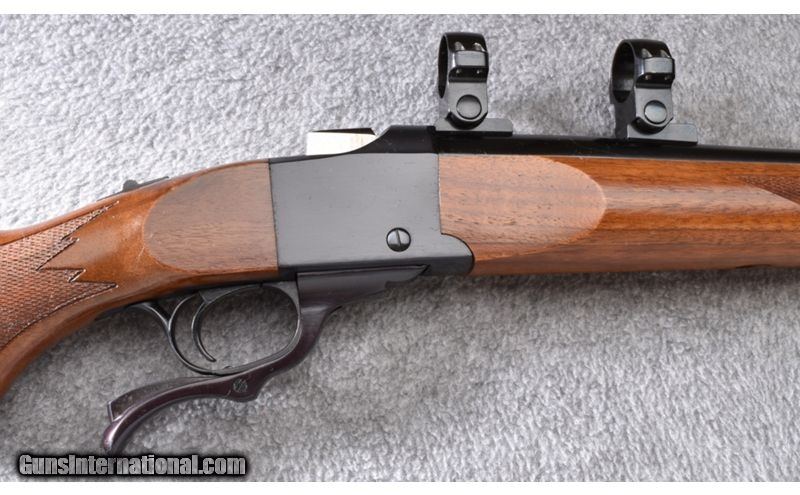 Description: This Ruger No. 1 was shipped from the factory in 1996. Gun remains in excellent overall condition showing little use or handling. Checkered walnut butt stock is subtly figured and remains excellent. Blue and bore are also excellent. Complete with scope rings attached and sling swivels studs. Falling block action with Farquharson lever. No box. Very nice. .220 Swift SOLD Metal Condition: Excellent Wood Condition: Excellent Bore Condition: Excellent Barrels: 26 Triggers: Factory Stock Dimensions: 13 3/4" LOP Fore End: Checkered Walnut Pistol Grip with Ruger Pistol Grip Cap - Checkered Walnut Forend Butt Pad: Ruger Black Rubber Butt Pad Weight: 9 lb Sights: None - Scope Rings Attached Item Location: Wheeling |