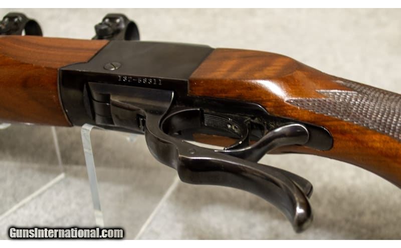 Description: Falling block action with curved Farquharson lever, .257 Roberts, 26 in. barrel, quarter rib with integral scope bases, supplied with rings and no sights, checkered stock and semi-beavertail forearm. Slight scuffs in the wood by the sling studs on both the forend and stock, as well as on the heel. .257 Roberts SOLD Chambers: .257 Roberts Metal Condition: Excellent Wood Condition: Good Bore Condition: Excellent Barrels: 26" Barrel Item Location: Greenville, SC |