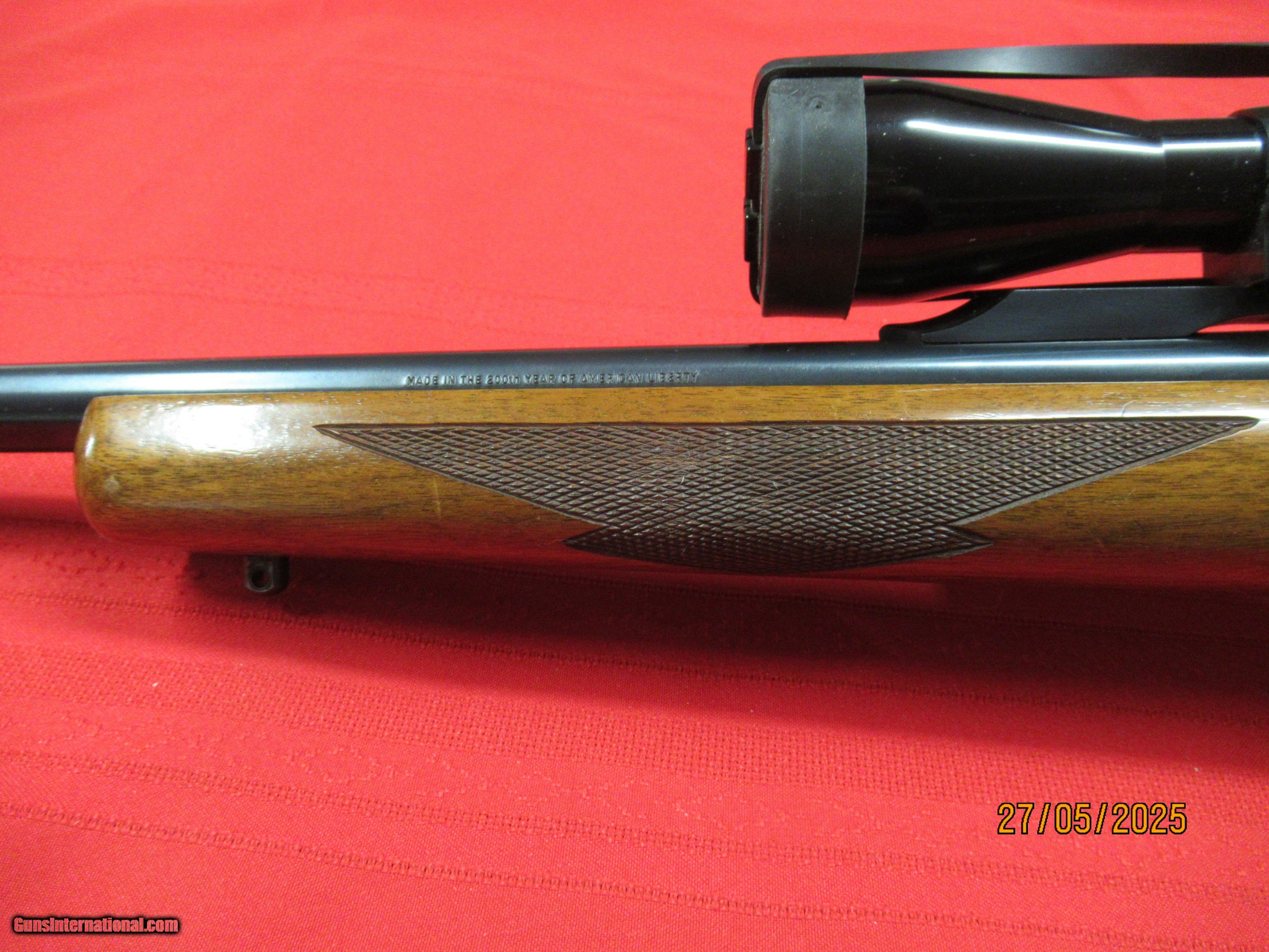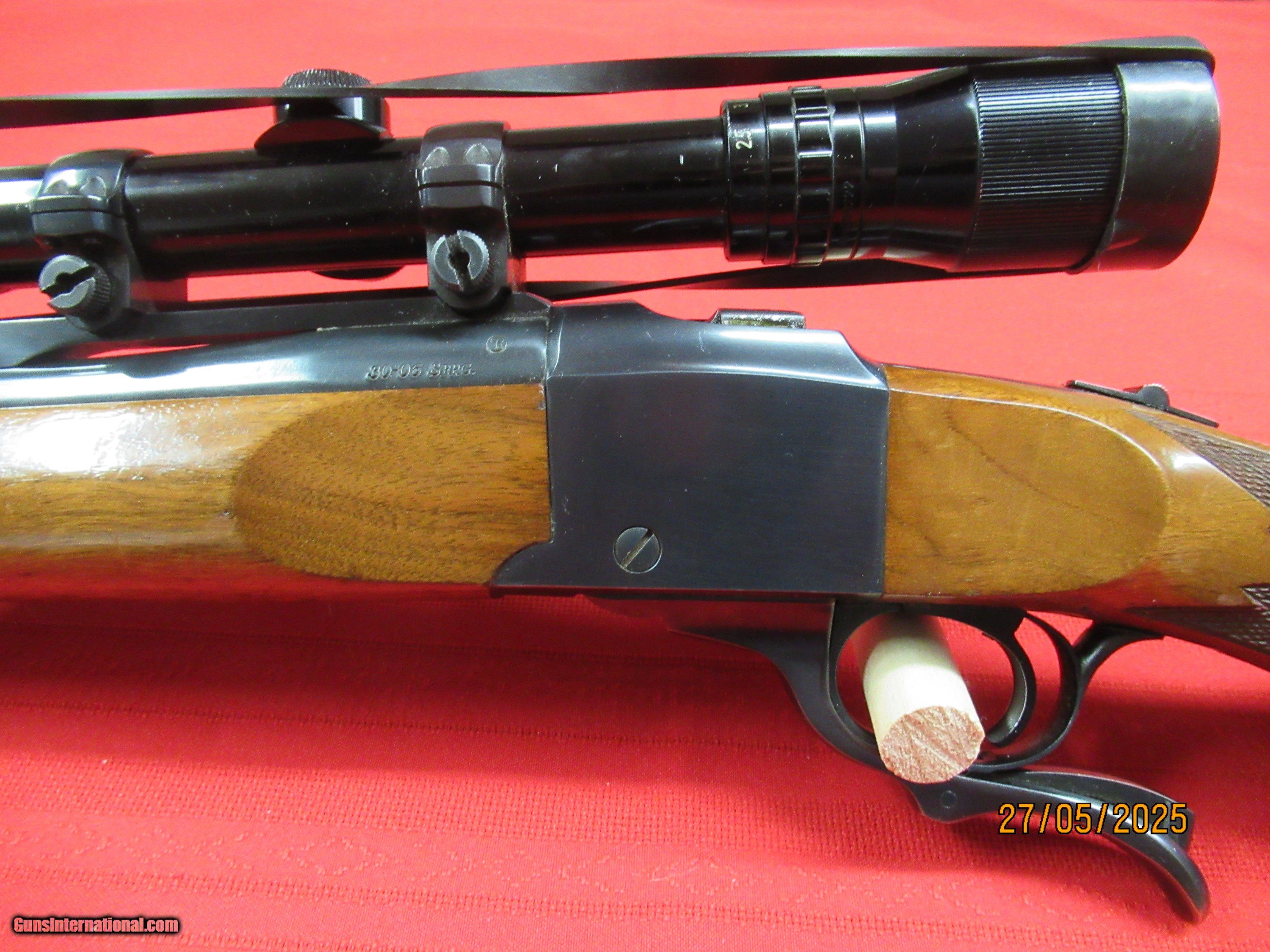 Description: This rifle is a 200th year of American Liberty model, withthe early red pad , mfg. date 1976. S.N.# 130-32271. The rifle has some faint handeling indentations on bottom of the forestock, and some bluing wear at the muzzel (see picture), bluing is other wise very good. The walnut butt stock has nice figuring, checkering is sharp, bore and riflleing shiny and sharp. This is a very nice solid rifle with no issues. The Baush & Lomb is a 2.5X8X50, SOLD Rifle Caliber: .30-06 Springfield Manufacturer: Ruger Model: No. 1 Serial Number: 130-32271 Barrel Length: 26 Condition: Very Good |