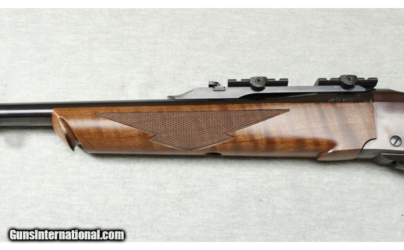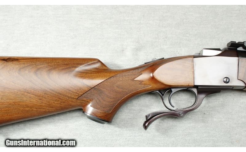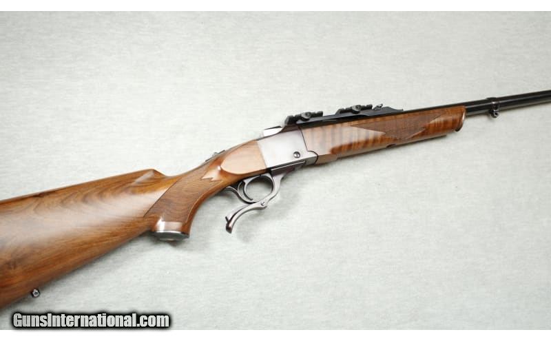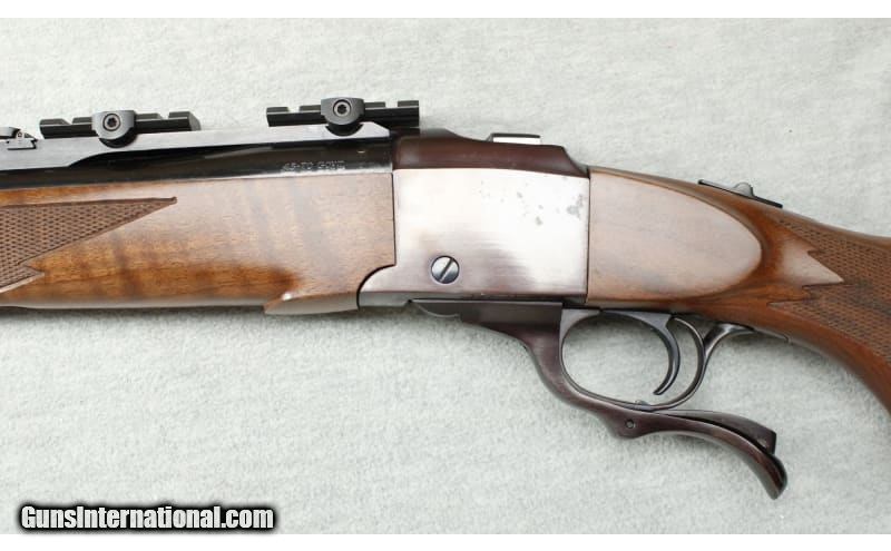 Description: Ruger No. 1 chambered in .45-70 Government. This rifle features a strong, simple, compact falling-block breech mechanism with artillery-style breechblock and under-lever is ideally suited for today's powerful cartridges. It has a sliding tang safety that provides instant security, visibility, and accessibility. a robust, sturdy, sculptured receiver forms a rigid support for barrel, stock and sliding breech block. The ejector mechanism provides maximum leverage at the point where the ejector engages the cartridge case and can be adjusted to provide extraction only. Integral scope mounts, machined directly on the solid steel quarter rib, provide a stable mounting surface for mounting scope rings. Cold hammer-forged barrel results in ultra-precise rifling that provides exceptional accuracy and longevity. Manufactured in 1996. No box. .45-70 Government SOLD Metal Condition: Excellent Wood Condition: Excellent Bore Condition: Bright Barrels: 22 Inches Triggers: Factory Stock Dimensions: LOP 13 3/4 Inches Fore End: Checkered walnut Butt Pad: Rubber pad Sights: Adjustable folding rear notch and front blade sights. Bases for scope mouting Item Location: La Vista, NE |