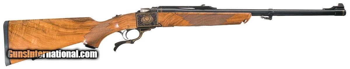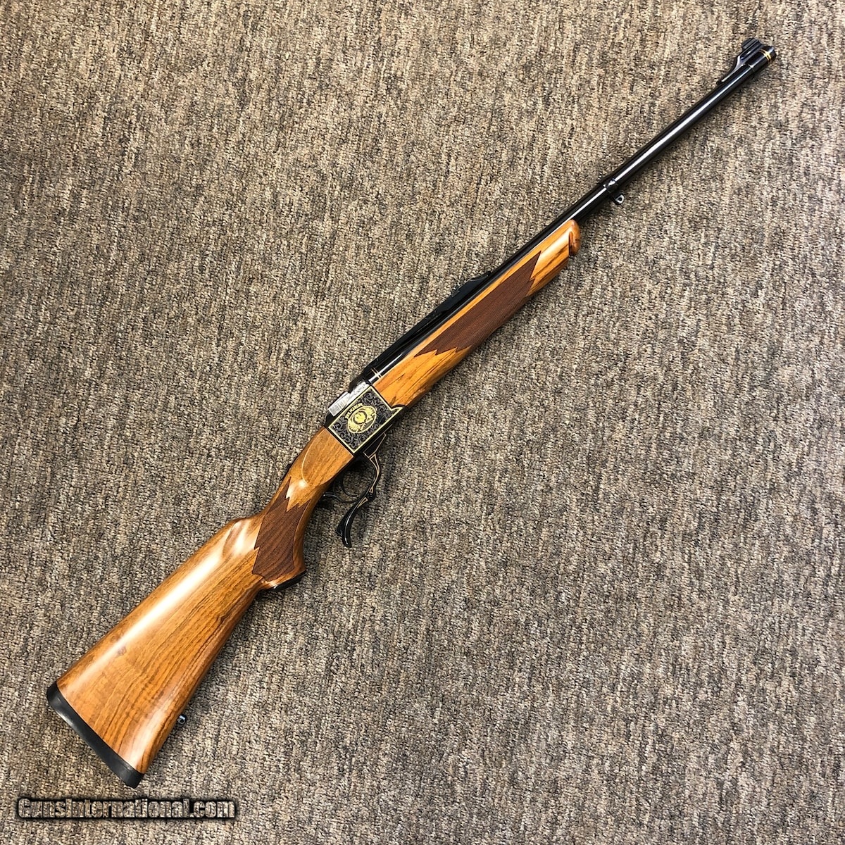 Description: Guns Listing ID: 304206 A single-shot, lever-action, centerfired rifle, the Ruger No.1 is built around a compact and simple, yet strong, falling-block breech mechanism with artillery-style breechblock. The sculpted receiver is robust and sturdy, offering rigid support for the barrel, stock, and sliding breech block, while the Ruger’s patented Scope Mounting System ensures scope bases never get loose. The sliding tang safety is easily accessible and visible. Available in a number of different calibers and barrel lengths, as well as with a black laminate or walnut stock, the No. 1 is also made with a sporting-style recoil pad, grip cap, and sling swivel studs. The 50th Anniversary edition features floral scroll and punch dot engraving on the receiver with a gold inlaid border on the sides gold Ruger commemorative logo and gold signature of William Ruger on the bottom. The sides of the lever are bordered with gold inlay and there are thin, wide gold bands around the muzzle and breech ends of the barrel. Ramped beaded blade front sight and adjustable single folding leaf rear sight mounted on the quarter rib. Alexander Henry-style forearm and Ruger recoil pad and sling swivel studs. SOLD Manufacturer: RUGER Model: NO. 1 50TH ANNIVERSARY Caliber Info: 45-70 GOVT Condition: used Barrels: 22 BARREL |