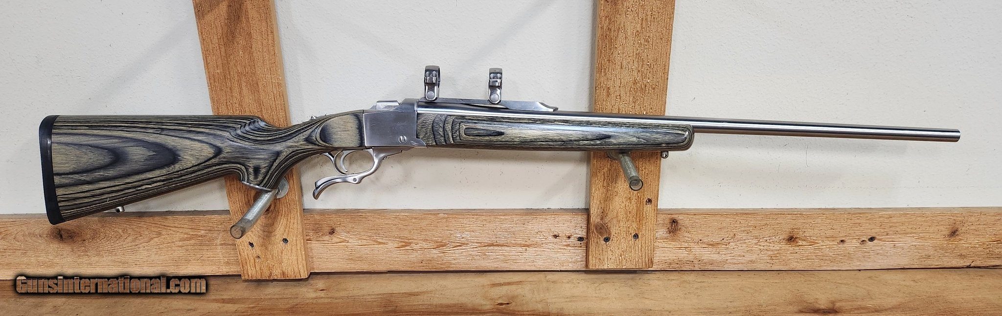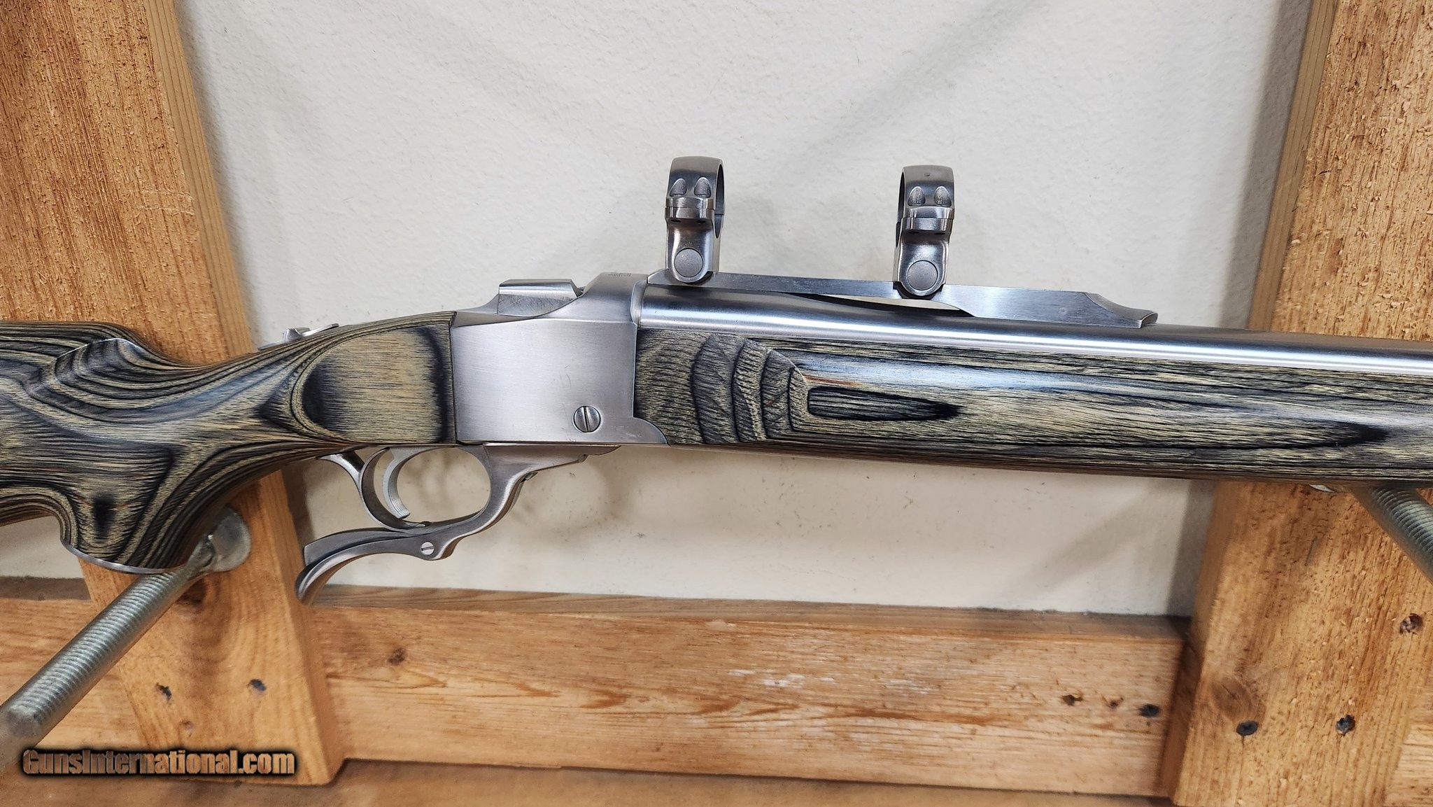 Description: Guns Listing ID: 574323 The Ruger No. 1 is a falling block single shot rifle that features a quarter rib with Ruger‚s integral scope ring mounts, gray laminate stock and stainless steel barrel and action. According to Ruger‚s , it was manufactured in 2006. Overall this rifle is in great condition and doesn‚t appear to have been fired/fielded much. It does have some minor imperfections from handling in the stock and metal finish. The bore and rifling are in great condition. It comes as pictured with the factory 1\" scope rings. No factory box. SOLD Manufacturer: RUGER Model: NO. 1 Caliber Info: 7MM REM MAG Condition: Used - Non-Certified Barrels: 26" BARREL Action: SINGLE SHOT Finish: satin stainless |