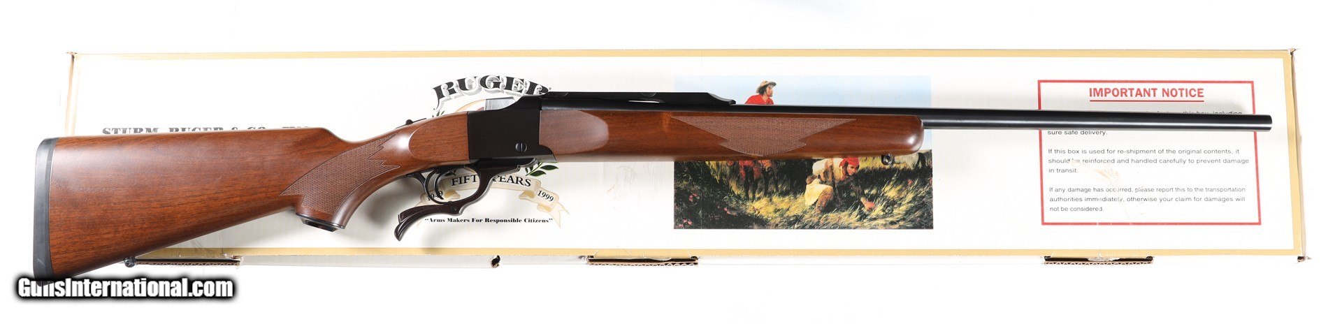 Description: Excellent plus to like new with factory box numbered to gun with paperwork, scope rings, and sling swivels. The Ruger No. 1 is one of the most popular falling block rifles in existence. This rifle features a Farquharson-style hammerless design with internal functions, an American walnut stock and forend, blued barrel and a sliding tang safety. Just behind the trigger guard is a lever which engages the action. The action has been shortened and is one of the primary advantages this rifle has over repeating style designs. Firing a highly sought-after .30-06 caliber round from a 26" barrel, this modernized falling block design combines the best of today's precision with a touch nostalgia, providing the best of both worlds. • Free Shipping, No Credit Card Fees. • Lay-a-way available for this firearm. • 1/3 Down, a 1/3 in 30 Days 1/3 in 60 Days. SOLD Manufacturer: Ruger Model: No. 1 Serial Number: 133-97741 Barrel Length: 26 |