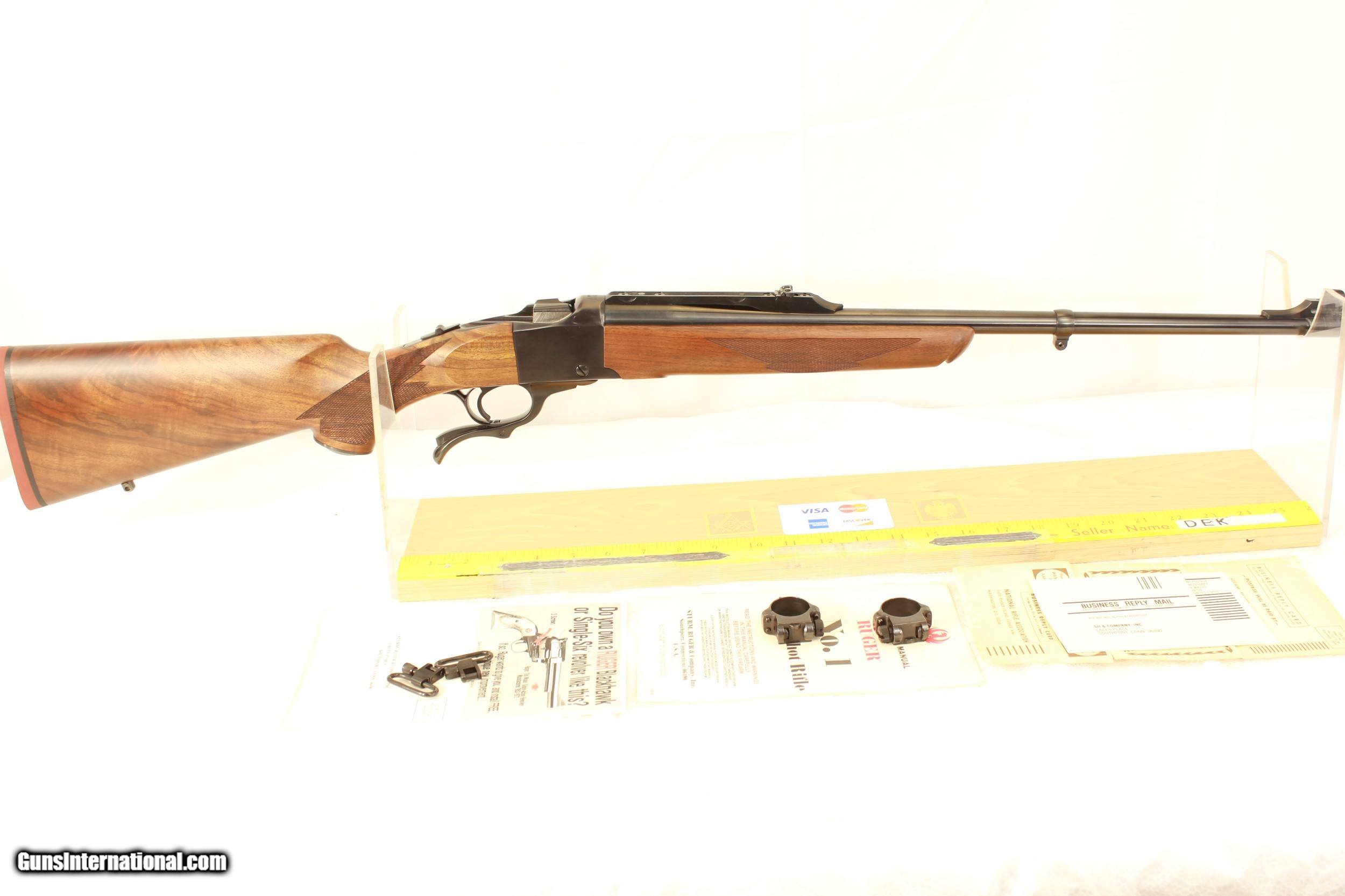 Description: This is the holy Grail of Ruger No,1s in 22 Hornet in the original box serial numbered to the gun with the scope rings and sling swivels, and paperwork. The seller said it has never been fired and from all appearances it looks the part. As you can see, it has outstanding figured wood. Out of the many No. 1s I have handled and seen this is the first in 22 Hornet. The gun was made in 1988. I can not see any problems with this gun. but please use the ZOOM to make your evaluation of this fine piece. Shipping via Priority Mail is $60.00 SOLD |