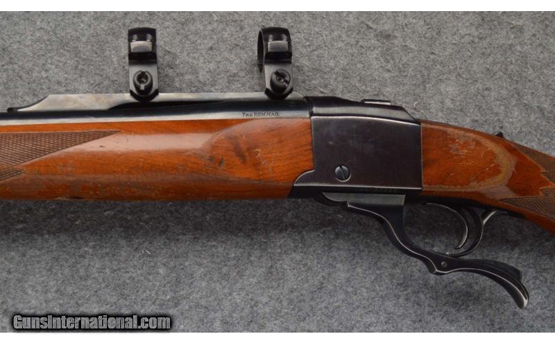 Description: Bicentennial edition barrel and receiver finished with rich blue patina. The action is based on Gibbs Farquharson style that was patented in Scotland in 1872. SOLD Manufacturer: 1796 Caliber Info: 7MM Remington Magnum Chambers: N/A Metal Condition: Scratches and blue wearing Wood Condition: Scratches and abraded finish Bore Condition: Bright and Sharp strong rifling Barrels: 26" rich blue patina finish Triggers: Farquharson style internal hammer falling block action Stock: Checkered walnut with satin patina finish, Ruger pistol cap Stock Dimensions: LOP 13 1/2 Fore End: Checkered walnut semi beavertail in satin patina finish Butt Pad: Ruger rubber recoil pad Weight: 8 lbs 0 oz Sights: Quarter rib integrated scope base and rings Chokes: N/A Extras: None Item Location: Sidney, NE |