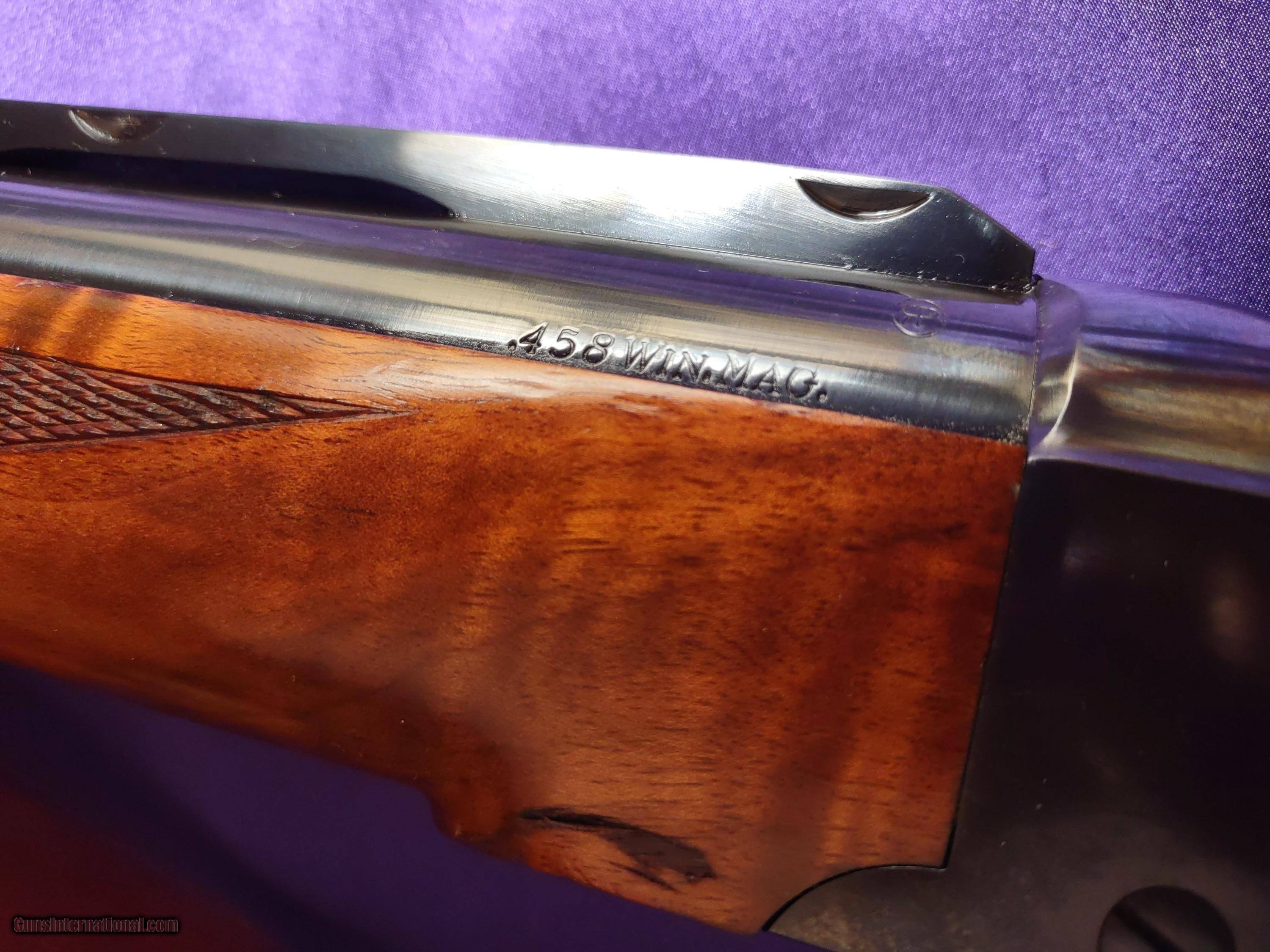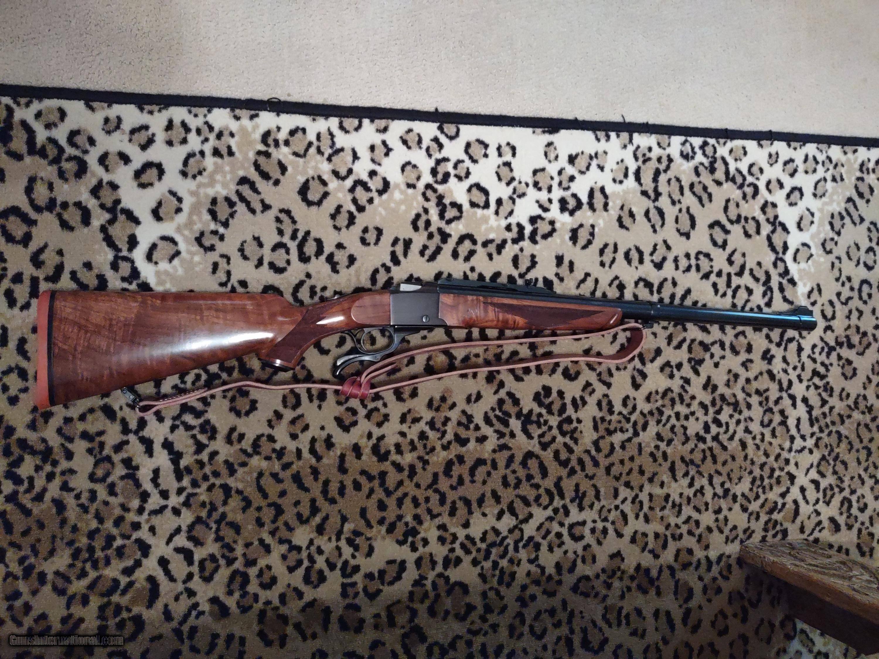 Description: RUGER No. 1 Tropical .458 Winchester Magnum dangerous game single shot rifle made in 1976 with serial number 130-12788, gorgeous select walnut stock in 98% original condition, pristine factory original bluing, original red recoil pad, 24" heavy barrel with bright glossy bore, open safari sights and Montana 1 1/4" bridle leather sling which is quickly adjusted without noise or tools. This masterpiece has never had a scope on it so there are no scratches on the receiver. This is a real treasure built to last a lifetime. The price is $2200 including UPS shipping to the FFL dealer near you. Call or text me at 318-780-4242 if you are interested. SOLD Manufacturer: Ruger Model: No. 1 Tropical Serial Number: 130-12788 Barrel Length: 24 Bore: bright and glossy Chambers: flawless Ejectors: Manual Condition: Excellent Metal Condition: Excellent Wood Condition: Excellent Bore Condition: Perfect, glossy Barrels: Single Barrel Type: rifle Action: Lever Triggers: Single Butt Pad: Factory original LOP: 14 Finish: Blu Sights: open, adjustable Manufacture Date: 1976 Engraving: None Case: Quality soft zipper carry case Item Location: Shreveport, Louisiana |