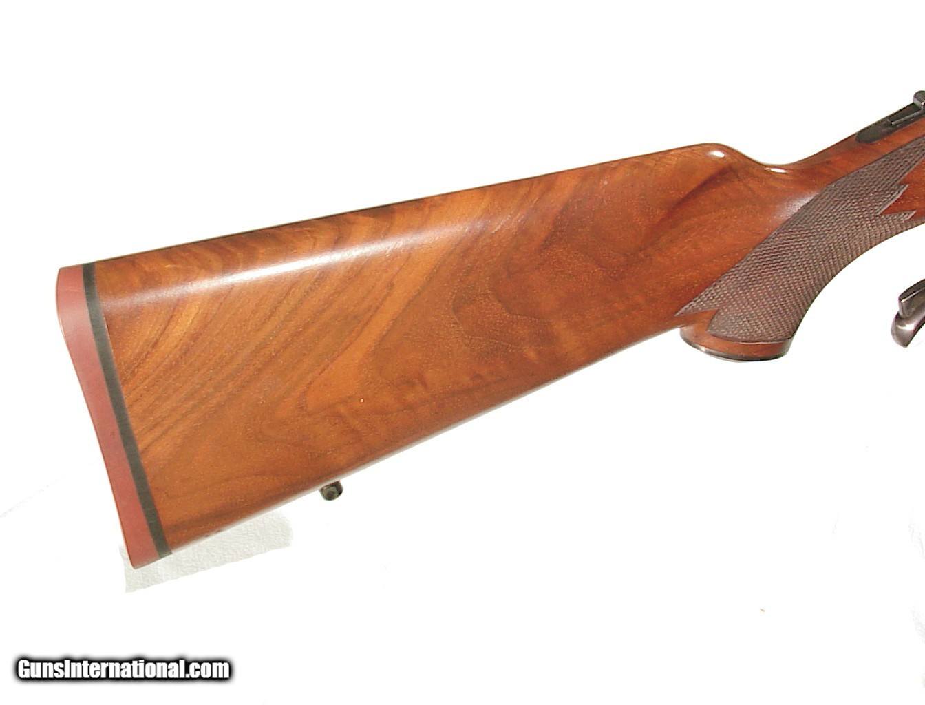 Description: .375 H&H caliber, 24" heavy barrel with folding rear sight mounted on a quarter rib. Falling block single shot action with top tang safety. Alexander Henry type checkered forend and pistol grip buttstock ending with a factory hard rubber pad. LOP: 13 3/4". In near new unused original condition with the blue at 99% plus, and beautiful burl wood with minty checkering. Mint bore. Appears unused. 1978 mfg. SOLD |